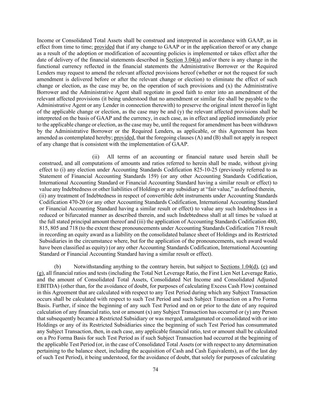 74 Income or Consolidated Total Assets shall be construed and interpreted in accordance with GAAP, as in effect from time to time; provided that if any change to GAAP or in the application thereof or any change as a result of the adoption or modification of accounting policies is implemented or takes effect after the date of delivery of the financial statements described in Section 3.04(a) and/or there is any change in the functional currency reflected in the financial statements the Administrative Borrower or the Required Lenders may request to amend the relevant affected provisions hereof (whether or not the request for such amendment is delivered before or after the relevant change or election) to eliminate the effect of such change or election, as the case may be, on the operation of such provisions and (x) the Administrative Borrower and the Administrative Agent shall negotiate in good faith to enter into an amendment of the relevant affected provisions (it being understood that no amendment or similar fee shall be payable to the Administrative Agent or any Lender in connection therewith) to preserve the original intent thereof in light of the applicable change or election, as the case may be and (y) the relevant affected provisions shall be interpreted on the basis of GAAP and the currency, in each case, as in effect and applied immediately prior to the applicable change or election, as the case may be, until the request for amendment has been withdrawn by the Administrative Borrower or the Required Lenders, as applicable, or this Agreement has been amended as contemplated hereby; provided, that the foregoing clauses (A) and (B) shall not apply in respect of any change that is consistent with the implementation of GAAP. (ii) All terms of an accounting or financial nature used herein shall be construed, and all computations of amounts and ratios referred to herein shall be made, without giving effect to (i) any election under Accounting Standards Codification 825-10-25 (previously referred to as Statement of Financial Accounting Standards 159) (or any other Accounting Standards Codification, International Accounting Standard or Financial Accounting Standard having a similar result or effect) to value any Indebtedness or other liabilities of Holdings or any subsidiary at “fair value,” as defined therein, (ii) any treatment of Indebtedness in respect of convertible debt instruments under Accounting Standards Codification 470-20 (or any other Accounting Standards Codification, International Accounting Standard or Financial Accounting Standard having a similar result or effect) to value any such Indebtedness in a reduced or bifurcated manner as described therein, and such Indebtedness shall at all times be valued at the full stated principal amount thereof and (iii) the application of Accounting Standards Codification 480, 815, 805 and 718 (to the extent these pronouncements under Accounting Standards Codification 718 result in recording an equity award as a liability on the consolidated balance sheet of Holdings and its Restricted Subsidiaries in the circumstance where, but for the application of the pronouncements, such award would have been classified as equity) (or any other Accounting Standards Codification, International Accounting Standard or Financial Accounting Standard having a similar result or effect). (b) Notwithstanding anything to the contrary herein, but subject to Sections 1.04(d), (e) and (g), all financial ratios and tests (including the Total Net Leverage Ratio, the First Lien Net Leverage Ratio, and the amount of Consolidated Total Assets, Consolidated Net Income and Consolidated Adjusted EBITDA) (other than, for the avoidance of doubt, for purposes of calculating Excess Cash Flow) contained in this Agreement that are calculated with respect to any Test Period during which any Subject Transaction occurs shall be calculated with respect to such Test Period and such Subject Transaction on a Pro Forma Basis. Further, if since the beginning of any such Test Period and on or prior to the date of any required calculation of any financial ratio, test or amount (x) any Subject Transaction has occurred or (y) any Person that subsequently became a Restricted Subsidiary or was merged, amalgamated or consolidated with or into Holdings or any of its Restricted Subsidiaries since the beginning of such Test Period has consummated any Subject Transaction, then, in each case, any applicable financial ratio, test or amount shall be calculated on a Pro Forma Basis for such Test Period as if such Subject Transaction had occurred at the beginning of the applicable Test Period (or, in the case of Consolidated Total Assets (or with respect to any determination pertaining to the balance sheet, including the acquisition of Cash and Cash Equivalents), as of the last day of such Test Period), it being understood, for the avoidance of doubt, that solely for purposes of calculating