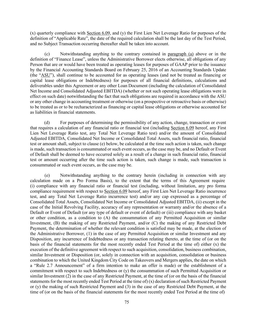 75 (x) quarterly compliance with Section 6.09, and (y) the First Lien Net Leverage Ratio for purposes of the definition of “Applicable Rate”, the date of the required calculation shall be the last day of the Test Period, and no Subject Transaction occurring thereafter shall be taken into account. (c) Notwithstanding anything to the contrary contained in paragraph (a) above or in the definition of “Finance Lease”, unless the Administrative Borrower elects otherwise, all obligations of any Person that are or would have been treated as operating leases for purposes of GAAP prior to the issuance by the Financial Accounting Standards Board on February 25, 2016 of an Accounting Standards Update (the “ASU”), shall continue to be accounted for as operating leases (and not be treated as financing or capital lease obligations or Indebtedness) for purposes of all financial definitions, calculations and deliverables under this Agreement or any other Loan Document (including the calculation of Consolidated Net Income and Consolidated Adjusted EBITDA) (whether or not such operating lease obligations were in effect on such date) notwithstanding the fact that such obligations are required in accordance with the ASU or any other change in accounting treatment or otherwise (on a prospective or retroactive basis or otherwise) to be treated as or to be recharacterized as financing or capital lease obligations or otherwise accounted for as liabilities in financial statements. (d) For purposes of determining the permissibility of any action, change, transaction or event that requires a calculation of any financial ratio or financial test (including Section 6.09 hereof, any First Lien Net Leverage Ratio test, any Total Net Leverage Ratio test) and/or the amount of Consolidated Adjusted EBITDA, Consolidated Net Income or Consolidated Total Assets, such financial ratio, financial test or amount shall, subject to clause (e) below, be calculated at the time such action is taken, such change is made, such transaction is consummated or such event occurs, as the case may be, and no Default or Event of Default shall be deemed to have occurred solely as a result of a change in such financial ratio, financial test or amount occurring after the time such action is taken, such change is made, such transaction is consummated or such event occurs, as the case may be. (e) Notwithstanding anything to the contrary herein (including in connection with any calculation made on a Pro Forma Basis), to the extent that the terms of this Agreement require (i) compliance with any financial ratio or financial test (including, without limitation, any pro forma compliance requirement with respect to Section 6.09 hereof, any First Lien Net Leverage Ratio incurrence test, and any Total Net Leverage Ratio incurrence test) and/or any cap expressed as a percentage of Consolidated Total Assets, Consolidated Net Income or Consolidated Adjusted EBITDA, (ii) except in the case of the Initial Revolving Facility, accuracy of any representation or warranty and/or the absence of a Default or Event of Default (or any type of default or event of default) or (iii) compliance with any basket or other condition, as a condition to (A) the consummation of any Permitted Acquisition or similar Investment, (B) the making of any Restricted Payment, and/or (C) the making of any Restricted Debt Payment, the determination of whether the relevant condition is satisfied may be made, at the election of the Administrative Borrower, (1) in the case of any Permitted Acquisition or similar Investment and any Disposition, any incurrence of Indebtedness or any transaction relating thereto, at the time of (or on the basis of the financial statements for the most recently ended Test Period at the time of) either (x) the execution of the definitive agreement with respect to such acquisition, consolidation, business combination, similar Investment or Disposition (or, solely in connection with an acquisition, consolidation or business combination to which the United Kingdom City Code on Takeovers and Mergers applies, the date on which a “Rule 2.7 Announcement” of a firm intention to make an offer is made) or the establishment of a commitment with respect to such Indebtedness or (y) the consummation of such Permitted Acquisition or similar Investment (2) in the case of any Restricted Payment, at the time of (or on the basis of the financial statements for the most recently ended Test Period at the time of) (x) declaration of such Restricted Payment or (y) the making of such Restricted Payment and (3) in the case of any Restricted Debt Payment, at the time of (or on the basis of the financial statements for the most recently ended Test Period at the time of)