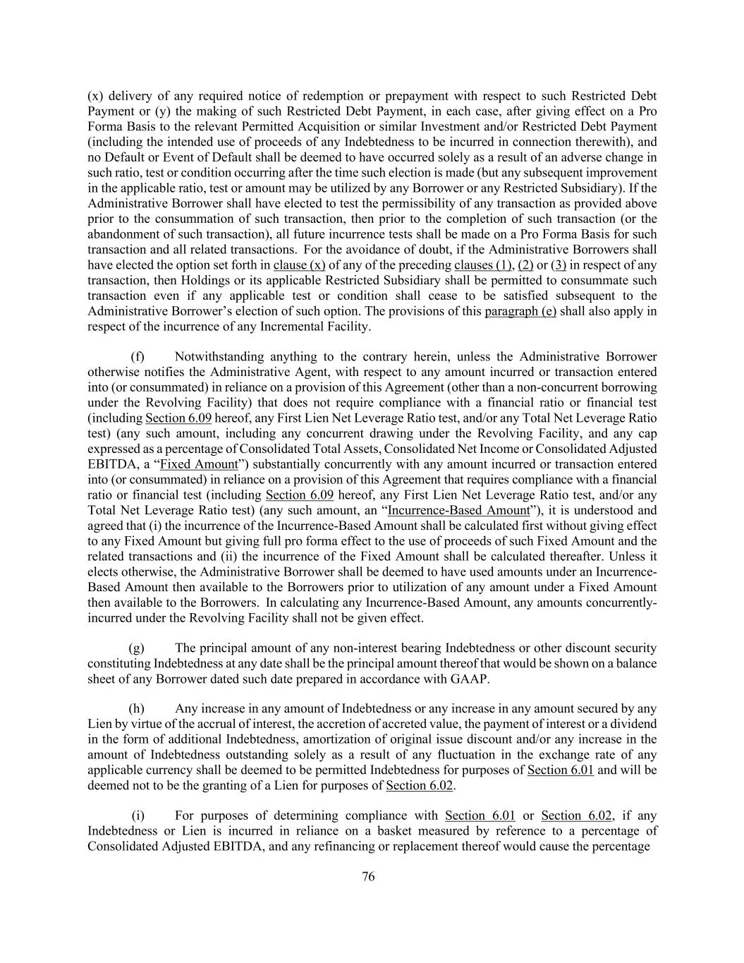 76 (x) delivery of any required notice of redemption or prepayment with respect to such Restricted Debt Payment or (y) the making of such Restricted Debt Payment, in each case, after giving effect on a Pro Forma Basis to the relevant Permitted Acquisition or similar Investment and/or Restricted Debt Payment (including the intended use of proceeds of any Indebtedness to be incurred in connection therewith), and no Default or Event of Default shall be deemed to have occurred solely as a result of an adverse change in such ratio, test or condition occurring after the time such election is made (but any subsequent improvement in the applicable ratio, test or amount may be utilized by any Borrower or any Restricted Subsidiary). If the Administrative Borrower shall have elected to test the permissibility of any transaction as provided above prior to the consummation of such transaction, then prior to the completion of such transaction (or the abandonment of such transaction), all future incurrence tests shall be made on a Pro Forma Basis for such transaction and all related transactions. For the avoidance of doubt, if the Administrative Borrowers shall have elected the option set forth in clause (x) of any of the preceding clauses (1), (2) or (3) in respect of any transaction, then Holdings or its applicable Restricted Subsidiary shall be permitted to consummate such transaction even if any applicable test or condition shall cease to be satisfied subsequent to the Administrative Borrower’s election of such option. The provisions of this paragraph (e) shall also apply in respect of the incurrence of any Incremental Facility. (f) Notwithstanding anything to the contrary herein, unless the Administrative Borrower otherwise notifies the Administrative Agent, with respect to any amount incurred or transaction entered into (or consummated) in reliance on a provision of this Agreement (other than a non-concurrent borrowing under the Revolving Facility) that does not require compliance with a financial ratio or financial test (including Section 6.09 hereof, any First Lien Net Leverage Ratio test, and/or any Total Net Leverage Ratio test) (any such amount, including any concurrent drawing under the Revolving Facility, and any cap expressed as a percentage of Consolidated Total Assets, Consolidated Net Income or Consolidated Adjusted EBITDA, a “Fixed Amount”) substantially concurrently with any amount incurred or transaction entered into (or consummated) in reliance on a provision of this Agreement that requires compliance with a financial ratio or financial test (including Section 6.09 hereof, any First Lien Net Leverage Ratio test, and/or any Total Net Leverage Ratio test) (any such amount, an “Incurrence-Based Amount”), it is understood and agreed that (i) the incurrence of the Incurrence-Based Amount shall be calculated first without giving effect to any Fixed Amount but giving full pro forma effect to the use of proceeds of such Fixed Amount and the related transactions and (ii) the incurrence of the Fixed Amount shall be calculated thereafter. Unless it elects otherwise, the Administrative Borrower shall be deemed to have used amounts under an Incurrence- Based Amount then available to the Borrowers prior to utilization of any amount under a Fixed Amount then available to the Borrowers. In calculating any Incurrence-Based Amount, any amounts concurrently- incurred under the Revolving Facility shall not be given effect. (g) The principal amount of any non-interest bearing Indebtedness or other discount security constituting Indebtedness at any date shall be the principal amount thereof that would be shown on a balance sheet of any Borrower dated such date prepared in accordance with GAAP. (h) Any increase in any amount of Indebtedness or any increase in any amount secured by any Lien by virtue of the accrual of interest, the accretion of accreted value, the payment of interest or a dividend in the form of additional Indebtedness, amortization of original issue discount and/or any increase in the amount of Indebtedness outstanding solely as a result of any fluctuation in the exchange rate of any applicable currency shall be deemed to be permitted Indebtedness for purposes of Section 6.01 and will be deemed not to be the granting of a Lien for purposes of Section 6.02. (i) For purposes of determining compliance with Section 6.01 or Section 6.02, if any Indebtedness or Lien is incurred in reliance on a basket measured by reference to a percentage of Consolidated Adjusted EBITDA, and any refinancing or replacement thereof would cause the percentage