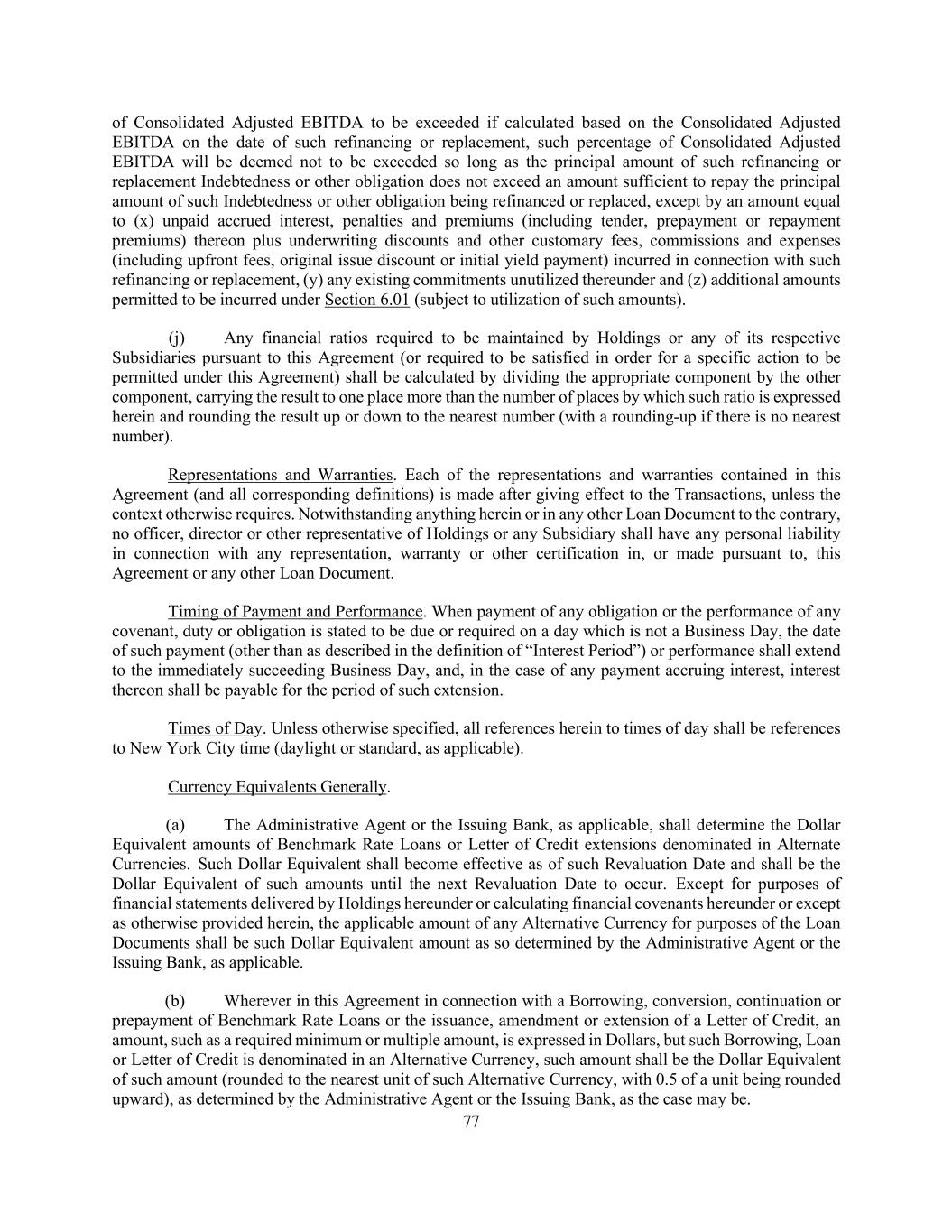 77 of Consolidated Adjusted EBITDA to be exceeded if calculated based on the Consolidated Adjusted EBITDA on the date of such refinancing or replacement, such percentage of Consolidated Adjusted EBITDA will be deemed not to be exceeded so long as the principal amount of such refinancing or replacement Indebtedness or other obligation does not exceed an amount sufficient to repay the principal amount of such Indebtedness or other obligation being refinanced or replaced, except by an amount equal to (x) unpaid accrued interest, penalties and premiums (including tender, prepayment or repayment premiums) thereon plus underwriting discounts and other customary fees, commissions and expenses (including upfront fees, original issue discount or initial yield payment) incurred in connection with such refinancing or replacement, (y) any existing commitments unutilized thereunder and (z) additional amounts permitted to be incurred under Section 6.01 (subject to utilization of such amounts). (j) Any financial ratios required to be maintained by Holdings or any of its respective Subsidiaries pursuant to this Agreement (or required to be satisfied in order for a specific action to be permitted under this Agreement) shall be calculated by dividing the appropriate component by the other component, carrying the result to one place more than the number of places by which such ratio is expressed herein and rounding the result up or down to the nearest number (with a rounding-up if there is no nearest number). Representations and Warranties. Each of the representations and warranties contained in this Agreement (and all corresponding definitions) is made after giving effect to the Transactions, unless the context otherwise requires. Notwithstanding anything herein or in any other Loan Document to the contrary, no officer, director or other representative of Holdings or any Subsidiary shall have any personal liability in connection with any representation, warranty or other certification in, or made pursuant to, this Agreement or any other Loan Document. Timing of Payment and Performance. When payment of any obligation or the performance of any covenant, duty or obligation is stated to be due or required on a day which is not a Business Day, the date of such payment (other than as described in the definition of “Interest Period”) or performance shall extend to the immediately succeeding Business Day, and, in the case of any payment accruing interest, interest thereon shall be payable for the period of such extension. Times of Day. Unless otherwise specified, all references herein to times of day shall be references to New York City time (daylight or standard, as applicable). Currency Equivalents Generally. (a) The Administrative Agent or the Issuing Bank, as applicable, shall determine the Dollar Equivalent amounts of Benchmark Rate Loans or Letter of Credit extensions denominated in Alternate Currencies. Such Dollar Equivalent shall become effective as of such Revaluation Date and shall be the Dollar Equivalent of such amounts until the next Revaluation Date to occur. Except for purposes of financial statements delivered by Holdings hereunder or calculating financial covenants hereunder or except as otherwise provided herein, the applicable amount of any Alternative Currency for purposes of the Loan Documents shall be such Dollar Equivalent amount as so determined by the Administrative Agent or the Issuing Bank, as applicable. (b) Wherever in this Agreement in connection with a Borrowing, conversion, continuation or prepayment of Benchmark Rate Loans or the issuance, amendment or extension of a Letter of Credit, an amount, such as a required minimum or multiple amount, is expressed in Dollars, but such Borrowing, Loan or Letter of Credit is denominated in an Alternative Currency, such amount shall be the Dollar Equivalent of such amount (rounded to the nearest unit of such Alternative Currency, with 0.5 of a unit being rounded upward), as determined by the Administrative Agent or the Issuing Bank, as the case may be.