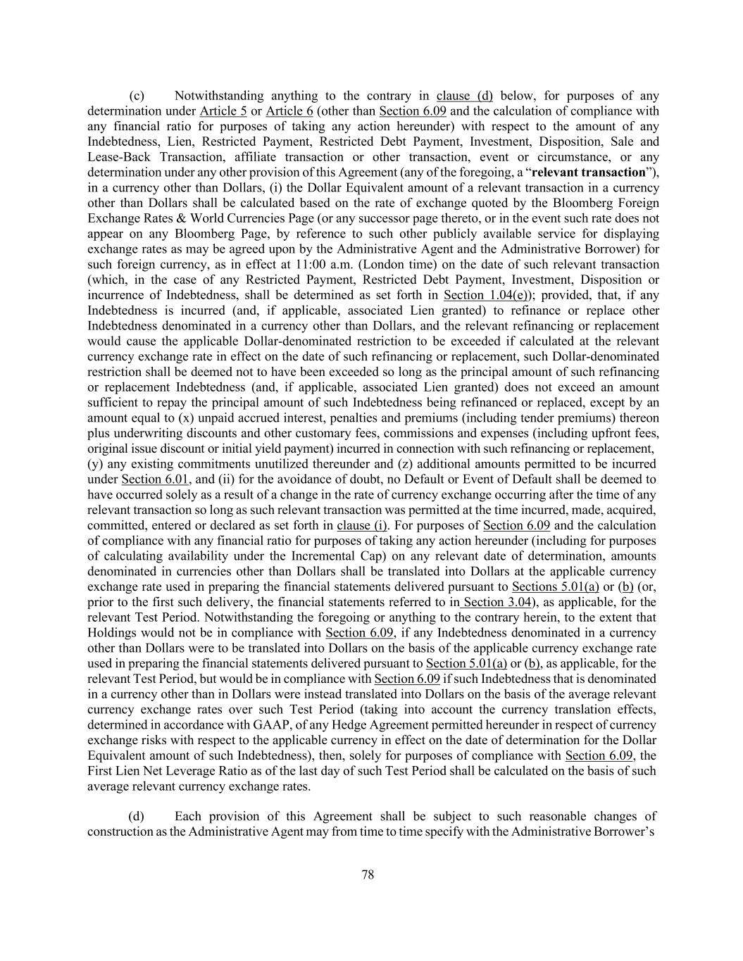 78 (c) Notwithstanding anything to the contrary in clause (d) below, for purposes of any determination under Article 5 or Article 6 (other than Section 6.09 and the calculation of compliance with any financial ratio for purposes of taking any action hereunder) with respect to the amount of any Indebtedness, Lien, Restricted Payment, Restricted Debt Payment, Investment, Disposition, Sale and Lease-Back Transaction, affiliate transaction or other transaction, event or circumstance, or any determination under any other provision of this Agreement (any of the foregoing, a “relevant transaction”), in a currency other than Dollars, (i) the Dollar Equivalent amount of a relevant transaction in a currency other than Dollars shall be calculated based on the rate of exchange quoted by the Bloomberg Foreign Exchange Rates & World Currencies Page (or any successor page thereto, or in the event such rate does not appear on any Bloomberg Page, by reference to such other publicly available service for displaying exchange rates as may be agreed upon by the Administrative Agent and the Administrative Borrower) for such foreign currency, as in effect at 11:00 a.m. (London time) on the date of such relevant transaction (which, in the case of any Restricted Payment, Restricted Debt Payment, Investment, Disposition or incurrence of Indebtedness, shall be determined as set forth in Section 1.04(e)); provided, that, if any Indebtedness is incurred (and, if applicable, associated Lien granted) to refinance or replace other Indebtedness denominated in a currency other than Dollars, and the relevant refinancing or replacement would cause the applicable Dollar-denominated restriction to be exceeded if calculated at the relevant currency exchange rate in effect on the date of such refinancing or replacement, such Dollar-denominated restriction shall be deemed not to have been exceeded so long as the principal amount of such refinancing or replacement Indebtedness (and, if applicable, associated Lien granted) does not exceed an amount sufficient to repay the principal amount of such Indebtedness being refinanced or replaced, except by an amount equal to (x) unpaid accrued interest, penalties and premiums (including tender premiums) thereon plus underwriting discounts and other customary fees, commissions and expenses (including upfront fees, original issue discount or initial yield payment) incurred in connection with such refinancing or replacement, (y) any existing commitments unutilized thereunder and (z) additional amounts permitted to be incurred under Section 6.01, and (ii) for the avoidance of doubt, no Default or Event of Default shall be deemed to have occurred solely as a result of a change in the rate of currency exchange occurring after the time of any relevant transaction so long as such relevant transaction was permitted at the time incurred, made, acquired, committed, entered or declared as set forth in clause (i). For purposes of Section 6.09 and the calculation of compliance with any financial ratio for purposes of taking any action hereunder (including for purposes of calculating availability under the Incremental Cap) on any relevant date of determination, amounts denominated in currencies other than Dollars shall be translated into Dollars at the applicable currency exchange rate used in preparing the financial statements delivered pursuant to Sections 5.01(a) or (b) (or, prior to the first such delivery, the financial statements referred to in Section 3.04), as applicable, for the relevant Test Period. Notwithstanding the foregoing or anything to the contrary herein, to the extent that Holdings would not be in compliance with Section 6.09, if any Indebtedness denominated in a currency other than Dollars were to be translated into Dollars on the basis of the applicable currency exchange rate used in preparing the financial statements delivered pursuant to Section 5.01(a) or (b), as applicable, for the relevant Test Period, but would be in compliance with Section 6.09 if such Indebtedness that is denominated in a currency other than in Dollars were instead translated into Dollars on the basis of the average relevant currency exchange rates over such Test Period (taking into account the currency translation effects, determined in accordance with GAAP, of any Hedge Agreement permitted hereunder in respect of currency exchange risks with respect to the applicable currency in effect on the date of determination for the Dollar Equivalent amount of such Indebtedness), then, solely for purposes of compliance with Section 6.09, the First Lien Net Leverage Ratio as of the last day of such Test Period shall be calculated on the basis of such average relevant currency exchange rates. (d) Each provision of this Agreement shall be subject to such reasonable changes of construction as the Administrative Agent may from time to time specify with the Administrative Borrower’s