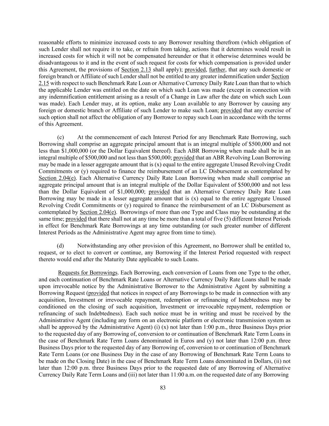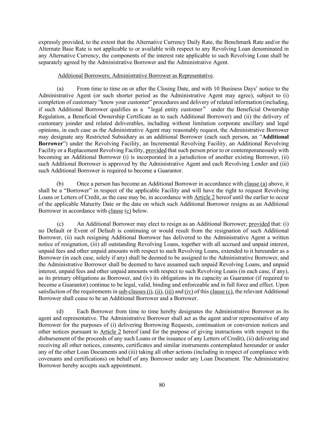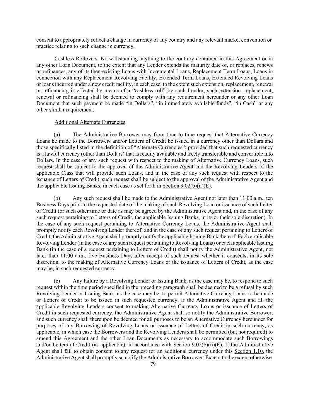 79 consent to appropriately reflect a change in currency of any country and any relevant market convention or practice relating to such change in currency. Cashless Rollovers. Notwithstanding anything to the contrary contained in this Agreement or in any other Loan Document, to the extent that any Lender extends the maturity date of, or replaces, renews or refinances, any of its then-existing Loans with Incremental Loans, Replacement Term Loans, Loans in connection with any Replacement Revolving Facility, Extended Term Loans, Extended Revolving Loans or loans incurred under a new credit facility, in each case, to the extent such extension, replacement, renewal or refinancing is effected by means of a “cashless roll” by such Lender, such extension, replacement, renewal or refinancing shall be deemed to comply with any requirement hereunder or any other Loan Document that such payment be made “in Dollars”, “in immediately available funds”, “in Cash” or any other similar requirement. Additional Alternate Currencies. (a) The Administrative Borrower may from time to time request that Alternative Currency Loans be made to the Borrowers and/or Letters of Credit be issued in a currency other than Dollars and those specifically listed in the definition of “Alternate Currencies”; provided that such requested currency is a lawful currency (other than Dollars) that is readily available and freely transferable and convertible into Dollars. In the case of any such request with respect to the making of Alternative Currency Loans, such request shall be subject to the approval of the Administrative Agent and the Revolving Lenders of the applicable Class that will provide such Loans, and in the case of any such request with respect to the issuance of Letters of Credit, such request shall be subject to the approval of the Administrative Agent and the applicable Issuing Banks, in each case as set forth in Section 9.02(b)(ii)(E). (b) Any such request shall be made to the Administrative Agent not later than 11:00 a.m., ten Business Days prior to the requested date of the making of such Revolving Loan or issuance of such Letter of Credit (or such other time or date as may be agreed by the Administrative Agent and, in the case of any such request pertaining to Letters of Credit, the applicable Issuing Banks, in its or their sole discretion). In the case of any such request pertaining to Alternative Currency Loans, the Administrative Agent shall promptly notify each Revolving Lender thereof; and in the case of any such request pertaining to Letters of Credit, the Administrative Agent shall promptly notify the applicable Issuing Bank thereof. Each applicable Revolving Lender (in the case of any such request pertaining to Revolving Loans) or each applicable Issuing Bank (in the case of a request pertaining to Letters of Credit) shall notify the Administrative Agent, not later than 11:00 a.m., five Business Days after receipt of such request whether it consents, in its sole discretion, to the making of Alternative Currency Loans or the issuance of Letters of Credit, as the case may be, in such requested currency. (c) Any failure by a Revolving Lender or Issuing Bank, as the case may be, to respond to such request within the time period specified in the preceding paragraph shall be deemed to be a refusal by such Revolving Lender or Issuing Bank, as the case may be, to permit Alternative Currency Loans to be made or Letters of Credit to be issued in such requested currency. If the Administrative Agent and all the applicable Revolving Lenders consent to making Alternative Currency Loans or issuance of Letters of Credit in such requested currency, the Administrative Agent shall so notify the Administrative Borrower, and such currency shall thereupon be deemed for all purposes to be an Alternative Currency hereunder for purposes of any Borrowing of Revolving Loans or issuance of Letters of Credit in such currency, as applicable, in which case the Borrowers and the Revolving Lenders shall be permitted (but not required) to amend this Agreement and the other Loan Documents as necessary to accommodate such Borrowings and/or Letters of Credit (as applicable), in accordance with Section 9.02(b)(ii)(E). If the Administrative Agent shall fail to obtain consent to any request for an additional currency under this Section 1.10, the Administrative Agent shall promptly so notify the Administrative Borrower. Except to the extent otherwise