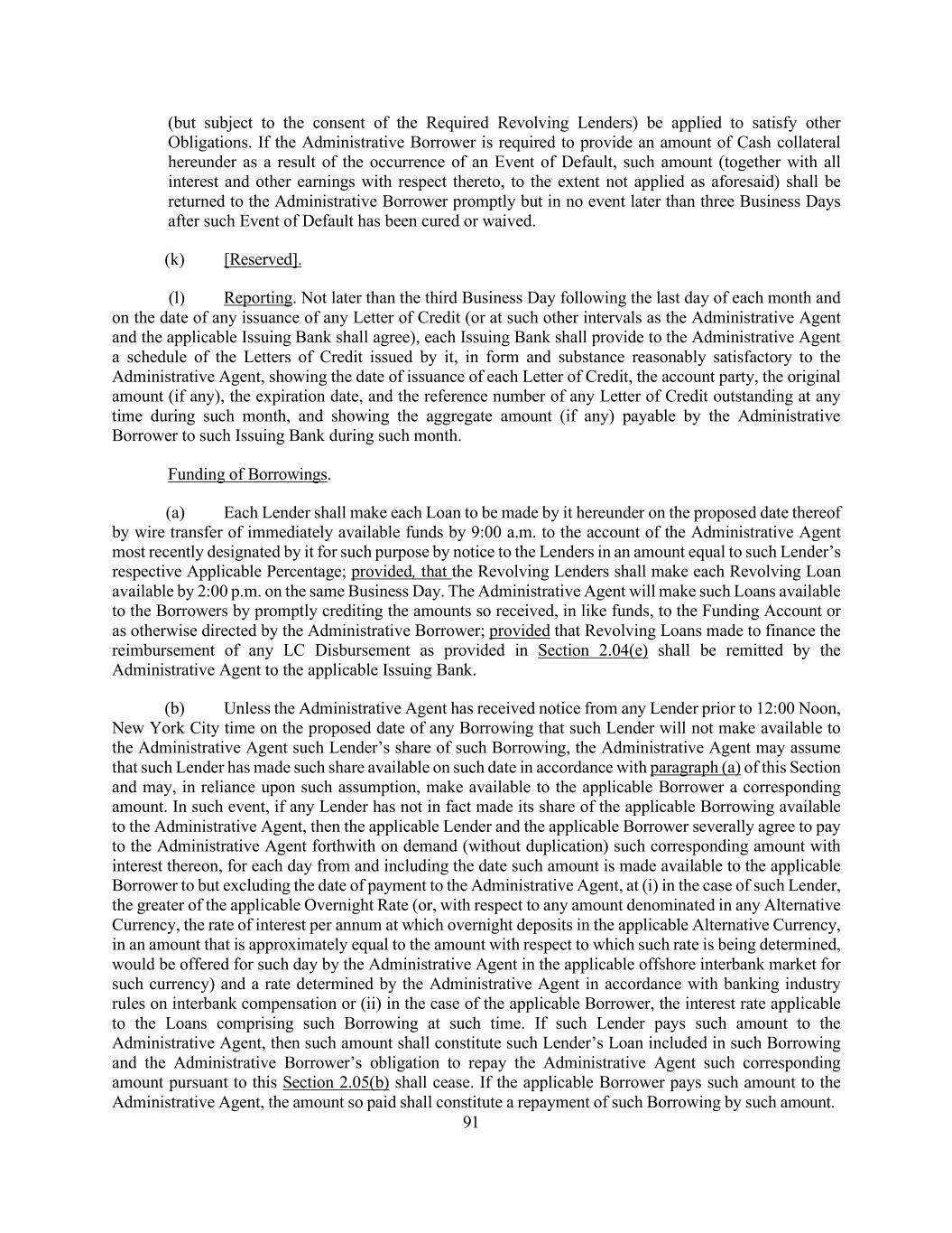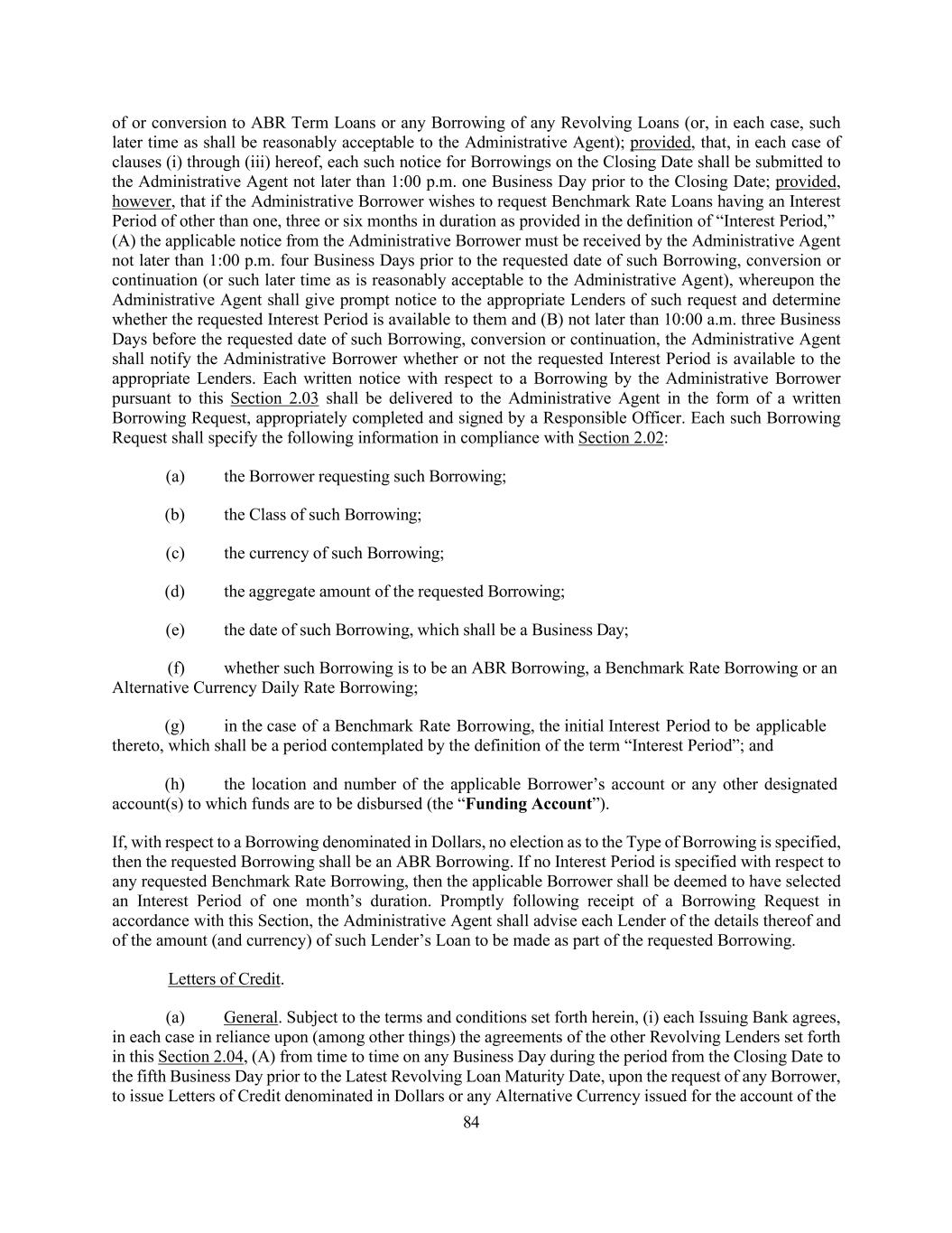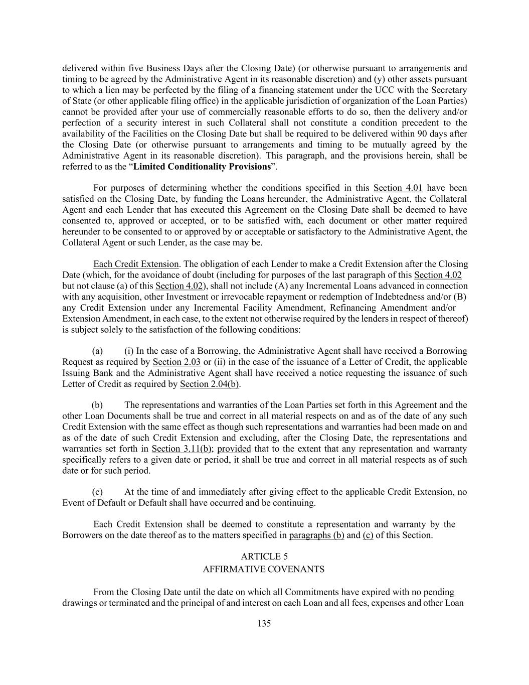 135 delivered within five Business Days after the Closing Date) (or otherwise pursuant to arrangements and timing to be agreed by the Administrative Agent in its reasonable discretion) and (y) other assets pursuant to which a lien may be perfected by the filing of a financing statement under the UCC with the Secretary of State (or other applicable filing office) in the applicable jurisdiction of organization of the Loan Parties) cannot be provided after your use of commercially reasonable efforts to do so, then the delivery and/or perfection of a security interest in such Collateral shall not constitute a condition precedent to the availability of the Facilities on the Closing Date but shall be required to be delivered within 90 days after the Closing Date (or otherwise pursuant to arrangements and timing to be mutually agreed by the Administrative Agent in its reasonable discretion). This paragraph, and the provisions herein, shall be referred to as the “Limited Conditionality Provisions”. For purposes of determining whether the conditions specified in this Section 4.01 have been satisfied on the Closing Date, by funding the Loans hereunder, the Administrative Agent, the Collateral Agent and each Lender that has executed this Agreement on the Closing Date shall be deemed to have consented to, approved or accepted, or to be satisfied with, each document or other matter required hereunder to be consented to or approved by or acceptable or satisfactory to the Administrative Agent, the Collateral Agent or such Lender, as the case may be. Each Credit Extension. The obligation of each Lender to make a Credit Extension after the Closing Date (which, for the avoidance of doubt (including for purposes of the last paragraph of this Section 4.02 but not clause (a) of this Section 4.02), shall not include (A) any Incremental Loans advanced in connection with any acquisition, other Investment or irrevocable repayment or redemption of Indebtedness and/or (B) any Credit Extension under any Incremental Facility Amendment, Refinancing Amendment and/or Extension Amendment, in each case, to the extent not otherwise required by the lenders in respect of thereof) is subject solely to the satisfaction of the following conditions: (a) (i) In the case of a Borrowing, the Administrative Agent shall have received a Borrowing Request as required by Section 2.03 or (ii) in the case of the issuance of a Letter of Credit, the applicable Issuing Bank and the Administrative Agent shall have received a notice requesting the issuance of such Letter of Credit as required by Section 2.04(b). (b) The representations and warranties of the Loan Parties set forth in this Agreement and the other Loan Documents shall be true and correct in all material respects on and as of the date of any such Credit Extension with the same effect as though such representations and warranties had been made on and as of the date of such Credit Extension and excluding, after the Closing Date, the representations and warranties set forth in Section 3.11(b); provided that to the extent that any representation and warranty specifically refers to a given date or period, it shall be true and correct in all material respects as of such date or for such period. (c) At the time of and immediately after giving effect to the applicable Credit Extension, no Event of Default or Default shall have occurred and be continuing. Each Credit Extension shall be deemed to constitute a representation and warranty by the Borrowers on the date thereof as to the matters specified in paragraphs (b) and (c) of this Section. ARTICLE 5 AFFIRMATIVE COVENANTS From the Closing Date until the date on which all Commitments have expired with no pending drawings or terminated and the principal of and interest on each Loan and all fees, expenses and other Loan