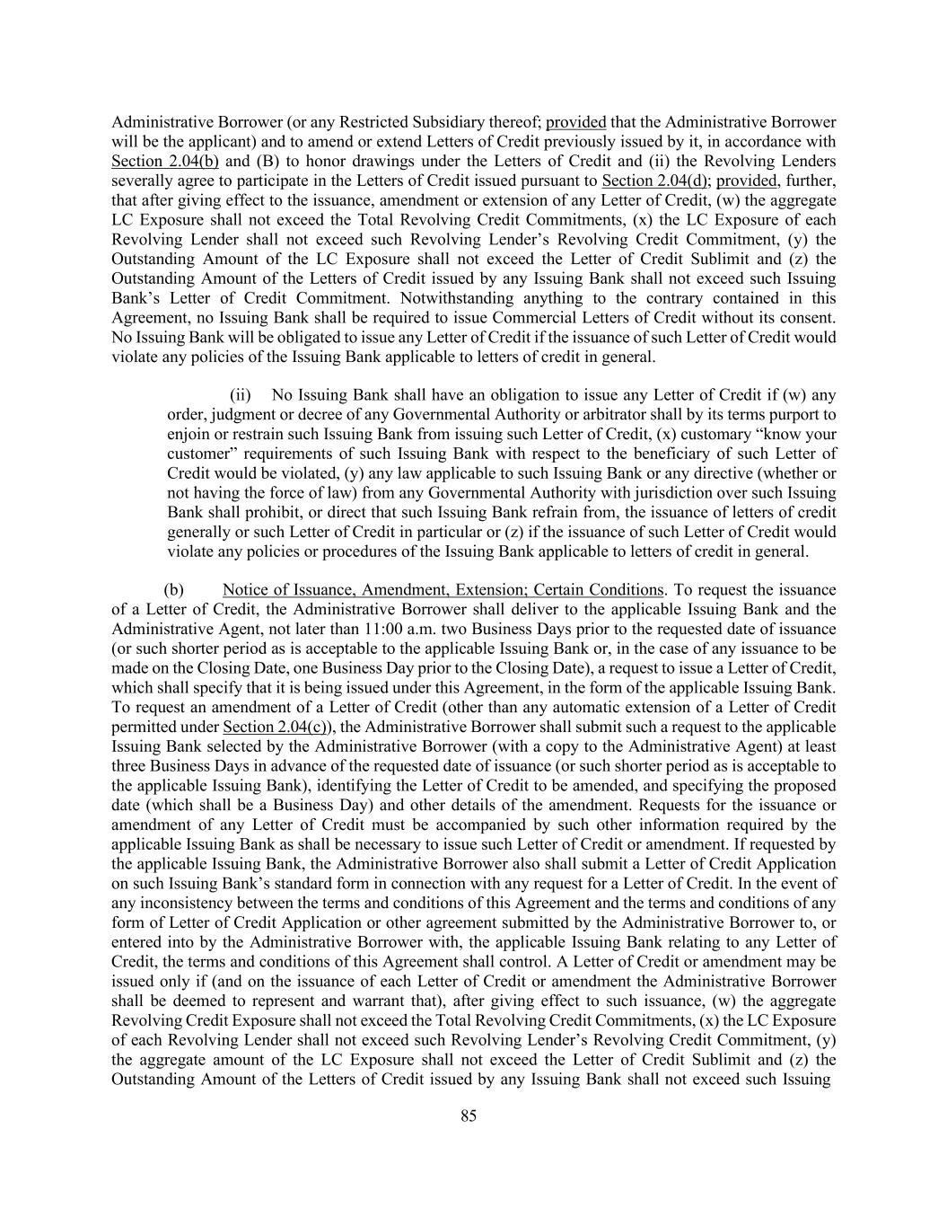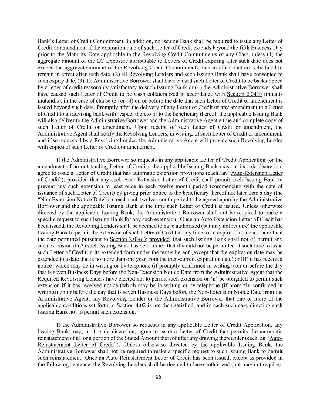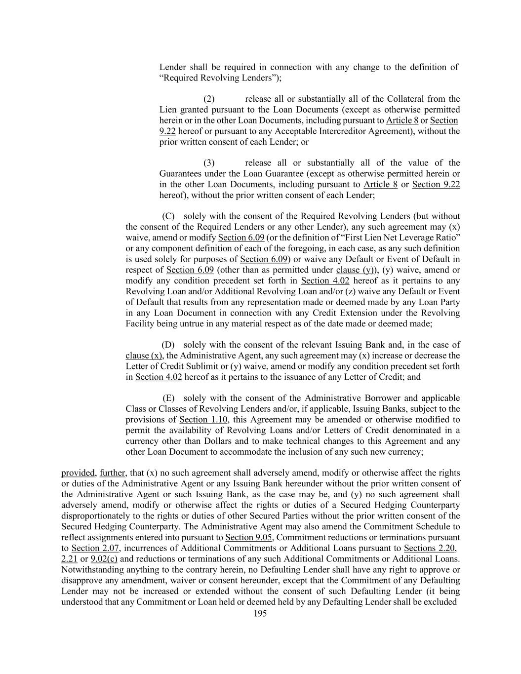 195 Lender shall be required in connection with any change to the definition of “Required Revolving Lenders”); (2) release all or substantially all of the Collateral from the Lien granted pursuant to the Loan Documents (except as otherwise permitted herein or in the other Loan Documents, including pursuant to Article 8 or Section 9.22 hereof or pursuant to any Acceptable Intercreditor Agreement), without the prior written consent of each Lender; or (3) release all or substantially all of the value of the Guarantees under the Loan Guarantee (except as otherwise permitted herein or in the other Loan Documents, including pursuant to Article 8 or Section 9.22 hereof), without the prior written consent of each Lender; (C) solely with the consent of the Required Revolving Lenders (but without the consent of the Required Lenders or any other Lender), any such agreement may (x) waive, amend or modify Section 6.09 (or the definition of “First Lien Net Leverage Ratio” or any component definition of each of the foregoing, in each case, as any such definition is used solely for purposes of Section 6.09) or waive any Default or Event of Default in respect of Section 6.09 (other than as permitted under clause (y)), (y) waive, amend or modify any condition precedent set forth in Section 4.02 hereof as it pertains to any Revolving Loan and/or Additional Revolving Loan and/or (z) waive any Default or Event of Default that results from any representation made or deemed made by any Loan Party in any Loan Document in connection with any Credit Extension under the Revolving Facility being untrue in any material respect as of the date made or deemed made; (D) solely with the consent of the relevant Issuing Bank and, in the case of clause (x), the Administrative Agent, any such agreement may (x) increase or decrease the Letter of Credit Sublimit or (y) waive, amend or modify any condition precedent set forth in Section 4.02 hereof as it pertains to the issuance of any Letter of Credit; and (E) solely with the consent of the Administrative Borrower and applicable Class or Classes of Revolving Lenders and/or, if applicable, Issuing Banks, subject to the provisions of Section 1.10, this Agreement may be amended or otherwise modified to permit the availability of Revolving Loans and/or Letters of Credit denominated in a currency other than Dollars and to make technical changes to this Agreement and any other Loan Document to accommodate the inclusion of any such new currency; provided, further, that (x) no such agreement shall adversely amend, modify or otherwise affect the rights or duties of the Administrative Agent or any Issuing Bank hereunder without the prior written consent of the Administrative Agent or such Issuing Bank, as the case may be, and (y) no such agreement shall adversely amend, modify or otherwise affect the rights or duties of a Secured Hedging Counterparty disproportionately to the rights or duties of other Secured Parties without the prior written consent of the Secured Hedging Counterparty. The Administrative Agent may also amend the Commitment Schedule to reflect assignments entered into pursuant to Section 9.05, Commitment reductions or terminations pursuant to Section 2.07, incurrences of Additional Commitments or Additional Loans pursuant to Sections 2.20, 2.21 or 9.02(c) and reductions or terminations of any such Additional Commitments or Additional Loans. Notwithstanding anything to the contrary herein, no Defaulting Lender shall have any right to approve or disapprove any amendment, waiver or consent hereunder, except that the Commitment of any Defaulting Lender may not be increased or extended without the consent of such Defaulting Lender (it being understood that any Commitment or Loan held or deemed held by any Defaulting Lender shall be excluded