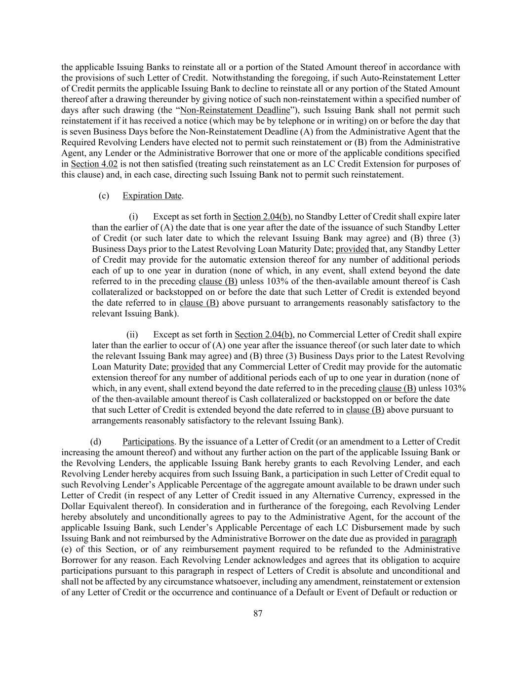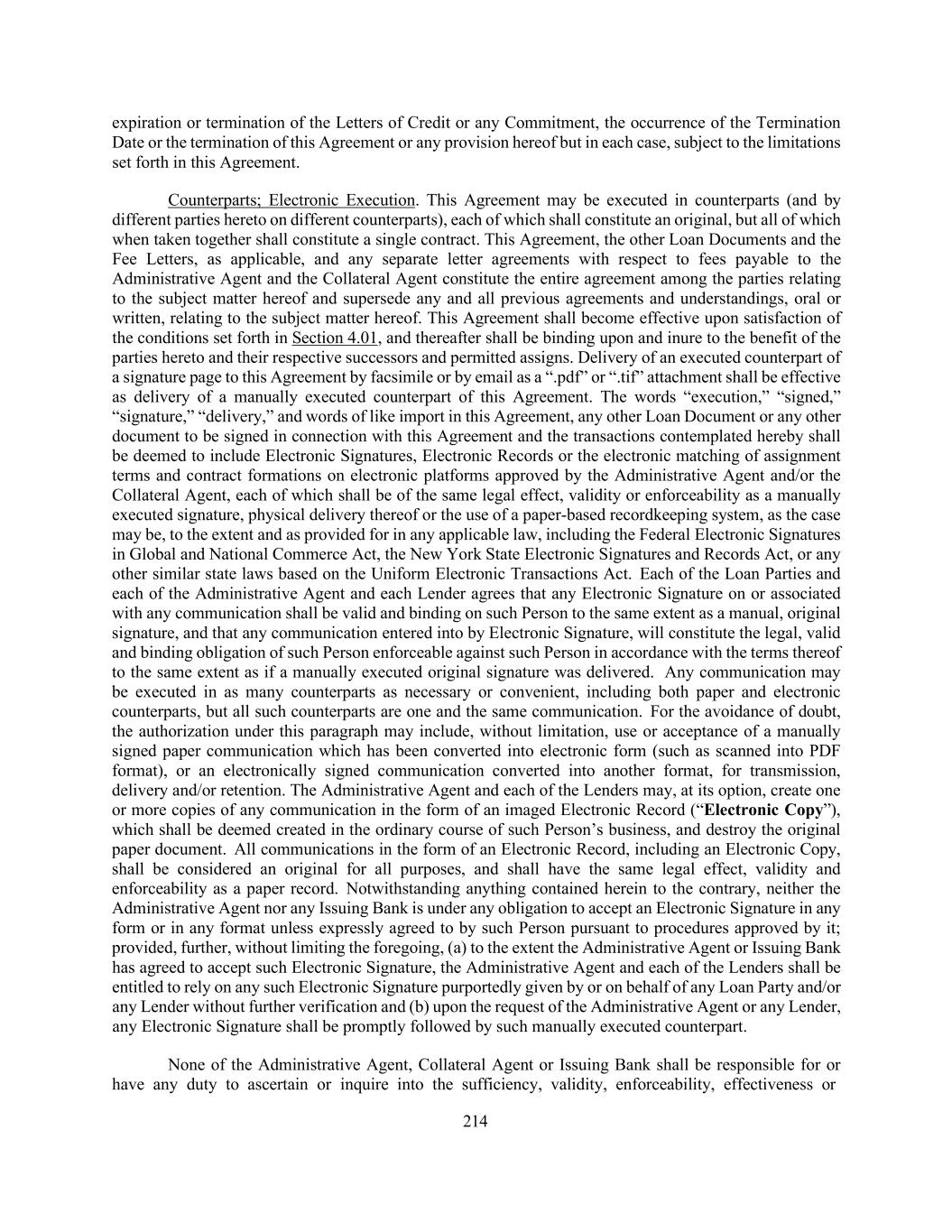 214 expiration or termination of the Letters of Credit or any Commitment, the occurrence of the Termination Date or the termination of this Agreement or any provision hereof but in each case, subject to the limitations set forth in this Agreement. Counterparts; Electronic Execution. This Agreement may be executed in counterparts (and by different parties hereto on different counterparts), each of which shall constitute an original, but all of which when taken together shall constitute a single contract. This Agreement, the other Loan Documents and the Fee Letters, as applicable, and any separate letter agreements with respect to fees payable to the Administrative Agent and the Collateral Agent constitute the entire agreement among the parties relating to the subject matter hereof and supersede any and all previous agreements and understandings, oral or written, relating to the subject matter hereof. This Agreement shall become effective upon satisfaction of the conditions set forth in Section 4.01, and thereafter shall be binding upon and inure to the benefit of the parties hereto and their respective successors and permitted assigns. Delivery of an executed counterpart of a signature page to this Agreement by facsimile or by email as a “.pdf” or “.tif” attachment shall be effective as delivery of a manually executed counterpart of this Agreement. The words “execution,” “signed,” “signature,” “delivery,” and words of like import in this Agreement, any other Loan Document or any other document to be signed in connection with this Agreement and the transactions contemplated hereby shall be deemed to include Electronic Signatures, Electronic Records or the electronic matching of assignment terms and contract formations on electronic platforms approved by the Administrative Agent and/or the Collateral Agent, each of which shall be of the same legal effect, validity or enforceability as a manually executed signature, physical delivery thereof or the use of a paper-based recordkeeping system, as the case may be, to the extent and as provided for in any applicable law, including the Federal Electronic Signatures in Global and National Commerce Act, the New York State Electronic Signatures and Records Act, or any other similar state laws based on the Uniform Electronic Transactions Act. Each of the Loan Parties and each of the Administrative Agent and each Lender agrees that any Electronic Signature on or associated with any communication shall be valid and binding on such Person to the same extent as a manual, original signature, and that any communication entered into by Electronic Signature, will constitute the legal, valid and binding obligation of such Person enforceable against such Person in accordance with the terms thereof to the same extent as if a manually executed original signature was delivered. Any communication may be executed in as many counterparts as necessary or convenient, including both paper and electronic counterparts, but all such counterparts are one and the same communication. For the avoidance of doubt, the authorization under this paragraph may include, without limitation, use or acceptance of a manually signed paper communication which has been converted into electronic form (such as scanned into PDF format), or an electronically signed communication converted into another format, for transmission, delivery and/or retention. The Administrative Agent and each of the Lenders may, at its option, create one or more copies of any communication in the form of an imaged Electronic Record (“Electronic Copy”), which shall be deemed created in the ordinary course of such Person’s business, and destroy the original paper document. All communications in the form of an Electronic Record, including an Electronic Copy, shall be considered an original for all purposes, and shall have the same legal effect, validity and enforceability as a paper record. Notwithstanding anything contained herein to the contrary, neither the Administrative Agent nor any Issuing Bank is under any obligation to accept an Electronic Signature in any form or in any format unless expressly agreed to by such Person pursuant to procedures approved by it; provided, further, without limiting the foregoing, (a) to the extent the Administrative Agent or Issuing Bank has agreed to accept such Electronic Signature, the Administrative Agent and each of the Lenders shall be entitled to rely on any such Electronic Signature purportedly given by or on behalf of any Loan Party and/or any Lender without further verification and (b) upon the request of the Administrative Agent or any Lender, any Electronic Signature shall be promptly followed by such manually executed counterpart. None of the Administrative Agent, Collateral Agent or Issuing Bank shall be responsible for or have any duty to ascertain or inquire into the sufficiency, validity, enforceability, effectiveness or