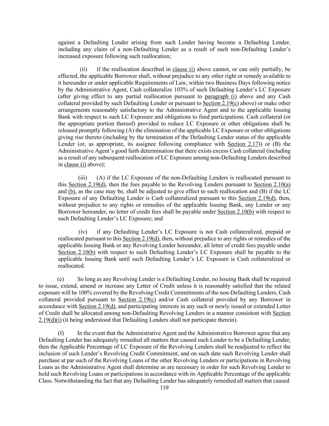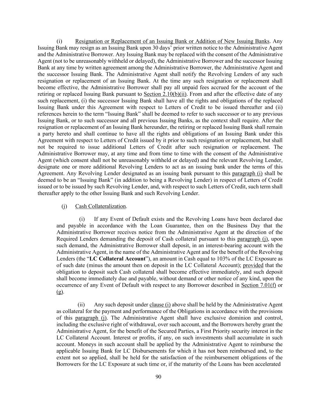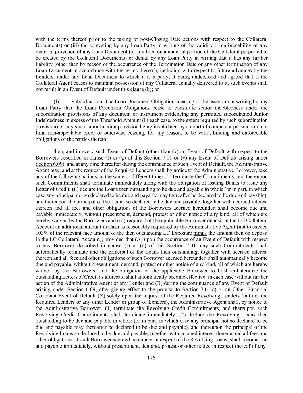 176 with the terms thereof prior to the taking of post-Closing Date actions with respect to the Collateral Documents) or (iii) the contesting by any Loan Party in writing of the validity or enforceability of any material provision of any Loan Document (or any Lien on a material portion of the Collateral purported to be created by the Collateral Documents) or denial by any Loan Party in writing that it has any further liability (other than by reason of the occurrence of the Termination Date or any other termination of any Loan Document in accordance with the terms thereof), including with respect to future advances by the Lenders, under any Loan Document to which it is a party; it being understood and agreed that if the Collateral Agent ceases to maintain possession of any Collateral actually delivered to it, such events shall not result in an Event of Default under this clause (k); or (l) Subordination. The Loan Document Obligations ceasing or the assertion in writing by any Loan Party that the Loan Document Obligations cease to constitute senior indebtedness under the subordination provisions of any document or instrument evidencing any permitted subordinated Junior Indebtedness in excess of the Threshold Amount (in each case, to the extent required by such subordination provision) or any such subordination provision being invalidated by a court of competent jurisdiction in a final non-appealable order or otherwise ceasing, for any reason, to be valid, binding and enforceable obligations of the parties thereto; then, and in every such Event of Default (other than (x) an Event of Default with respect to the Borrowers described in clause (f) or (g) of this Section 7.01 or (y) any Event of Default arising under Section 6.09), and at any time thereafter during the continuance of such Event of Default, the Administrative Agent may, and at the request of the Required Lenders shall, by notice to the Administrative Borrower, take any of the following actions, at the same or different times: (i) terminate the Commitments, and thereupon such Commitments shall terminate immediately along with the obligation of Issuing Banks to issue any Letter of Credit, (ii) declare the Loans then outstanding to be due and payable in whole (or in part, in which case any principal not so declared to be due and payable may thereafter be declared to be due and payable), and thereupon the principal of the Loans so declared to be due and payable, together with accrued interest thereon and all fees and other obligations of the Borrowers accrued hereunder, shall become due and payable immediately, without presentment, demand, protest or other notice of any kind, all of which are hereby waived by the Borrowers and (iii) require that the applicable Borrower deposit in the LC Collateral Account an additional amount in Cash as reasonably requested by the Administrative Agent (not to exceed 103% of the relevant face amount of the then outstanding LC Exposure minus the amount then on deposit in the LC Collateral Account); provided that (A) upon the occurrence of an Event of Default with respect to any Borrower described in clause (f) or (g) of this Section 7.01, any such Commitments shall automatically terminate and the principal of the Loans then outstanding, together with accrued interest thereon and all fees and other obligations of such Borrower accrued hereunder, shall automatically become due and payable, without presentment, demand, protest or other notice of any kind, all of which are hereby waived by the Borrowers, and the obligation of the applicable Borrower to Cash collateralize the outstanding Letters of Credit as aforesaid shall automatically become effective, in each case without further action of the Administrative Agent or any Lender and (B) during the continuance of any Event of Default arising under Section 6.09, after giving effect to the proviso to Section 7.01(c) or an Other Financial Covenant Event of Default (X) solely upon the request of the Required Revolving Lenders (but not the Required Lenders or any other Lender or group of Lenders), the Administrative Agent shall, by notice to the Administrative Borrower, (1) terminate the Revolving Credit Commitments, and thereupon such Revolving Credit Commitments shall terminate immediately, (2) declare the Revolving Loans then outstanding to be due and payable in whole (or in part, in which case any principal not so declared to be due and payable may thereafter be declared to be due and payable), and thereupon the principal of the Revolving Loans so declared to be due and payable, together with accrued interest thereon and all fees and other obligations of such Borrower accrued hereunder in respect of the Revolving Loans, shall become due and payable immediately, without presentment, demand, protest or other notice in respect thereof of any