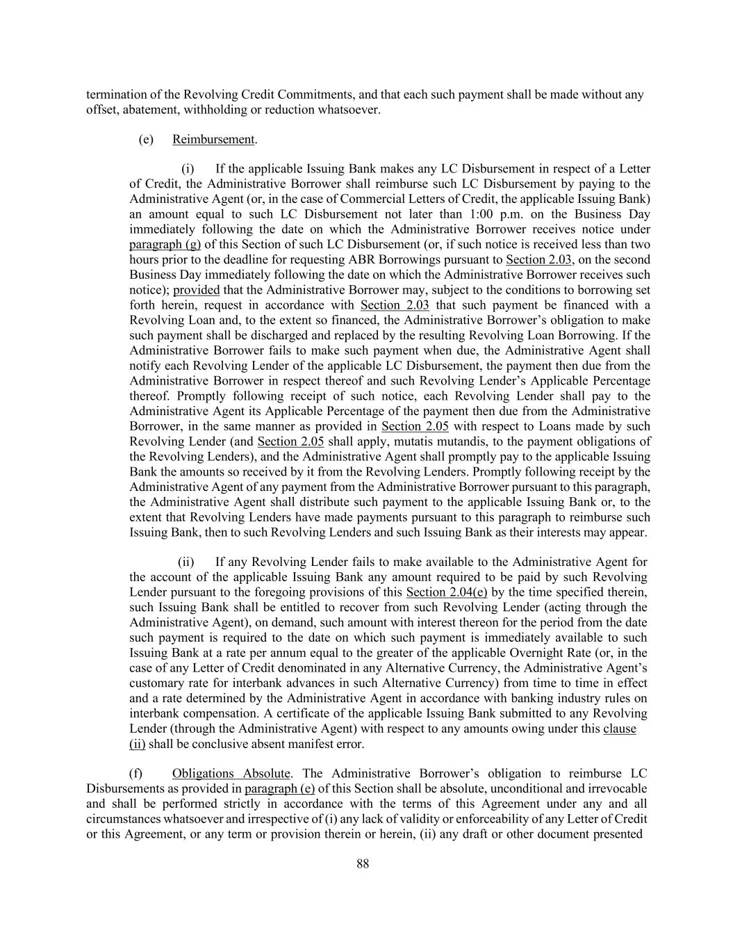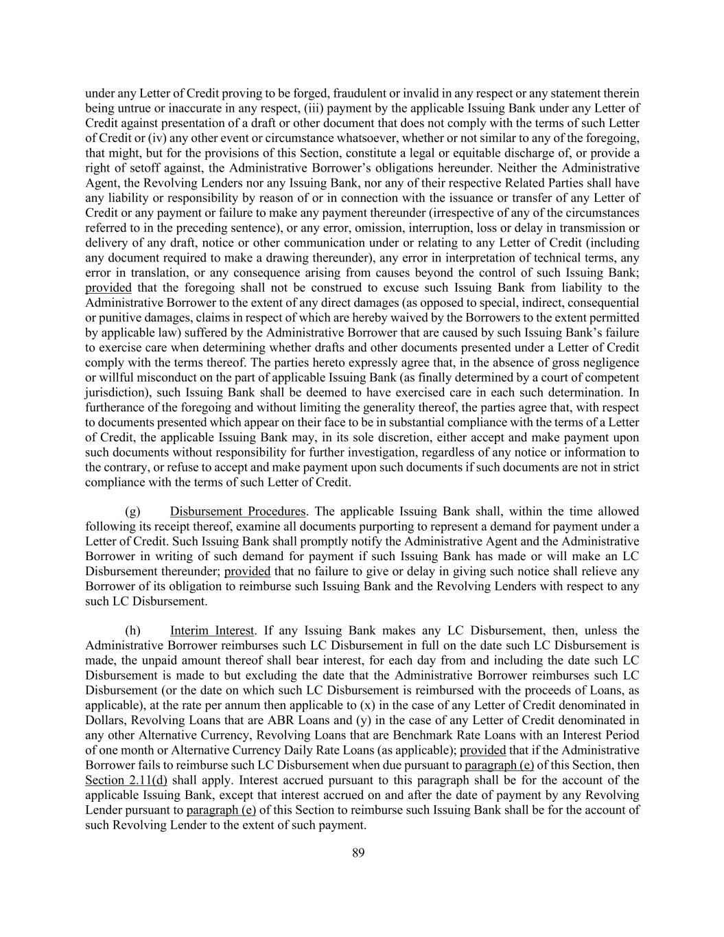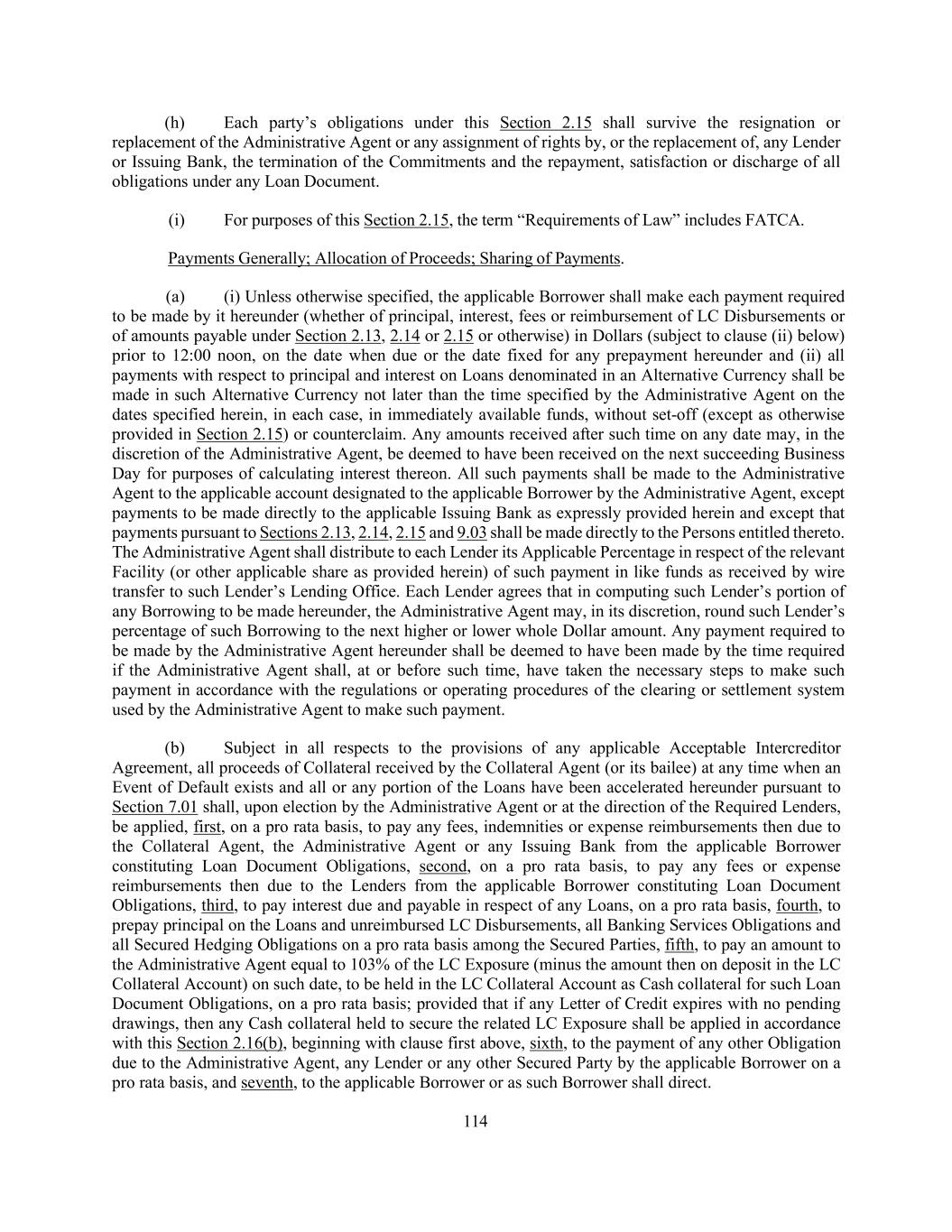 176 with the terms thereof prior to the taking of post-Closing Date actions with respect to the Collateral Documents) or (iii) the contesting by any Loan Party in writing of the validity or enforceability of any material provision of any Loan Document (or any Lien on a material portion of the Collateral purported to be created by the Collateral Documents) or denial by any Loan Party in writing that it has any further liability (other than by reason of the occurrence of the Termination Date or any other termination of any Loan Document in accordance with the terms thereof), including with respect to future advances by the Lenders, under any Loan Document to which it is a party; it being understood and agreed that if the Collateral Agent ceases to maintain possession of any Collateral actually delivered to it, such events shall not result in an Event of Default under this clause (k); or (l) Subordination. The Loan Document Obligations ceasing or the assertion in writing by any Loan Party that the Loan Document Obligations cease to constitute senior indebtedness under the subordination provisions of any document or instrument evidencing any permitted subordinated Junior Indebtedness in excess of the Threshold Amount (in each case, to the extent required by such subordination provision) or any such subordination provision being invalidated by a court of competent jurisdiction in a final non-appealable order or otherwise ceasing, for any reason, to be valid, binding and enforceable obligations of the parties thereto; then, and in every such Event of Default (other than (x) an Event of Default with respect to the Borrowers described in clause (f) or (g) of this Section 7.01 or (y) any Event of Default arising under Section 6.09), and at any time thereafter during the continuance of such Event of Default, the Administrative Agent may, and at the request of the Required Lenders shall, by notice to the Administrative Borrower, take any of the following actions, at the same or different times: (i) terminate the Commitments, and thereupon such Commitments shall terminate immediately along with the obligation of Issuing Banks to issue any Letter of Credit, (ii) declare the Loans then outstanding to be due and payable in whole (or in part, in which case any principal not so declared to be due and payable may thereafter be declared to be due and payable), and thereupon the principal of the Loans so declared to be due and payable, together with accrued interest thereon and all fees and other obligations of the Borrowers accrued hereunder, shall become due and payable immediately, without presentment, demand, protest or other notice of any kind, all of which are hereby waived by the Borrowers and (iii) require that the applicable Borrower deposit in the LC Collateral Account an additional amount in Cash as reasonably requested by the Administrative Agent (not to exceed 103% of the relevant face amount of the then outstanding LC Exposure minus the amount then on deposit in the LC Collateral Account); provided that (A) upon the occurrence of an Event of Default with respect to any Borrower described in clause (f) or (g) of this Section 7.01, any such Commitments shall automatically terminate and the principal of the Loans then outstanding, together with accrued interest thereon and all fees and other obligations of such Borrower accrued hereunder, shall automatically become due and payable, without presentment, demand, protest or other notice of any kind, all of which are hereby waived by the Borrowers, and the obligation of the applicable Borrower to Cash collateralize the outstanding Letters of Credit as aforesaid shall automatically become effective, in each case without further action of the Administrative Agent or any Lender and (B) during the continuance of any Event of Default arising under Section 6.09, after giving effect to the proviso to Section 7.01(c) or an Other Financial Covenant Event of Default (X) solely upon the request of the Required Revolving Lenders (but not the Required Lenders or any other Lender or group of Lenders), the Administrative Agent shall, by notice to the Administrative Borrower, (1) terminate the Revolving Credit Commitments, and thereupon such Revolving Credit Commitments shall terminate immediately, (2) declare the Revolving Loans then outstanding to be due and payable in whole (or in part, in which case any principal not so declared to be due and payable may thereafter be declared to be due and payable), and thereupon the principal of the Revolving Loans so declared to be due and payable, together with accrued interest thereon and all fees and other obligations of such Borrower accrued hereunder in respect of the Revolving Loans, shall become due and payable immediately, without presentment, demand, protest or other notice in respect thereof of any