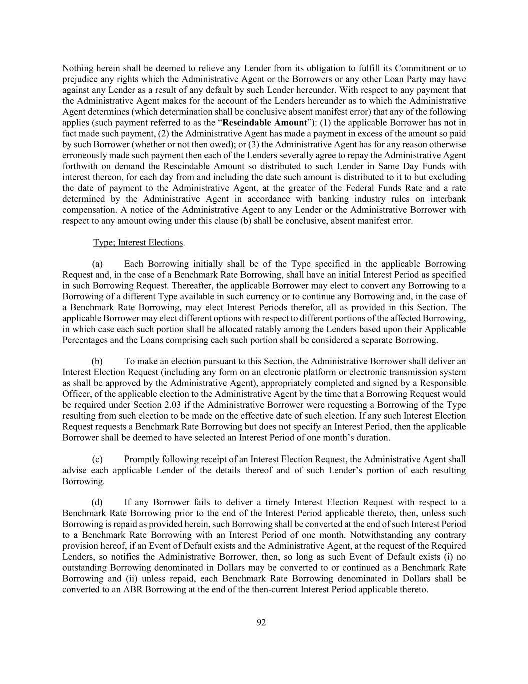 224 (a) Without limitation of any other provision in this Agreement, if at any time the Administrative Agent makes a payment hereunder in error to any Lender, whether or not in respect of an Obligation due and owing by any Borrower at such time, where such payment is a Rescindable Amount, then in any such event, each Lender receiving a Rescindable Amount severally agrees to repay to the Administrative Agent forthwith on demand the Rescindable Amount received by such Lender in Same Day Funds in the currency so received, with interest thereon, for each day from and including the date such Rescindable Amount is received by it to but excluding the date of payment to the Administrative Agent, at the greater of the Federal Funds Rate and a rate determined by the Administrative Agent in accordance with banking industry rules on interbank compensation. Each Lender irrevocably waives any and all defenses, including any “discharge for value” (under which a creditor might otherwise claim a right to retain funds mistakenly paid by a third party in respect of a debt owed by another) or similar defense to its obligations to return any Rescindable Amount. The Administrative Agent shall inform each Lender promptly upon determining that any payment made to such Lender comprised, in whole or in part, a Rescindable Amount. (b) Each party’s obligations under this Section 9.26 shall survive the resignation or replacement of the Administrative Agent or any transfer of rights or obligations by, or the replacement of, a Lender, the termination of the Commitments or the repayment, satisfaction or discharge of all Obligations under any Loan Document. Acknowledgements of Lenders and Issuing Banks. (a) Each Lender and each Issuing Bank represents and warrants that (1) the Loan Documents set forth the terms of a commercial lending facility, (2) in participating as a Lender, it is engaged in making, acquiring or holding commercial loans and in providing other facilities set forth herein as may be applicable to such Lender or Issuing Bank, in each case in the ordinary course of business, and not for the purpose of investing in the general performance or operations of any Borrower, or for the purpose of purchasing, acquiring or holding any other type of financial instrument such as a security (and each Lender and each Issuing Bank agrees not to assert a claim in contravention of the foregoing, such as a claim under the federal or state securities laws), (3) it has, independently and without reliance upon the Administrative Agent, any Arranger, or any other Lender or Issuing Bank, or any of the Related Parties of any of the foregoing, and based on such documents and information as it has deemed appropriate, made its own credit analysis of, and appraisal of, and investigation into, the business, prospects, operations, property, financial and other condition and creditworthiness of the Loan Parties and their Subsidiaries, and all applicable bank or other regulatory laws relating to the transactions contemplated hereby, and made its own decision to enter into this Agreement as a Lender, and to make, acquire or hold Loans hereunder and (4) it is sophisticated with respect to decisions to make, acquire and/or hold commercial loans and to provide other facilities set forth herein, as may be applicable to such Lender or such Issuing Bank, and either it, or the Person exercising discretion in making its decision to make, acquire and/or hold such commercial loans or to provide such other facilities, is experienced in making, acquiring or holding such commercial loans or providing such other facilities. Each Lender and each Issuing Bank also acknowledges that it will, independently and without reliance upon the Administrative Agent, any Arranger or any other Lender or Issuing Bank, or any of the Related Parties of any of the foregoing, and based on such documents and information (which may contain material, non- public information within the meaning of the United States securities laws concerning any Borrower and its Affiliates) as it shall from time to time deem appropriate, continue to make its own credit analysis, appraisals and decisions in taking or not taking action under or based upon this Agreement, any other Loan Document or any related agreement or any document furnished hereunder or thereunder, and to make such investigations as it deems necessary to inform itself as to the business, prospects, operations, property, financial and other condition and creditworthiness of the Loan Parties. (b) Each Lender, by delivering its signature page to this Agreement on the Closing Date, or delivering its signature page to an Assignment and Assumption or any other Loan Document pursuant to
