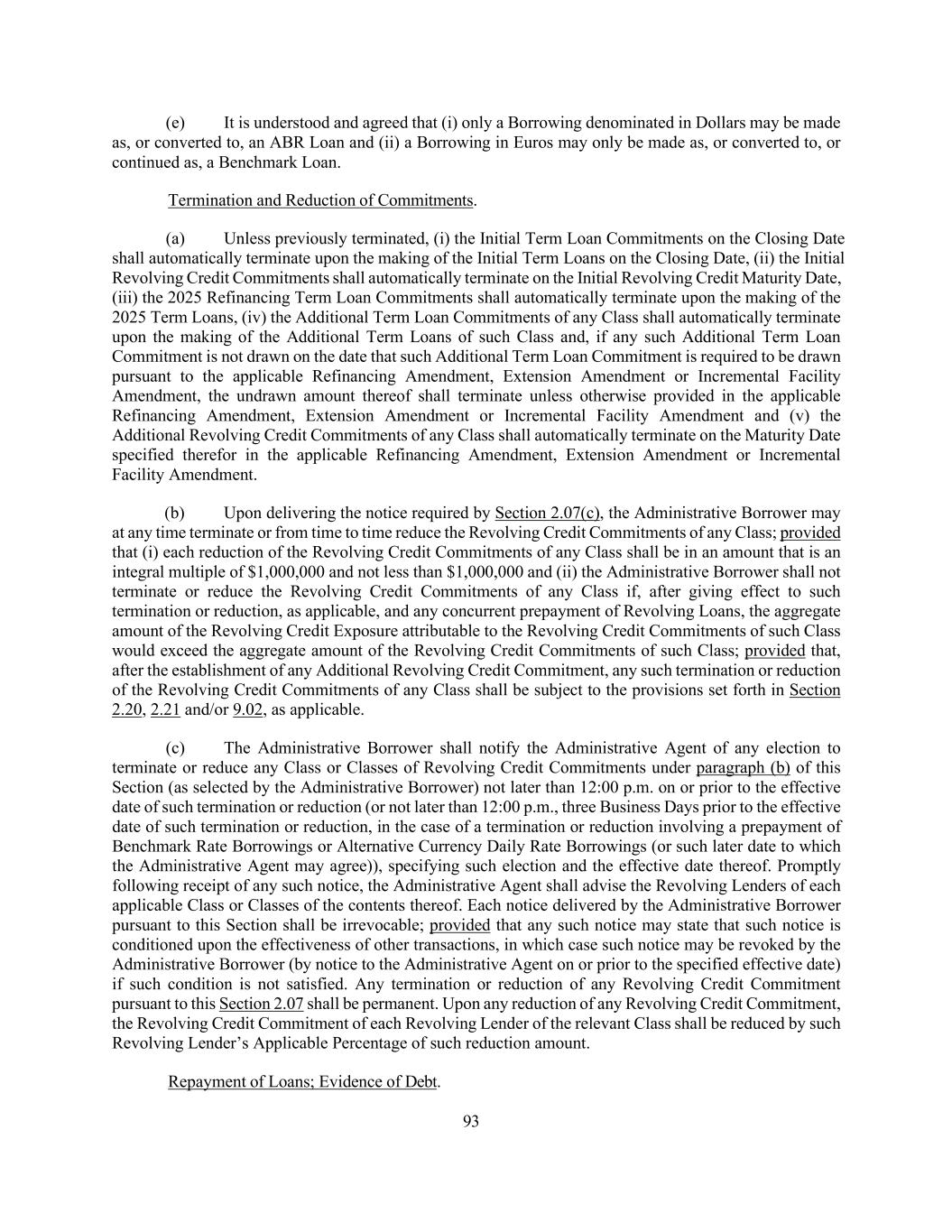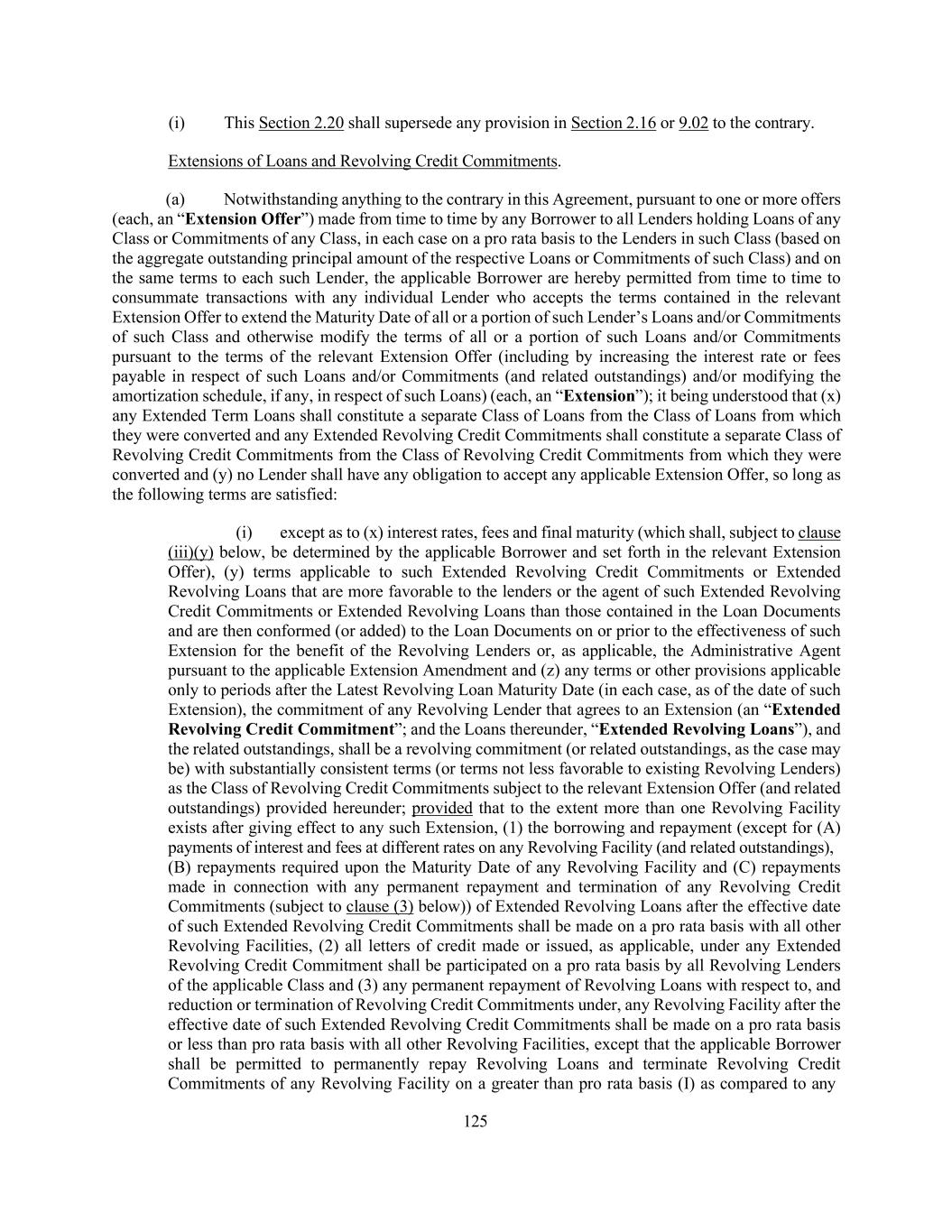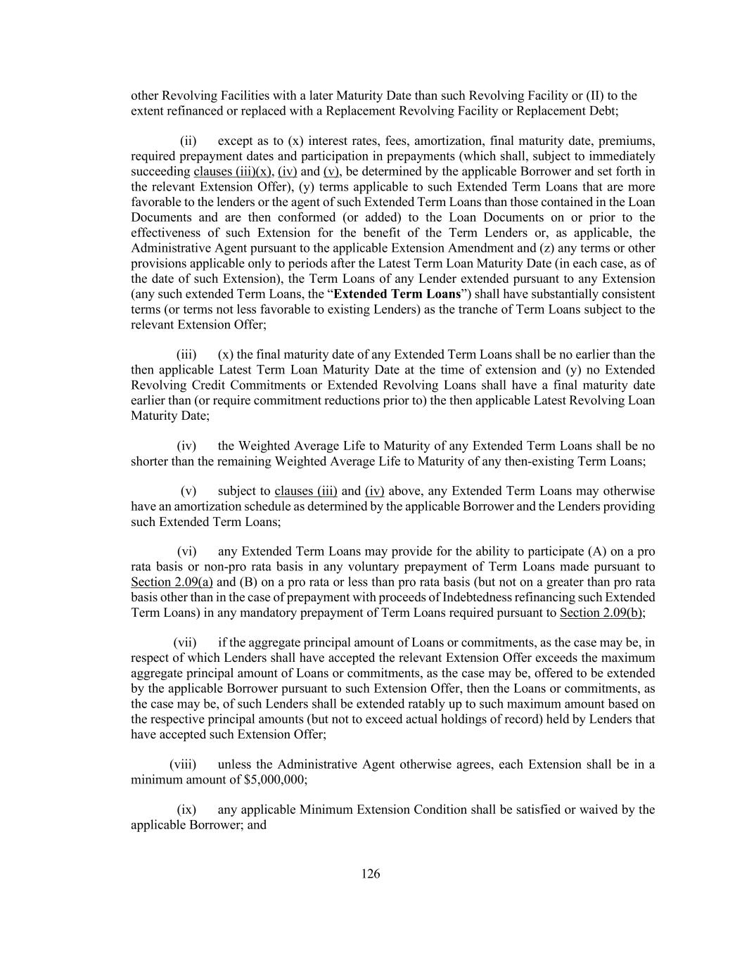 126 other Revolving Facilities with a later Maturity Date than such Revolving Facility or (II) to the extent refinanced or replaced with a Replacement Revolving Facility or Replacement Debt; (ii) except as to (x) interest rates, fees, amortization, final maturity date, premiums, required prepayment dates and participation in prepayments (which shall, subject to immediately succeeding clauses (iii)(x), (iv) and (v), be determined by the applicable Borrower and set forth in the relevant Extension Offer), (y) terms applicable to such Extended Term Loans that are more favorable to the lenders or the agent of such Extended Term Loans than those contained in the Loan Documents and are then conformed (or added) to the Loan Documents on or prior to the effectiveness of such Extension for the benefit of the Term Lenders or, as applicable, the Administrative Agent pursuant to the applicable Extension Amendment and (z) any terms or other provisions applicable only to periods after the Latest Term Loan Maturity Date (in each case, as of the date of such Extension), the Term Loans of any Lender extended pursuant to any Extension (any such extended Term Loans, the “Extended Term Loans”) shall have substantially consistent terms (or terms not less favorable to existing Lenders) as the tranche of Term Loans subject to the relevant Extension Offer; (iii) (x) the final maturity date of any Extended Term Loans shall be no earlier than the then applicable Latest Term Loan Maturity Date at the time of extension and (y) no Extended Revolving Credit Commitments or Extended Revolving Loans shall have a final maturity date earlier than (or require commitment reductions prior to) the then applicable Latest Revolving Loan Maturity Date; (iv) the Weighted Average Life to Maturity of any Extended Term Loans shall be no shorter than the remaining Weighted Average Life to Maturity of any then-existing Term Loans; (v) subject to clauses (iii) and (iv) above, any Extended Term Loans may otherwise have an amortization schedule as determined by the applicable Borrower and the Lenders providing such Extended Term Loans; (vi) any Extended Term Loans may provide for the ability to participate (A) on a pro rata basis or non-pro rata basis in any voluntary prepayment of Term Loans made pursuant to Section 2.09(a) and (B) on a pro rata or less than pro rata basis (but not on a greater than pro rata basis other than in the case of prepayment with proceeds of Indebtedness refinancing such Extended Term Loans) in any mandatory prepayment of Term Loans required pursuant to Section 2.09(b); (vii) if the aggregate principal amount of Loans or commitments, as the case may be, in respect of which Lenders shall have accepted the relevant Extension Offer exceeds the maximum aggregate principal amount of Loans or commitments, as the case may be, offered to be extended by the applicable Borrower pursuant to such Extension Offer, then the Loans or commitments, as the case may be, of such Lenders shall be extended ratably up to such maximum amount based on the respective principal amounts (but not to exceed actual holdings of record) held by Lenders that have accepted such Extension Offer; (viii) unless the Administrative Agent otherwise agrees, each Extension shall be in a minimum amount of $5,000,000; (ix) any applicable Minimum Extension Condition shall be satisfied or waived by the applicable Borrower; and