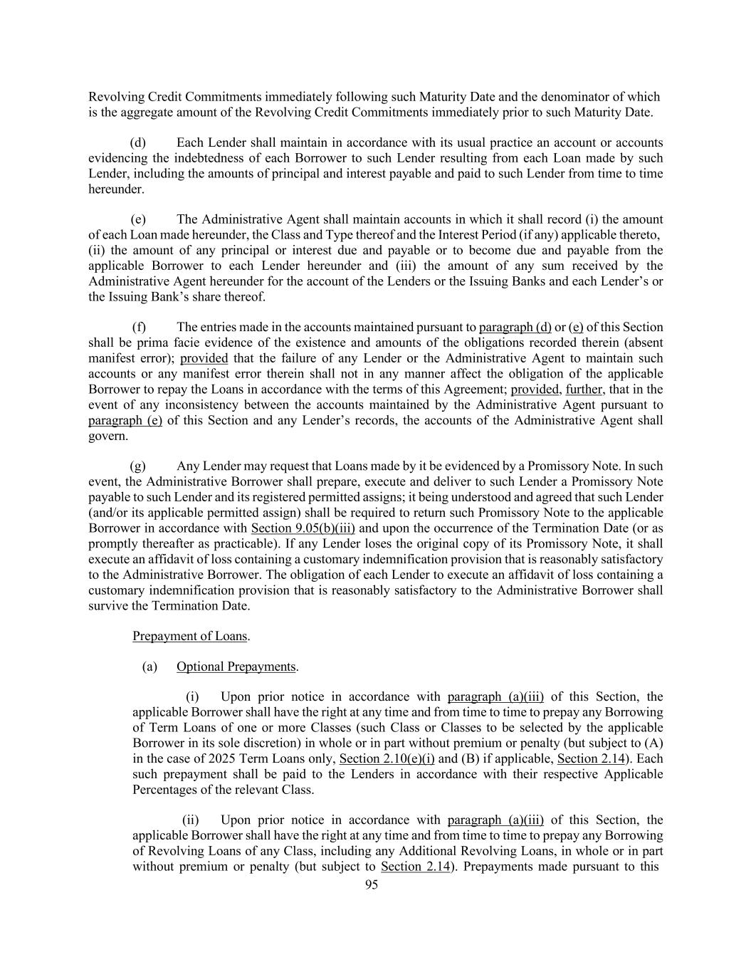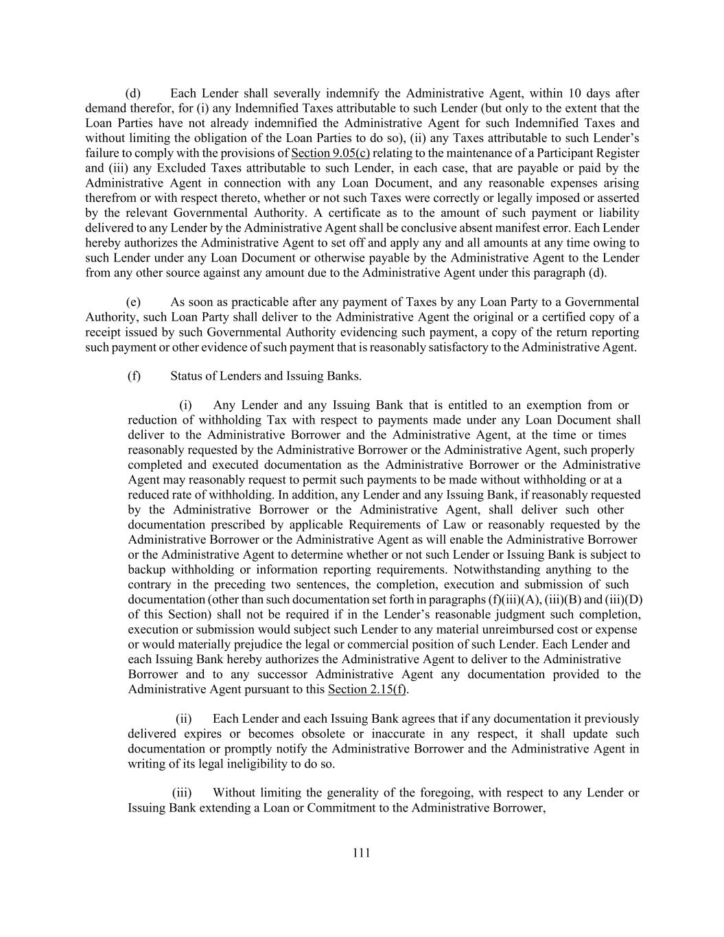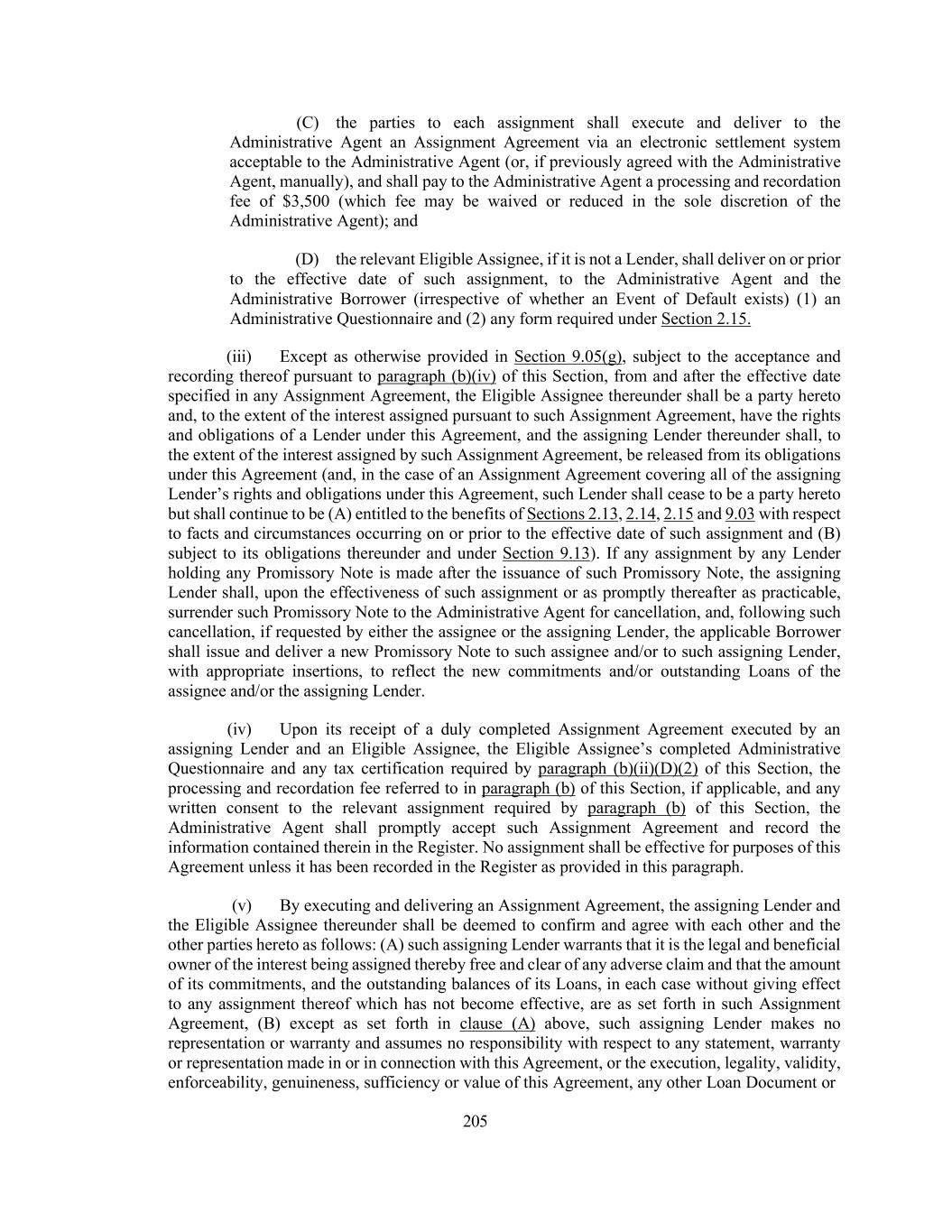 205 (C) the parties to each assignment shall execute and deliver to the Administrative Agent an Assignment Agreement via an electronic settlement system acceptable to the Administrative Agent (or, if previously agreed with the Administrative Agent, manually), and shall pay to the Administrative Agent a processing and recordation fee of $3,500 (which fee may be waived or reduced in the sole discretion of the Administrative Agent); and (D) the relevant Eligible Assignee, if it is not a Lender, shall deliver on or prior to the effective date of such assignment, to the Administrative Agent and the Administrative Borrower (irrespective of whether an Event of Default exists) (1) an Administrative Questionnaire and (2) any form required under Section 2.15. (iii) Except as otherwise provided in Section 9.05(g), subject to the acceptance and recording thereof pursuant to paragraph (b)(iv) of this Section, from and after the effective date specified in any Assignment Agreement, the Eligible Assignee thereunder shall be a party hereto and, to the extent of the interest assigned pursuant to such Assignment Agreement, have the rights and obligations of a Lender under this Agreement, and the assigning Lender thereunder shall, to the extent of the interest assigned by such Assignment Agreement, be released from its obligations under this Agreement (and, in the case of an Assignment Agreement covering all of the assigning Lender’s rights and obligations under this Agreement, such Lender shall cease to be a party hereto but shall continue to be (A) entitled to the benefits of Sections 2.13, 2.14, 2.15 and 9.03 with respect to facts and circumstances occurring on or prior to the effective date of such assignment and (B) subject to its obligations thereunder and under Section 9.13). If any assignment by any Lender holding any Promissory Note is made after the issuance of such Promissory Note, the assigning Lender shall, upon the effectiveness of such assignment or as promptly thereafter as practicable, surrender such Promissory Note to the Administrative Agent for cancellation, and, following such cancellation, if requested by either the assignee or the assigning Lender, the applicable Borrower shall issue and deliver a new Promissory Note to such assignee and/or to such assigning Lender, with appropriate insertions, to reflect the new commitments and/or outstanding Loans of the assignee and/or the assigning Lender. (iv) Upon its receipt of a duly completed Assignment Agreement executed by an assigning Lender and an Eligible Assignee, the Eligible Assignee’s completed Administrative Questionnaire and any tax certification required by paragraph (b)(ii)(D)(2) of this Section, the processing and recordation fee referred to in paragraph (b) of this Section, if applicable, and any written consent to the relevant assignment required by paragraph (b) of this Section, the Administrative Agent shall promptly accept such Assignment Agreement and record the information contained therein in the Register. No assignment shall be effective for purposes of this Agreement unless it has been recorded in the Register as provided in this paragraph. (v) By executing and delivering an Assignment Agreement, the assigning Lender and the Eligible Assignee thereunder shall be deemed to confirm and agree with each other and the other parties hereto as follows: (A) such assigning Lender warrants that it is the legal and beneficial owner of the interest being assigned thereby free and clear of any adverse claim and that the amount of its commitments, and the outstanding balances of its Loans, in each case without giving effect to any assignment thereof which has not become effective, are as set forth in such Assignment Agreement, (B) except as set forth in clause (A) above, such assigning Lender makes no representation or warranty and assumes no responsibility with respect to any statement, warranty or representation made in or in connection with this Agreement, or the execution, legality, validity, enforceability, genuineness, sufficiency or value of this Agreement, any other Loan Document or