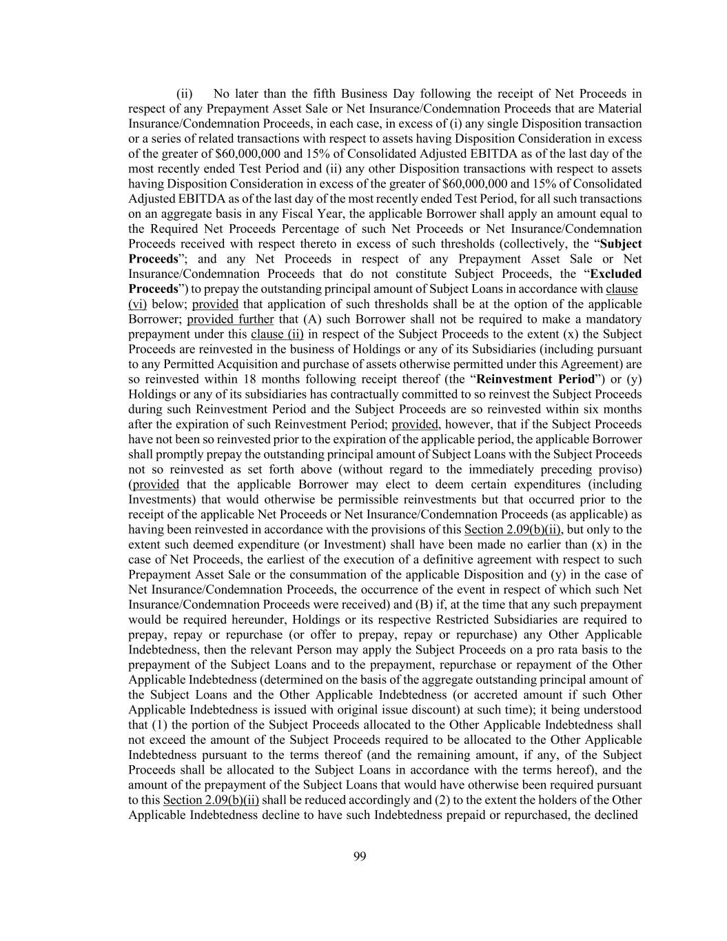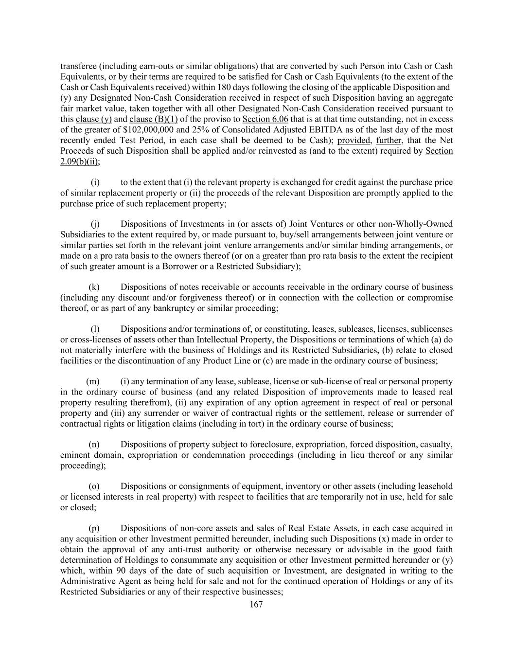 167 transferee (including earn-outs or similar obligations) that are converted by such Person into Cash or Cash Equivalents, or by their terms are required to be satisfied for Cash or Cash Equivalents (to the extent of the Cash or Cash Equivalents received) within 180 days following the closing of the applicable Disposition and (y) any Designated Non-Cash Consideration received in respect of such Disposition having an aggregate fair market value, taken together with all other Designated Non-Cash Consideration received pursuant to this clause (y) and clause (B)(1) of the proviso to Section 6.06 that is at that time outstanding, not in excess of the greater of $102,000,000 and 25% of Consolidated Adjusted EBITDA as of the last day of the most recently ended Test Period, in each case shall be deemed to be Cash); provided, further, that the Net Proceeds of such Disposition shall be applied and/or reinvested as (and to the extent) required by Section 2.09(b)(ii); (i) to the extent that (i) the relevant property is exchanged for credit against the purchase price of similar replacement property or (ii) the proceeds of the relevant Disposition are promptly applied to the purchase price of such replacement property; (j) Dispositions of Investments in (or assets of) Joint Ventures or other non-Wholly-Owned Subsidiaries to the extent required by, or made pursuant to, buy/sell arrangements between joint venture or similar parties set forth in the relevant joint venture arrangements and/or similar binding arrangements, or made on a pro rata basis to the owners thereof (or on a greater than pro rata basis to the extent the recipient of such greater amount is a Borrower or a Restricted Subsidiary); (k) Dispositions of notes receivable or accounts receivable in the ordinary course of business (including any discount and/or forgiveness thereof) or in connection with the collection or compromise thereof, or as part of any bankruptcy or similar proceeding; (l) Dispositions and/or terminations of, or constituting, leases, subleases, licenses, sublicenses or cross-licenses of assets other than Intellectual Property, the Dispositions or terminations of which (a) do not materially interfere with the business of Holdings and its Restricted Subsidiaries, (b) relate to closed facilities or the discontinuation of any Product Line or (c) are made in the ordinary course of business; (m) (i) any termination of any lease, sublease, license or sub-license of real or personal property in the ordinary course of business (and any related Disposition of improvements made to leased real property resulting therefrom), (ii) any expiration of any option agreement in respect of real or personal property and (iii) any surrender or waiver of contractual rights or the settlement, release or surrender of contractual rights or litigation claims (including in tort) in the ordinary course of business; (n) Dispositions of property subject to foreclosure, expropriation, forced disposition, casualty, eminent domain, expropriation or condemnation proceedings (including in lieu thereof or any similar proceeding); (o) Dispositions or consignments of equipment, inventory or other assets (including leasehold or licensed interests in real property) with respect to facilities that are temporarily not in use, held for sale or closed; (p) Dispositions of non-core assets and sales of Real Estate Assets, in each case acquired in any acquisition or other Investment permitted hereunder, including such Dispositions (x) made in order to obtain the approval of any anti-trust authority or otherwise necessary or advisable in the good faith determination of Holdings to consummate any acquisition or other Investment permitted hereunder or (y) which, within 90 days of the date of such acquisition or Investment, are designated in writing to the Administrative Agent as being held for sale and not for the continued operation of Holdings or any of its Restricted Subsidiaries or any of their respective businesses;