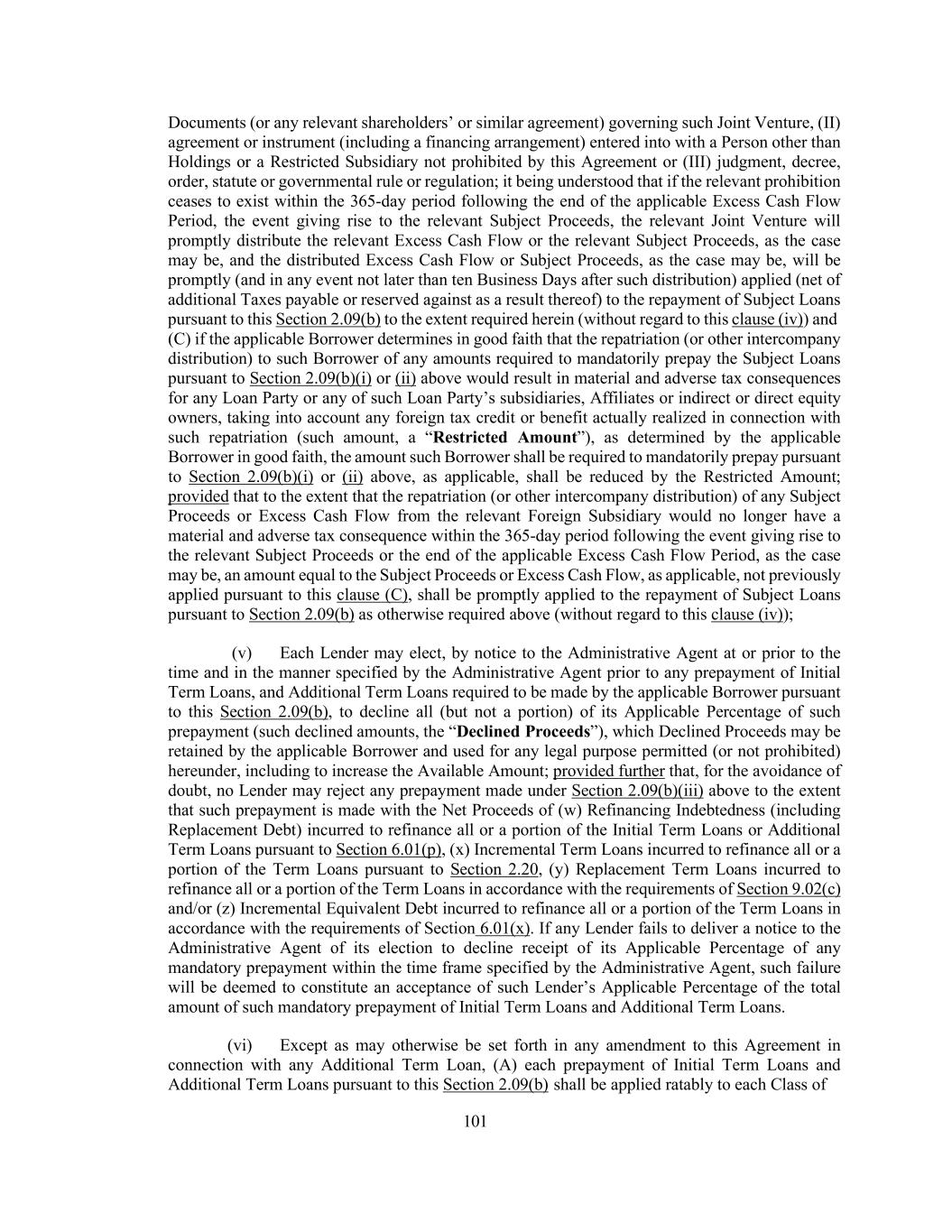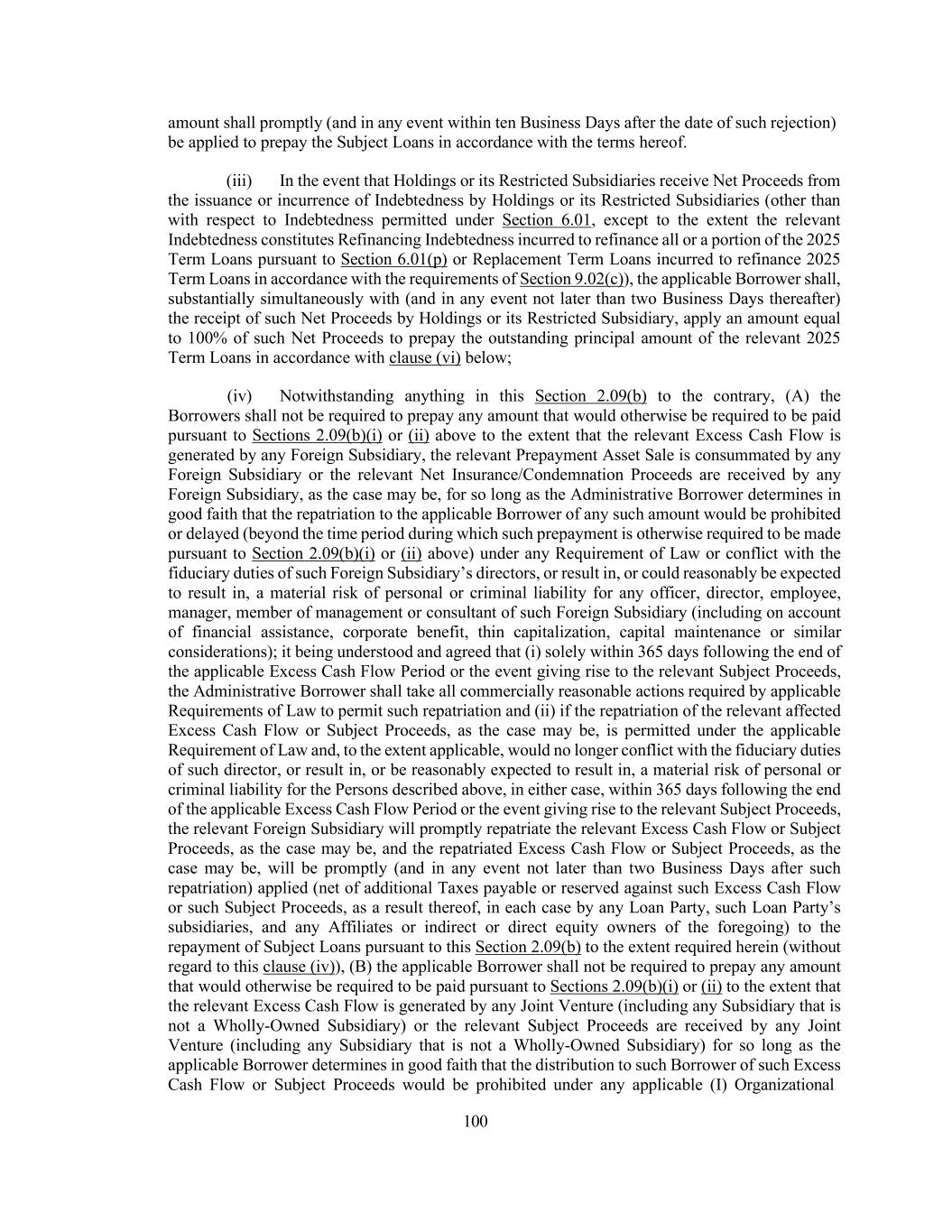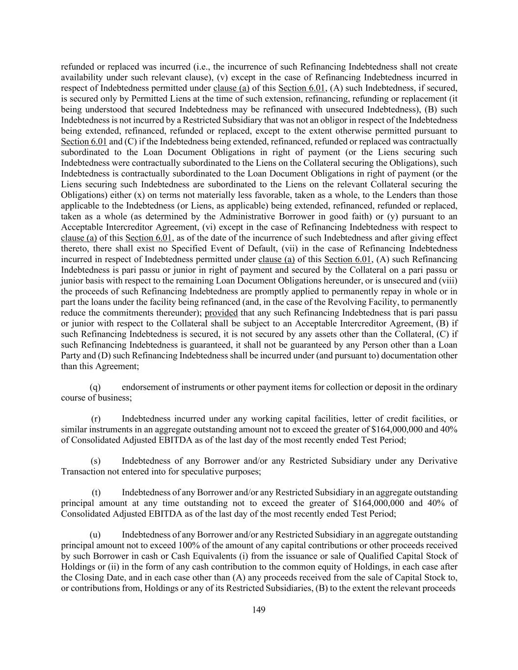 149 refunded or replaced was incurred (i.e., the incurrence of such Refinancing Indebtedness shall not create availability under such relevant clause), (v) except in the case of Refinancing Indebtedness incurred in respect of Indebtedness permitted under clause (a) of this Section 6.01, (A) such Indebtedness, if secured, is secured only by Permitted Liens at the time of such extension, refinancing, refunding or replacement (it being understood that secured Indebtedness may be refinanced with unsecured Indebtedness), (B) such Indebtedness is not incurred by a Restricted Subsidiary that was not an obligor in respect of the Indebtedness being extended, refinanced, refunded or replaced, except to the extent otherwise permitted pursuant to Section 6.01 and (C) if the Indebtedness being extended, refinanced, refunded or replaced was contractually subordinated to the Loan Document Obligations in right of payment (or the Liens securing such Indebtedness were contractually subordinated to the Liens on the Collateral securing the Obligations), such Indebtedness is contractually subordinated to the Loan Document Obligations in right of payment (or the Liens securing such Indebtedness are subordinated to the Liens on the relevant Collateral securing the Obligations) either (x) on terms not materially less favorable, taken as a whole, to the Lenders than those applicable to the Indebtedness (or Liens, as applicable) being extended, refinanced, refunded or replaced, taken as a whole (as determined by the Administrative Borrower in good faith) or (y) pursuant to an Acceptable Intercreditor Agreement, (vi) except in the case of Refinancing Indebtedness with respect to clause (a) of this Section 6.01, as of the date of the incurrence of such Indebtedness and after giving effect thereto, there shall exist no Specified Event of Default, (vii) in the case of Refinancing Indebtedness incurred in respect of Indebtedness permitted under clause (a) of this Section 6.01, (A) such Refinancing Indebtedness is pari passu or junior in right of payment and secured by the Collateral on a pari passu or junior basis with respect to the remaining Loan Document Obligations hereunder, or is unsecured and (viii) the proceeds of such Refinancing Indebtedness are promptly applied to permanently repay in whole or in part the loans under the facility being refinanced (and, in the case of the Revolving Facility, to permanently reduce the commitments thereunder); provided that any such Refinancing Indebtedness that is pari passu or junior with respect to the Collateral shall be subject to an Acceptable Intercreditor Agreement, (B) if such Refinancing Indebtedness is secured, it is not secured by any assets other than the Collateral, (C) if such Refinancing Indebtedness is guaranteed, it shall not be guaranteed by any Person other than a Loan Party and (D) such Refinancing Indebtedness shall be incurred under (and pursuant to) documentation other than this Agreement; (q) endorsement of instruments or other payment items for collection or deposit in the ordinary course of business; (r) Indebtedness incurred under any working capital facilities, letter of credit facilities, or similar instruments in an aggregate outstanding amount not to exceed the greater of $164,000,000 and 40% of Consolidated Adjusted EBITDA as of the last day of the most recently ended Test Period; (s) Indebtedness of any Borrower and/or any Restricted Subsidiary under any Derivative Transaction not entered into for speculative purposes; (t) Indebtedness of any Borrower and/or any Restricted Subsidiary in an aggregate outstanding principal amount at any time outstanding not to exceed the greater of $164,000,000 and 40% of Consolidated Adjusted EBITDA as of the last day of the most recently ended Test Period; (u) Indebtedness of any Borrower and/or any Restricted Subsidiary in an aggregate outstanding principal amount not to exceed 100% of the amount of any capital contributions or other proceeds received by such Borrower in cash or Cash Equivalents (i) from the issuance or sale of Qualified Capital Stock of Holdings or (ii) in the form of any cash contribution to the common equity of Holdings, in each case after the Closing Date, and in each case other than (A) any proceeds received from the sale of Capital Stock to, or contributions from, Holdings or any of its Restricted Subsidiaries, (B) to the extent the relevant proceeds