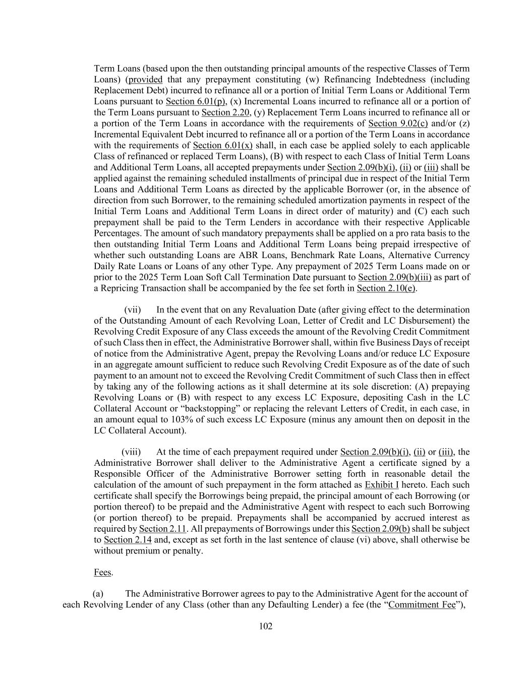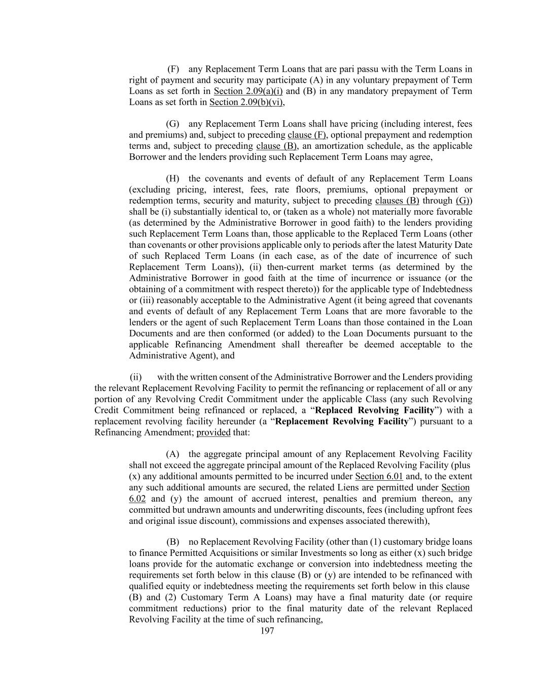 197 (F) any Replacement Term Loans that are pari passu with the Term Loans in right of payment and security may participate (A) in any voluntary prepayment of Term Loans as set forth in Section 2.09(a)(i) and (B) in any mandatory prepayment of Term Loans as set forth in Section 2.09(b)(vi), (G) any Replacement Term Loans shall have pricing (including interest, fees and premiums) and, subject to preceding clause (F), optional prepayment and redemption terms and, subject to preceding clause (B), an amortization schedule, as the applicable Borrower and the lenders providing such Replacement Term Loans may agree, (H) the covenants and events of default of any Replacement Term Loans (excluding pricing, interest, fees, rate floors, premiums, optional prepayment or redemption terms, security and maturity, subject to preceding clauses (B) through (G)) shall be (i) substantially identical to, or (taken as a whole) not materially more favorable (as determined by the Administrative Borrower in good faith) to the lenders providing such Replacement Term Loans than, those applicable to the Replaced Term Loans (other than covenants or other provisions applicable only to periods after the latest Maturity Date of such Replaced Term Loans (in each case, as of the date of incurrence of such Replacement Term Loans)), (ii) then-current market terms (as determined by the Administrative Borrower in good faith at the time of incurrence or issuance (or the obtaining of a commitment with respect thereto)) for the applicable type of Indebtedness or (iii) reasonably acceptable to the Administrative Agent (it being agreed that covenants and events of default of any Replacement Term Loans that are more favorable to the lenders or the agent of such Replacement Term Loans than those contained in the Loan Documents and are then conformed (or added) to the Loan Documents pursuant to the applicable Refinancing Amendment shall thereafter be deemed acceptable to the Administrative Agent), and (ii) with the written consent of the Administrative Borrower and the Lenders providing the relevant Replacement Revolving Facility to permit the refinancing or replacement of all or any portion of any Revolving Credit Commitment under the applicable Class (any such Revolving Credit Commitment being refinanced or replaced, a “Replaced Revolving Facility”) with a replacement revolving facility hereunder (a “Replacement Revolving Facility”) pursuant to a Refinancing Amendment; provided that: (A) the aggregate principal amount of any Replacement Revolving Facility shall not exceed the aggregate principal amount of the Replaced Revolving Facility (plus (x) any additional amounts permitted to be incurred under Section 6.01 and, to the extent any such additional amounts are secured, the related Liens are permitted under Section 6.02 and (y) the amount of accrued interest, penalties and premium thereon, any committed but undrawn amounts and underwriting discounts, fees (including upfront fees and original issue discount), commissions and expenses associated therewith), (B) no Replacement Revolving Facility (other than (1) customary bridge loans to finance Permitted Acquisitions or similar Investments so long as either (x) such bridge loans provide for the automatic exchange or conversion into indebtedness meeting the requirements set forth below in this clause (B) or (y) are intended to be refinanced with qualified equity or indebtedness meeting the requirements set forth below in this clause (B) and (2) Customary Term A Loans) may have a final maturity date (or require commitment reductions) prior to the final maturity date of the relevant Replaced Revolving Facility at the time of such refinancing,