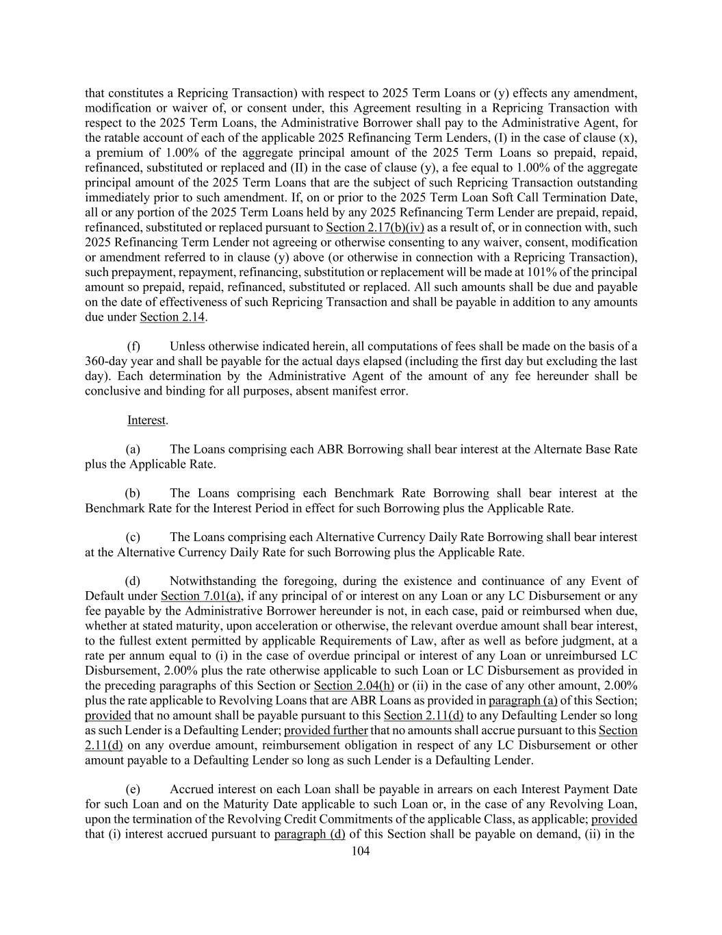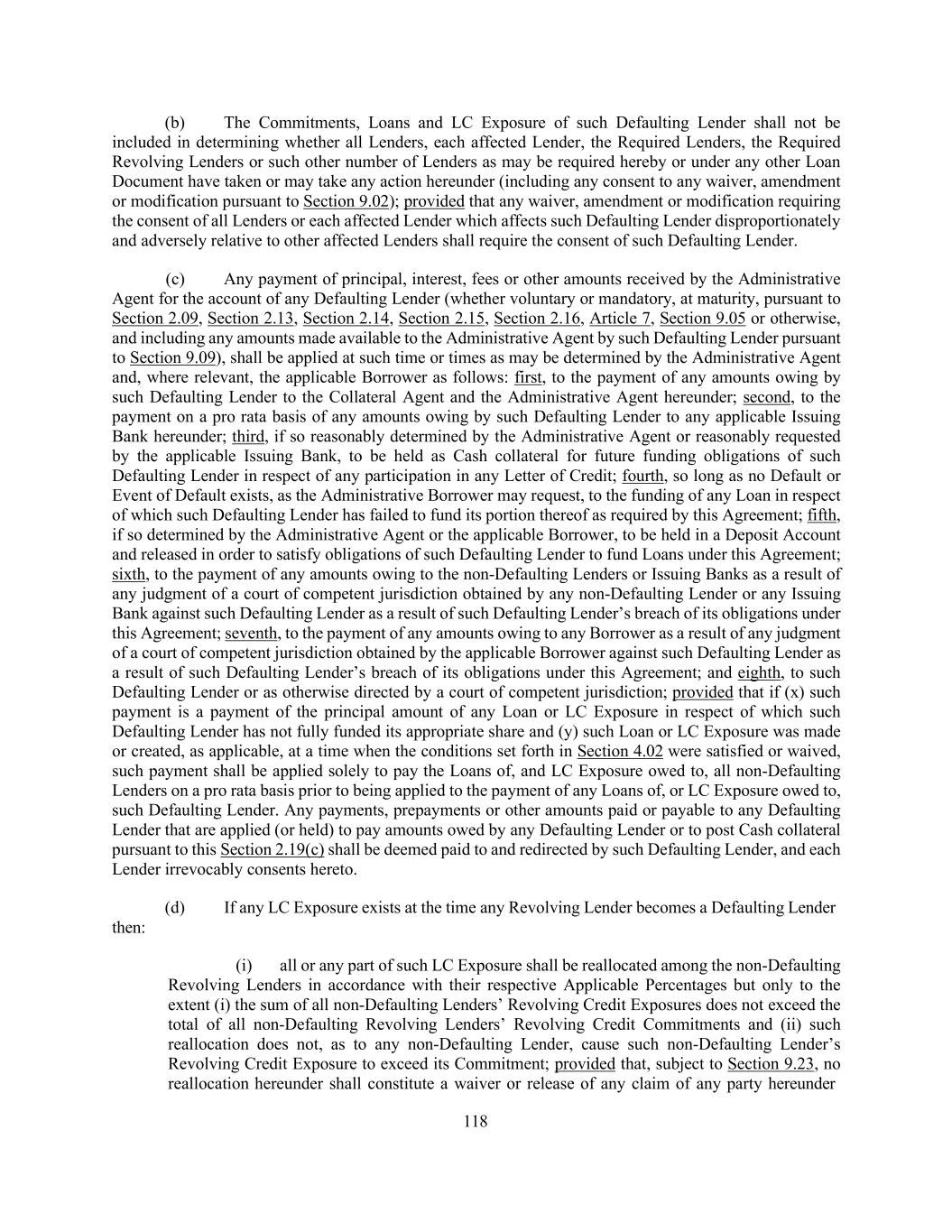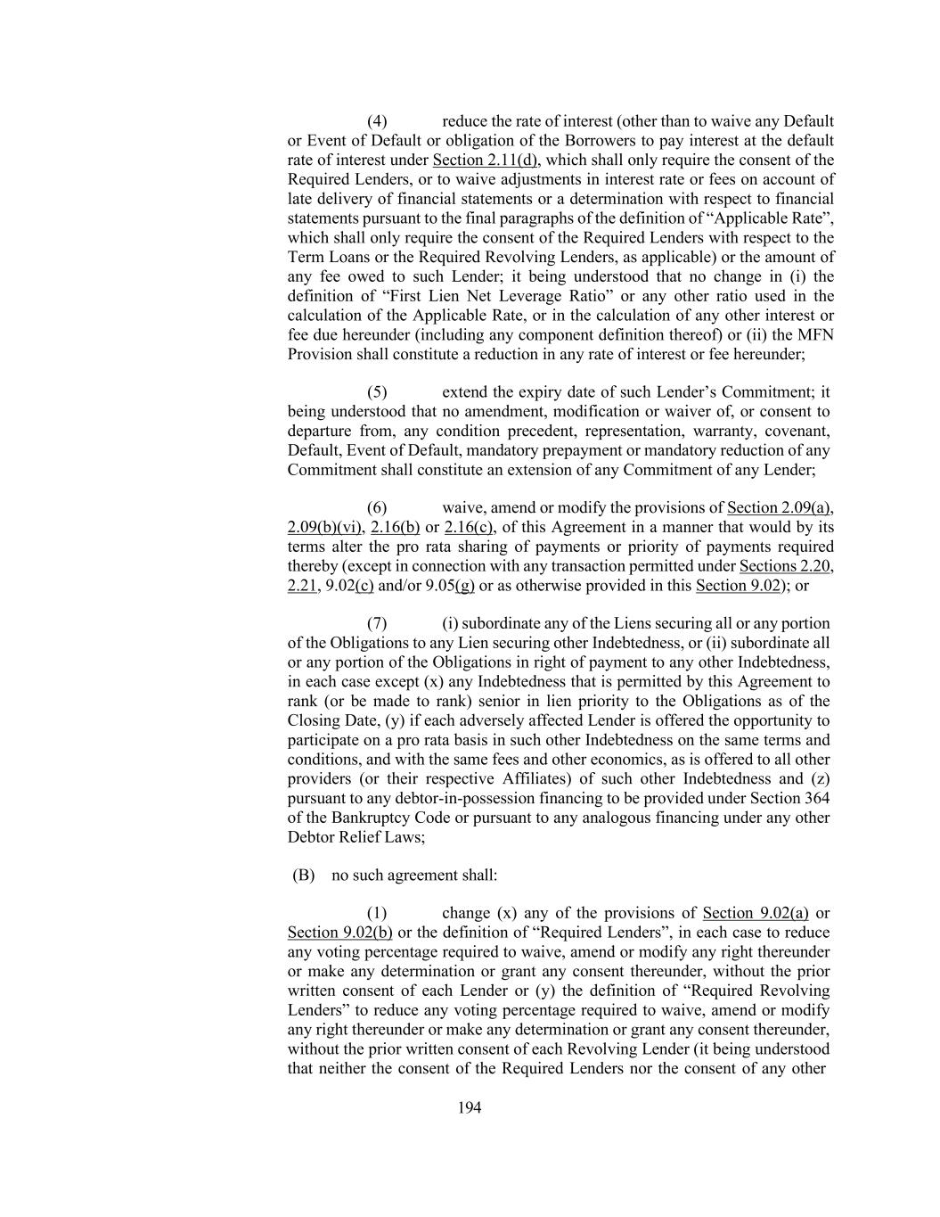 194 (4) reduce the rate of interest (other than to waive any Default or Event of Default or obligation of the Borrowers to pay interest at the default rate of interest under Section 2.11(d), which shall only require the consent of the Required Lenders, or to waive adjustments in interest rate or fees on account of late delivery of financial statements or a determination with respect to financial statements pursuant to the final paragraphs of the definition of “Applicable Rate”, which shall only require the consent of the Required Lenders with respect to the Term Loans or the Required Revolving Lenders, as applicable) or the amount of any fee owed to such Lender; it being understood that no change in (i) the definition of “First Lien Net Leverage Ratio” or any other ratio used in the calculation of the Applicable Rate, or in the calculation of any other interest or fee due hereunder (including any component definition thereof) or (ii) the MFN Provision shall constitute a reduction in any rate of interest or fee hereunder; (5) extend the expiry date of such Lender’s Commitment; it being understood that no amendment, modification or waiver of, or consent to departure from, any condition precedent, representation, warranty, covenant, Default, Event of Default, mandatory prepayment or mandatory reduction of any Commitment shall constitute an extension of any Commitment of any Lender; (6) waive, amend or modify the provisions of Section 2.09(a), 2.09(b)(vi), 2.16(b) or 2.16(c), of this Agreement in a manner that would by its terms alter the pro rata sharing of payments or priority of payments required thereby (except in connection with any transaction permitted under Sections 2.20, 2.21, 9.02(c) and/or 9.05(g) or as otherwise provided in this Section 9.02); or (7) (i) subordinate any of the Liens securing all or any portion of the Obligations to any Lien securing other Indebtedness, or (ii) subordinate all or any portion of the Obligations in right of payment to any other Indebtedness, in each case except (x) any Indebtedness that is permitted by this Agreement to rank (or be made to rank) senior in lien priority to the Obligations as of the Closing Date, (y) if each adversely affected Lender is offered the opportunity to participate on a pro rata basis in such other Indebtedness on the same terms and conditions, and with the same fees and other economics, as is offered to all other providers (or their respective Affiliates) of such other Indebtedness and (z) pursuant to any debtor-in-possession financing to be provided under Section 364 of the Bankruptcy Code or pursuant to any analogous financing under any other Debtor Relief Laws; (B) no such agreement shall: (1) change (x) any of the provisions of Section 9.02(a) or Section 9.02(b) or the definition of “Required Lenders”, in each case to reduce any voting percentage required to waive, amend or modify any right thereunder or make any determination or grant any consent thereunder, without the prior written consent of each Lender or (y) the definition of “Required Revolving Lenders” to reduce any voting percentage required to waive, amend or modify any right thereunder or make any determination or grant any consent thereunder, without the prior written consent of each Revolving Lender (it being understood that neither the consent of the Required Lenders nor the consent of any other