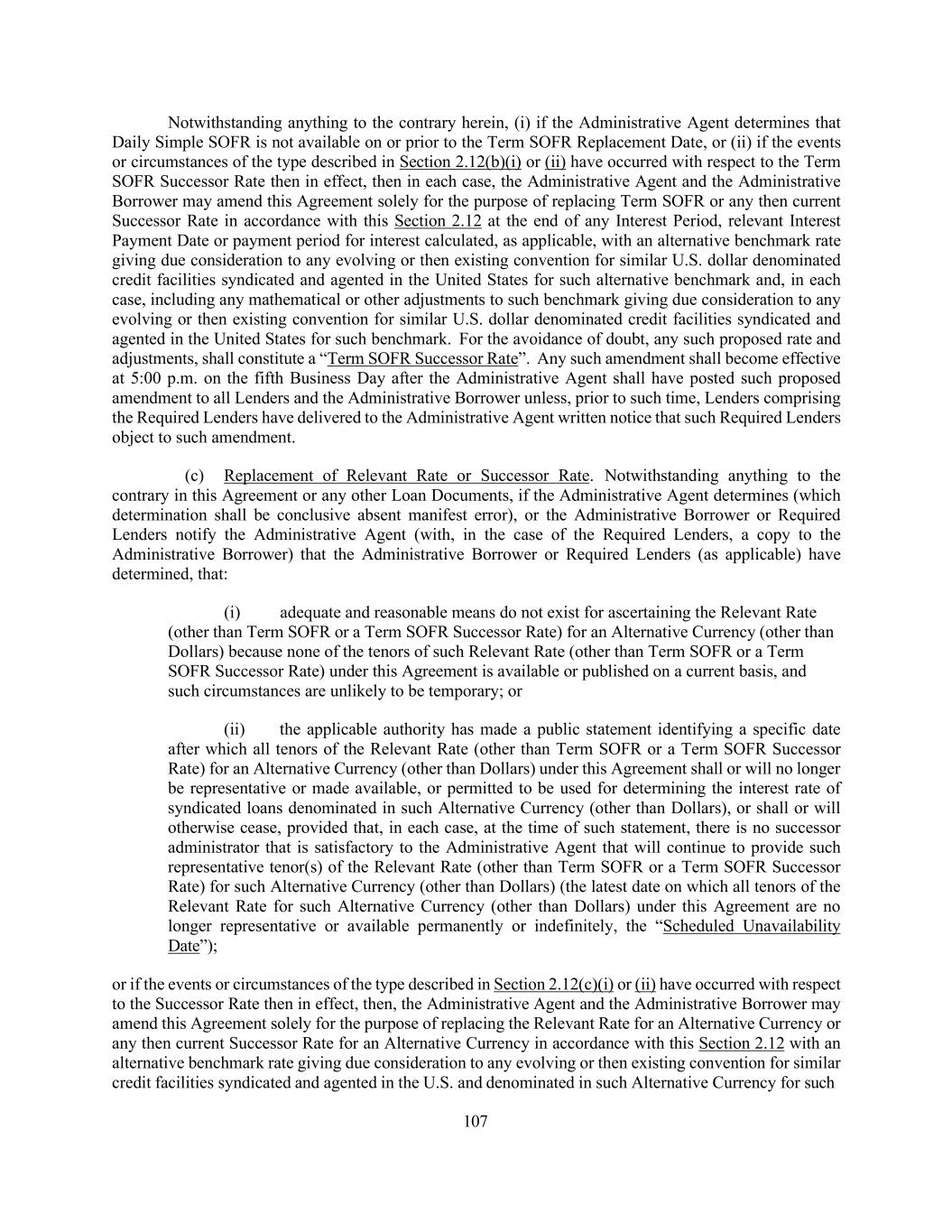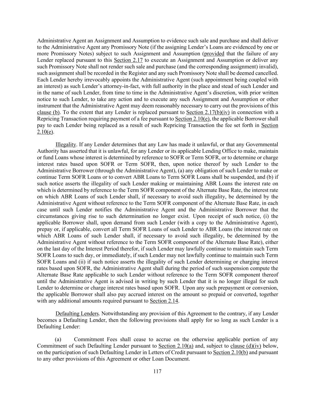209 by any Disqualified Institution shall be deemed to be not outstanding for all purposes of calculating whether the Required Lenders or all Lenders have taken any action and (y) shall be deemed to vote in the same proportion as Lenders that are not Disqualified Institutions in any proceeding under any Debtor Relief Law commenced by or against any Borrower or any other Loan Party. The rights and remedies available to any Borrower pursuant to the foregoing provisions of this Section 9.05(f) shall be in addition to injunctive relief (without posting a bond or presenting evidence of irreparable harm) or any other remedies available to any Borrower at law or in equity; it being understood and agreed that any Borrower and any subsidiaries will suffer irreparable harm if any Lender breaches any obligation under this Section 9.05 as it relates to any assignment, participation or pledge of any Loan or Commitment to any Disqualified Institution or any Affiliate thereof or any other Person to whom the Administrative Borrower’s consent is required but not obtained. Nothing in this Section 9.05(f) shall be deemed to prejudice any right or remedy that any Borrower may otherwise have at law or equity. (ii) If any assignment or participation under this Section 9.05 is made (1) to any Affiliate of any Disqualified Institution (other than any Bona Fide Debt Fund that is not itself a Disqualified Institution) or (2) to the extent the Administrative Borrower’s consent is required under this Section 9.05 (and not deemed to have been given pursuant to Section 9.05(b)(i)(A)), to any other Person, in each case of clauses (1) and (2) without the Administrative Borrower’s prior written consent (any such person, a “Disqualified Person”), then the Administrative Borrower may, at its sole expense and effort, upon notice to the applicable Disqualified Person and the Administrative Agent, (A) terminate any Commitment of such Disqualified Person and repay all obligations of any Borrower owing to such Disqualified Person, (B) in the case of any outstanding Term Loans held by such Disqualified Person, purchase such Term Loans by paying the lesser of (x) par and (y) the amount that such Disqualified Person paid to acquire such Term Loans, plus accrued interest thereon, accrued fees and all other amounts payable to it hereunder and/or (C) require such Disqualified Person to assign, without recourse (in accordance with and subject to the restrictions contained in this Section 9.05), all of its interests, rights and obligations under this Agreement to one or more Eligible Assignees and if such person does not execute and deliver to the Administrative Agent a duly executed Assignment Agreement reflecting such assignment within five Business Days of the date on which the Eligible Assignee executes and delivers such Assignment Agreement to such person, then such person shall be deemed to have executed and delivered such Assignment Agreement without any action on its part; provided that (I) in the case of clauses (A) and (B), no Borrower shall not be liable to the relevant Disqualified Person under Section 2.14 if any Daily Simple SOFR Loan owing to such Disqualified Person is repaid or purchased other than on the last day of the Interest Period relating thereto, (II) in the case of clause (C), the relevant assignment shall otherwise comply with this Section 9.05 (except that no registration and processing fee required under this Section 9.05 shall be required with any assignment pursuant to this paragraph. Further, any Disqualified Person identified by the Administrative Borrower to the Administrative Agent (A) shall not be permitted to (x) receive information or reporting provided by any Loan Party, the Administrative Agent or any Lender and/or (y) attend and/or participate in conference calls or meetings attended solely by the Lenders and the Administrative Agent, (B) (x) shall not for purposes of determining whether the Required Lenders or the majority Lenders under any Class have (i) consented (or not consented) to any amendment, modification, waiver, consent or other action with respect to any of the terms of any Loan Document or any departure by any Loan Party therefrom, (ii) otherwise acted on any matter related to any Loan Document or (iii) directed or required the Administrative Agent or any Lender to undertake any action (or refrain from taking any action) with respect to or under any Loan Document, have a right to consent (or not consent), otherwise act or direct or require the Administrative Agent or any Lender to take (or refrain from taking) any such action; it being