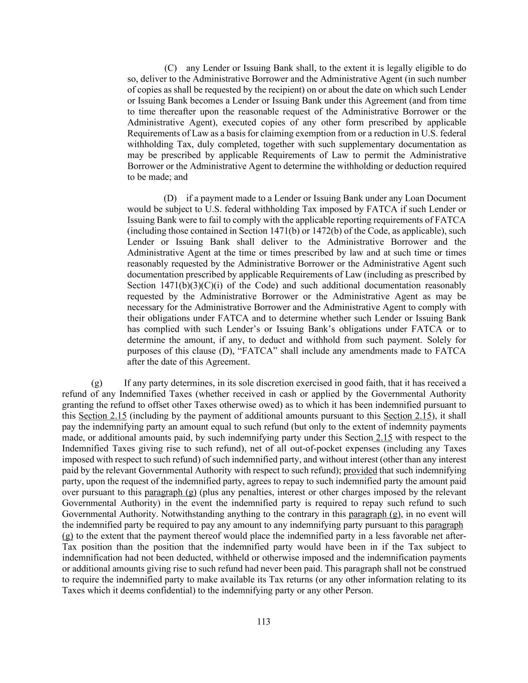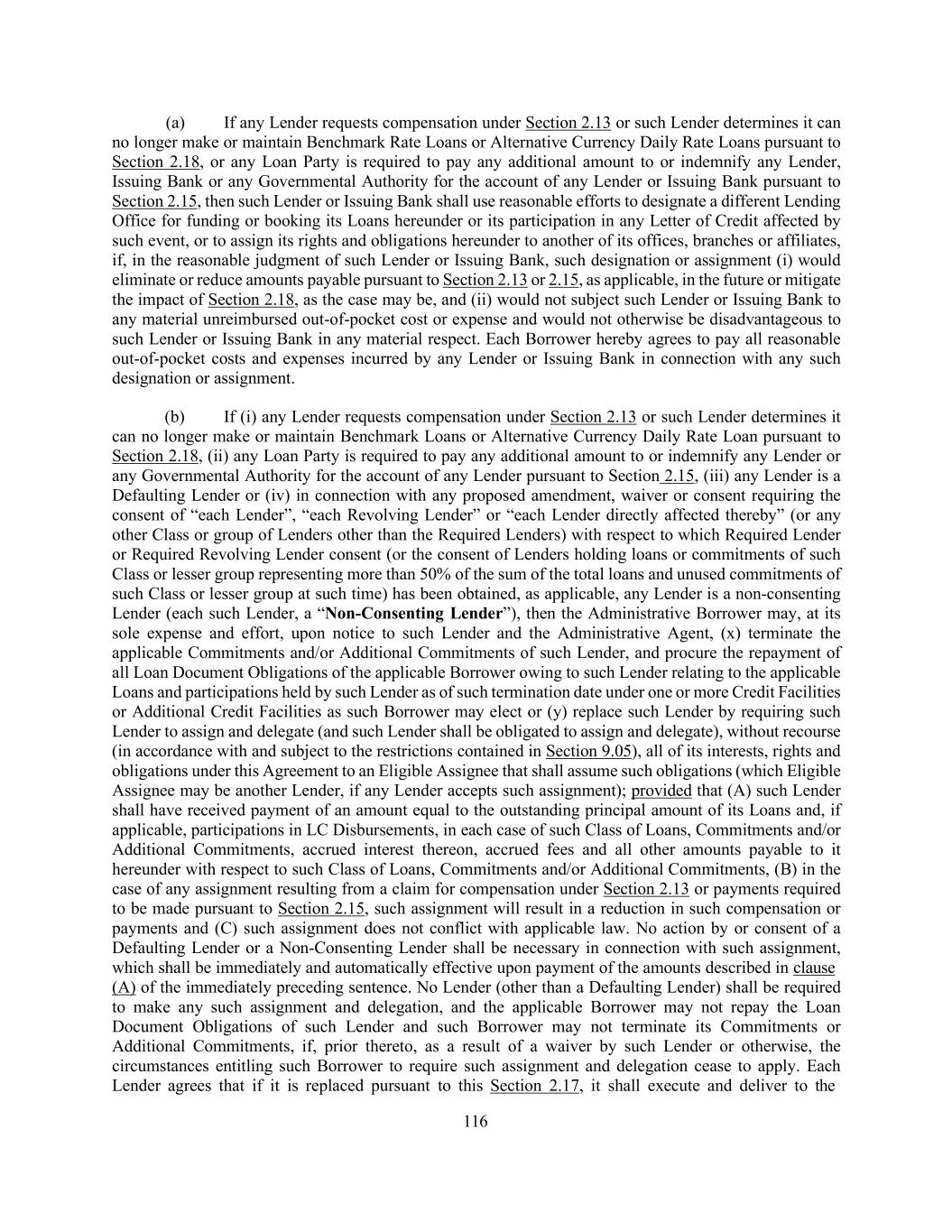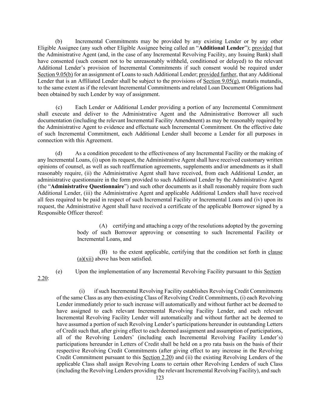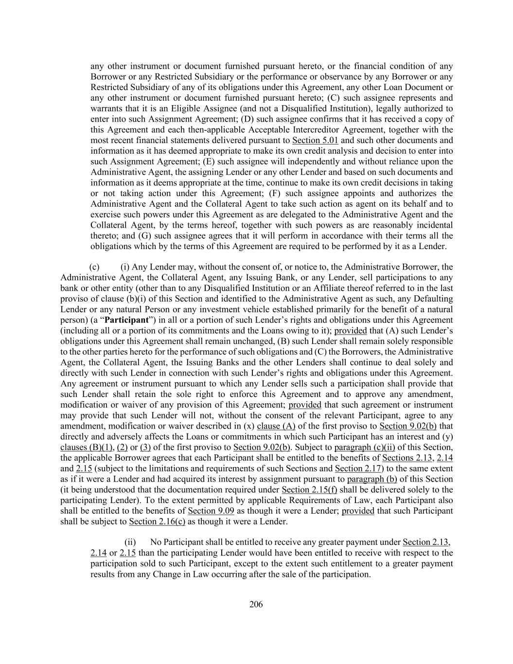 206 any other instrument or document furnished pursuant hereto, or the financial condition of any Borrower or any Restricted Subsidiary or the performance or observance by any Borrower or any Restricted Subsidiary of any of its obligations under this Agreement, any other Loan Document or any other instrument or document furnished pursuant hereto; (C) such assignee represents and warrants that it is an Eligible Assignee (and not a Disqualified Institution), legally authorized to enter into such Assignment Agreement; (D) such assignee confirms that it has received a copy of this Agreement and each then-applicable Acceptable Intercreditor Agreement, together with the most recent financial statements delivered pursuant to Section 5.01 and such other documents and information as it has deemed appropriate to make its own credit analysis and decision to enter into such Assignment Agreement; (E) such assignee will independently and without reliance upon the Administrative Agent, the assigning Lender or any other Lender and based on such documents and information as it deems appropriate at the time, continue to make its own credit decisions in taking or not taking action under this Agreement; (F) such assignee appoints and authorizes the Administrative Agent and the Collateral Agent to take such action as agent on its behalf and to exercise such powers under this Agreement as are delegated to the Administrative Agent and the Collateral Agent, by the terms hereof, together with such powers as are reasonably incidental thereto; and (G) such assignee agrees that it will perform in accordance with their terms all the obligations which by the terms of this Agreement are required to be performed by it as a Lender. (c) (i) Any Lender may, without the consent of, or notice to, the Administrative Borrower, the Administrative Agent, the Collateral Agent, any Issuing Bank, or any Lender, sell participations to any bank or other entity (other than to any Disqualified Institution or an Affiliate thereof referred to in the last proviso of clause (b)(i) of this Section and identified to the Administrative Agent as such, any Defaulting Lender or any natural Person or any investment vehicle established primarily for the benefit of a natural person) (a “Participant”) in all or a portion of such Lender’s rights and obligations under this Agreement (including all or a portion of its commitments and the Loans owing to it); provided that (A) such Lender’s obligations under this Agreement shall remain unchanged, (B) such Lender shall remain solely responsible to the other parties hereto for the performance of such obligations and (C) the Borrowers, the Administrative Agent, the Collateral Agent, the Issuing Banks and the other Lenders shall continue to deal solely and directly with such Lender in connection with such Lender’s rights and obligations under this Agreement. Any agreement or instrument pursuant to which any Lender sells such a participation shall provide that such Lender shall retain the sole right to enforce this Agreement and to approve any amendment, modification or waiver of any provision of this Agreement; provided that such agreement or instrument may provide that such Lender will not, without the consent of the relevant Participant, agree to any amendment, modification or waiver described in (x) clause (A) of the first proviso to Section 9.02(b) that directly and adversely affects the Loans or commitments in which such Participant has an interest and (y) clauses (B)(1), (2) or (3) of the first proviso to Section 9.02(b). Subject to paragraph (c)(ii) of this Section, the applicable Borrower agrees that each Participant shall be entitled to the benefits of Sections 2.13, 2.14 and 2.15 (subject to the limitations and requirements of such Sections and Section 2.17) to the same extent as if it were a Lender and had acquired its interest by assignment pursuant to paragraph (b) of this Section (it being understood that the documentation required under Section 2.15(f) shall be delivered solely to the participating Lender). To the extent permitted by applicable Requirements of Law, each Participant also shall be entitled to the benefits of Section 9.09 as though it were a Lender; provided that such Participant shall be subject to Section 2.16(c) as though it were a Lender. (ii) No Participant shall be entitled to receive any greater payment under Section 2.13, 2.14 or 2.15 than the participating Lender would have been entitled to receive with respect to the participation sold to such Participant, except to the extent such entitlement to a greater payment results from any Change in Law occurring after the sale of the participation.