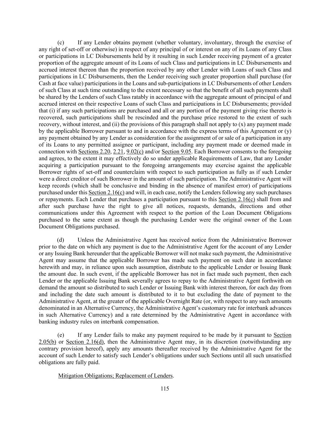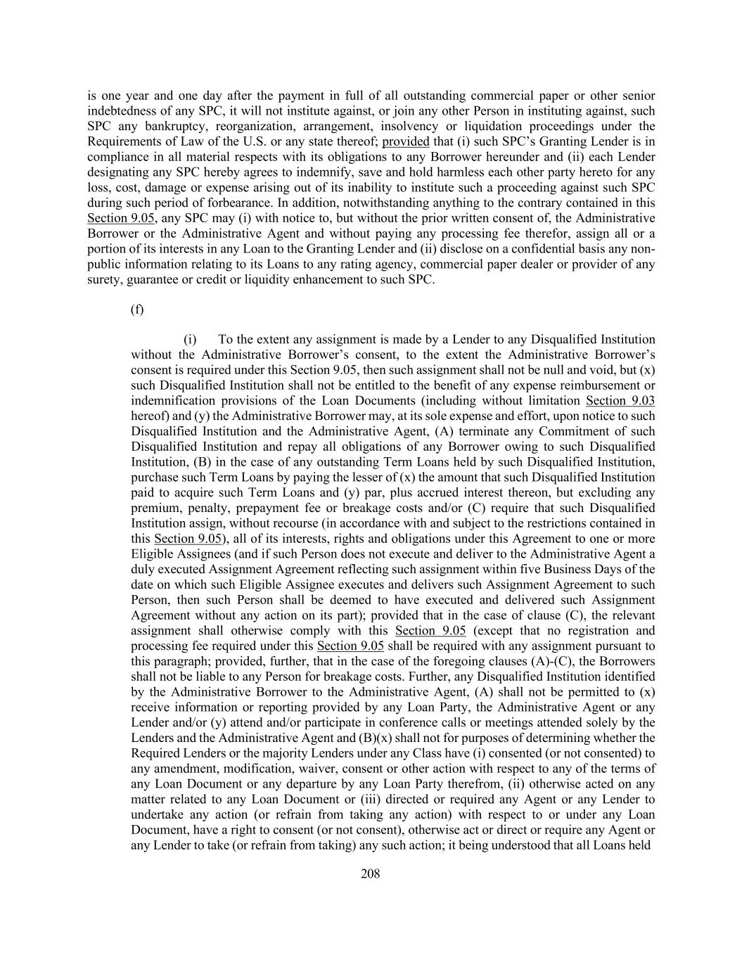 208 is one year and one day after the payment in full of all outstanding commercial paper or other senior indebtedness of any SPC, it will not institute against, or join any other Person in instituting against, such SPC any bankruptcy, reorganization, arrangement, insolvency or liquidation proceedings under the Requirements of Law of the U.S. or any state thereof; provided that (i) such SPC’s Granting Lender is in compliance in all material respects with its obligations to any Borrower hereunder and (ii) each Lender designating any SPC hereby agrees to indemnify, save and hold harmless each other party hereto for any loss, cost, damage or expense arising out of its inability to institute such a proceeding against such SPC during such period of forbearance. In addition, notwithstanding anything to the contrary contained in this Section 9.05, any SPC may (i) with notice to, but without the prior written consent of, the Administrative Borrower or the Administrative Agent and without paying any processing fee therefor, assign all or a portion of its interests in any Loan to the Granting Lender and (ii) disclose on a confidential basis any non- public information relating to its Loans to any rating agency, commercial paper dealer or provider of any surety, guarantee or credit or liquidity enhancement to such SPC. (f) (i) To the extent any assignment is made by a Lender to any Disqualified Institution without the Administrative Borrower’s consent, to the extent the Administrative Borrower’s consent is required under this Section 9.05, then such assignment shall not be null and void, but (x) such Disqualified Institution shall not be entitled to the benefit of any expense reimbursement or indemnification provisions of the Loan Documents (including without limitation Section 9.03 hereof) and (y) the Administrative Borrower may, at its sole expense and effort, upon notice to such Disqualified Institution and the Administrative Agent, (A) terminate any Commitment of such Disqualified Institution and repay all obligations of any Borrower owing to such Disqualified Institution, (B) in the case of any outstanding Term Loans held by such Disqualified Institution, purchase such Term Loans by paying the lesser of (x) the amount that such Disqualified Institution paid to acquire such Term Loans and (y) par, plus accrued interest thereon, but excluding any premium, penalty, prepayment fee or breakage costs and/or (C) require that such Disqualified Institution assign, without recourse (in accordance with and subject to the restrictions contained in this Section 9.05), all of its interests, rights and obligations under this Agreement to one or more Eligible Assignees (and if such Person does not execute and deliver to the Administrative Agent a duly executed Assignment Agreement reflecting such assignment within five Business Days of the date on which such Eligible Assignee executes and delivers such Assignment Agreement to such Person, then such Person shall be deemed to have executed and delivered such Assignment Agreement without any action on its part); provided that in the case of clause (C), the relevant assignment shall otherwise comply with this Section 9.05 (except that no registration and processing fee required under this Section 9.05 shall be required with any assignment pursuant to this paragraph; provided, further, that in the case of the foregoing clauses (A)-(C), the Borrowers shall not be liable to any Person for breakage costs. Further, any Disqualified Institution identified by the Administrative Borrower to the Administrative Agent, (A) shall not be permitted to (x) receive information or reporting provided by any Loan Party, the Administrative Agent or any Lender and/or (y) attend and/or participate in conference calls or meetings attended solely by the Lenders and the Administrative Agent and (B)(x) shall not for purposes of determining whether the Required Lenders or the majority Lenders under any Class have (i) consented (or not consented) to any amendment, modification, waiver, consent or other action with respect to any of the terms of any Loan Document or any departure by any Loan Party therefrom, (ii) otherwise acted on any matter related to any Loan Document or (iii) directed or required any Agent or any Lender to undertake any action (or refrain from taking any action) with respect to or under any Loan Document, have a right to consent (or not consent), otherwise act or direct or require any Agent or any Lender to take (or refrain from taking) any such action; it being understood that all Loans held