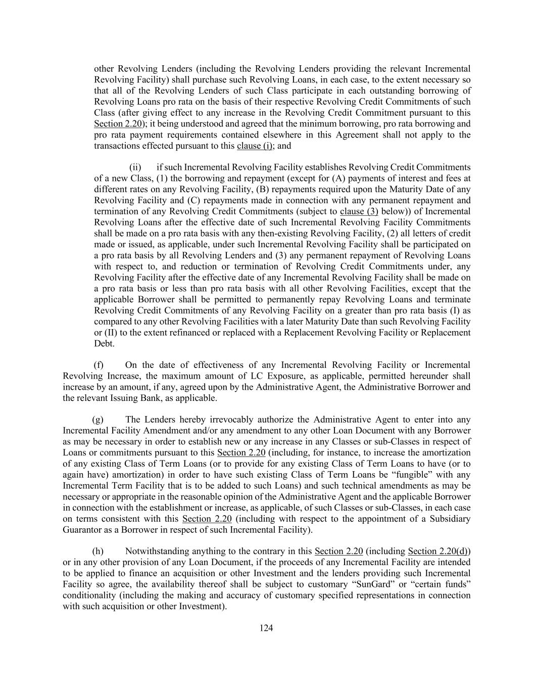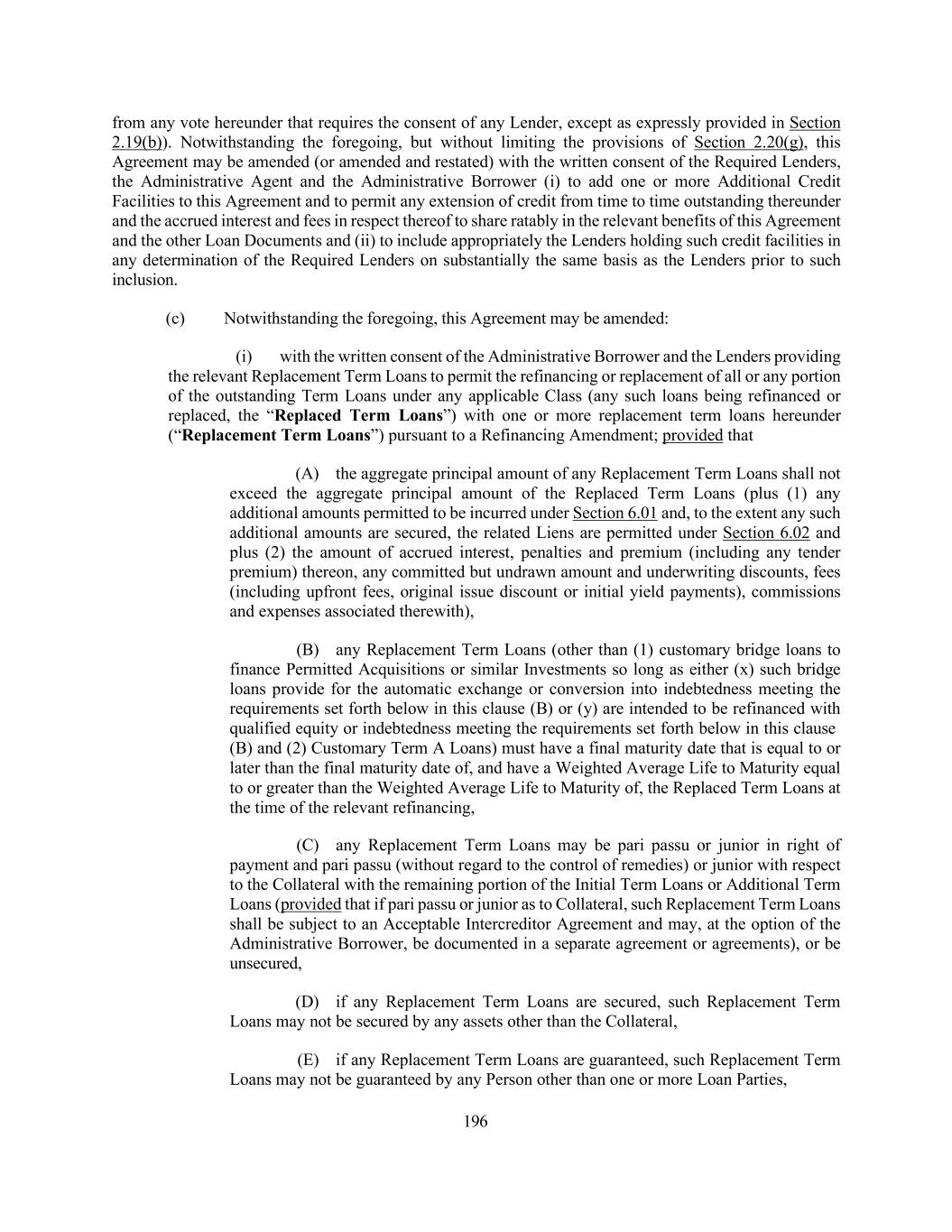 196 from any vote hereunder that requires the consent of any Lender, except as expressly provided in Section 2.19(b)). Notwithstanding the foregoing, but without limiting the provisions of Section 2.20(g), this Agreement may be amended (or amended and restated) with the written consent of the Required Lenders, the Administrative Agent and the Administrative Borrower (i) to add one or more Additional Credit Facilities to this Agreement and to permit any extension of credit from time to time outstanding thereunder and the accrued interest and fees in respect thereof to share ratably in the relevant benefits of this Agreement and the other Loan Documents and (ii) to include appropriately the Lenders holding such credit facilities in any determination of the Required Lenders on substantially the same basis as the Lenders prior to such inclusion. (c) Notwithstanding the foregoing, this Agreement may be amended: (i) with the written consent of the Administrative Borrower and the Lenders providing the relevant Replacement Term Loans to permit the refinancing or replacement of all or any portion of the outstanding Term Loans under any applicable Class (any such loans being refinanced or replaced, the “Replaced Term Loans”) with one or more replacement term loans hereunder (“Replacement Term Loans”) pursuant to a Refinancing Amendment; provided that (A) the aggregate principal amount of any Replacement Term Loans shall not exceed the aggregate principal amount of the Replaced Term Loans (plus (1) any additional amounts permitted to be incurred under Section 6.01 and, to the extent any such additional amounts are secured, the related Liens are permitted under Section 6.02 and plus (2) the amount of accrued interest, penalties and premium (including any tender premium) thereon, any committed but undrawn amount and underwriting discounts, fees (including upfront fees, original issue discount or initial yield payments), commissions and expenses associated therewith), (B) any Replacement Term Loans (other than (1) customary bridge loans to finance Permitted Acquisitions or similar Investments so long as either (x) such bridge loans provide for the automatic exchange or conversion into indebtedness meeting the requirements set forth below in this clause (B) or (y) are intended to be refinanced with qualified equity or indebtedness meeting the requirements set forth below in this clause (B) and (2) Customary Term A Loans) must have a final maturity date that is equal to or later than the final maturity date of, and have a Weighted Average Life to Maturity equal to or greater than the Weighted Average Life to Maturity of, the Replaced Term Loans at the time of the relevant refinancing, (C) any Replacement Term Loans may be pari passu or junior in right of payment and pari passu (without regard to the control of remedies) or junior with respect to the Collateral with the remaining portion of the Initial Term Loans or Additional Term Loans (provided that if pari passu or junior as to Collateral, such Replacement Term Loans shall be subject to an Acceptable Intercreditor Agreement and may, at the option of the Administrative Borrower, be documented in a separate agreement or agreements), or be unsecured, (D) if any Replacement Term Loans are secured, such Replacement Term Loans may not be secured by any assets other than the Collateral, (E) if any Replacement Term Loans are guaranteed, such Replacement Term Loans may not be guaranteed by any Person other than one or more Loan Parties,