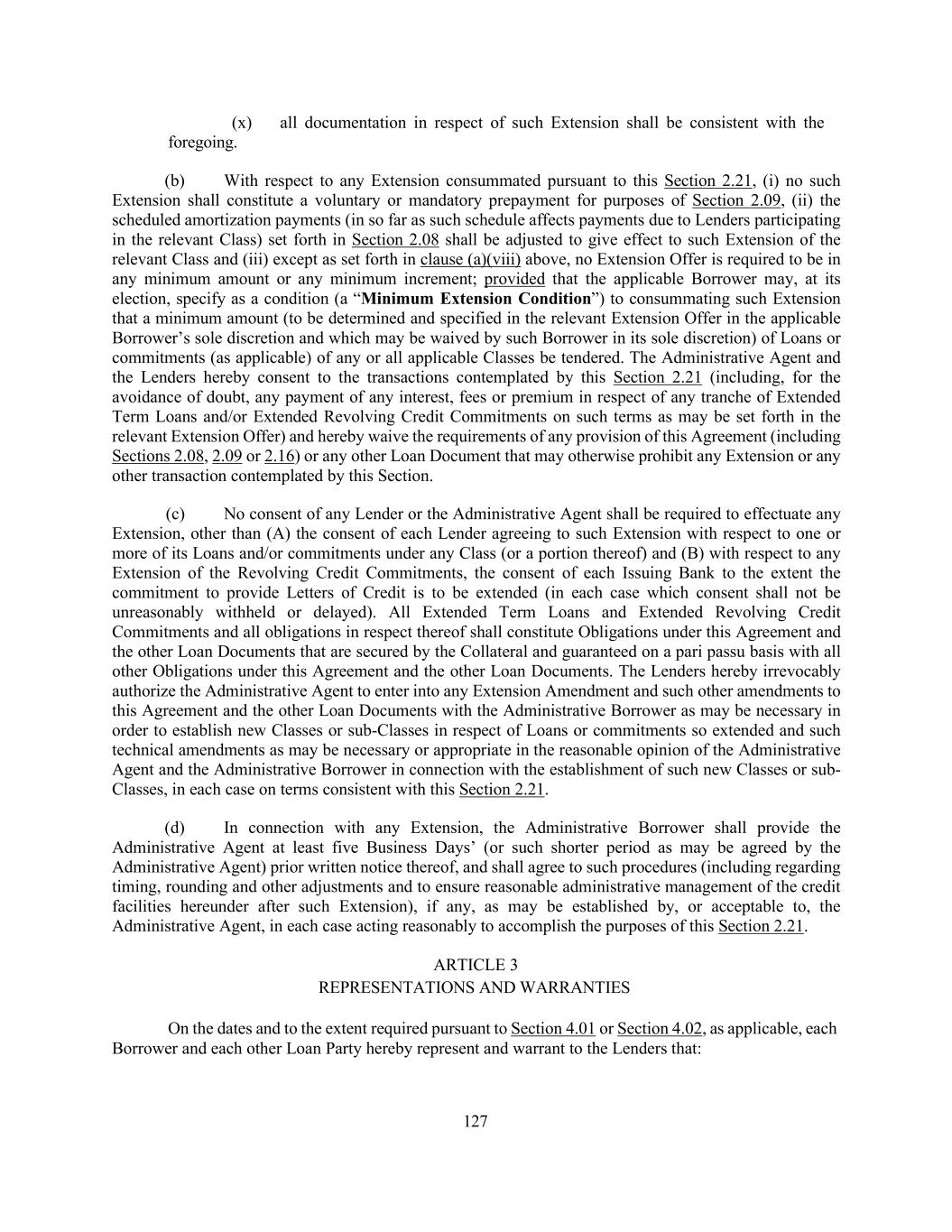 127 (x) all documentation in respect of such Extension shall be consistent with the foregoing. (b) With respect to any Extension consummated pursuant to this Section 2.21, (i) no such Extension shall constitute a voluntary or mandatory prepayment for purposes of Section 2.09, (ii) the scheduled amortization payments (in so far as such schedule affects payments due to Lenders participating in the relevant Class) set forth in Section 2.08 shall be adjusted to give effect to such Extension of the relevant Class and (iii) except as set forth in clause (a)(viii) above, no Extension Offer is required to be in any minimum amount or any minimum increment; provided that the applicable Borrower may, at its election, specify as a condition (a “Minimum Extension Condition”) to consummating such Extension that a minimum amount (to be determined and specified in the relevant Extension Offer in the applicable Borrower’s sole discretion and which may be waived by such Borrower in its sole discretion) of Loans or commitments (as applicable) of any or all applicable Classes be tendered. The Administrative Agent and the Lenders hereby consent to the transactions contemplated by this Section 2.21 (including, for the avoidance of doubt, any payment of any interest, fees or premium in respect of any tranche of Extended Term Loans and/or Extended Revolving Credit Commitments on such terms as may be set forth in the relevant Extension Offer) and hereby waive the requirements of any provision of this Agreement (including Sections 2.08, 2.09 or 2.16) or any other Loan Document that may otherwise prohibit any Extension or any other transaction contemplated by this Section. (c) No consent of any Lender or the Administrative Agent shall be required to effectuate any Extension, other than (A) the consent of each Lender agreeing to such Extension with respect to one or more of its Loans and/or commitments under any Class (or a portion thereof) and (B) with respect to any Extension of the Revolving Credit Commitments, the consent of each Issuing Bank to the extent the commitment to provide Letters of Credit is to be extended (in each case which consent shall not be unreasonably withheld or delayed). All Extended Term Loans and Extended Revolving Credit Commitments and all obligations in respect thereof shall constitute Obligations under this Agreement and the other Loan Documents that are secured by the Collateral and guaranteed on a pari passu basis with all other Obligations under this Agreement and the other Loan Documents. The Lenders hereby irrevocably authorize the Administrative Agent to enter into any Extension Amendment and such other amendments to this Agreement and the other Loan Documents with the Administrative Borrower as may be necessary in order to establish new Classes or sub-Classes in respect of Loans or commitments so extended and such technical amendments as may be necessary or appropriate in the reasonable opinion of the Administrative Agent and the Administrative Borrower in connection with the establishment of such new Classes or sub- Classes, in each case on terms consistent with this Section 2.21. (d) In connection with any Extension, the Administrative Borrower shall provide the Administrative Agent at least five Business Days’ (or such shorter period as may be agreed by the Administrative Agent) prior written notice thereof, and shall agree to such procedures (including regarding timing, rounding and other adjustments and to ensure reasonable administrative management of the credit facilities hereunder after such Extension), if any, as may be established by, or acceptable to, the Administrative Agent, in each case acting reasonably to accomplish the purposes of this Section 2.21. ARTICLE 3 REPRESENTATIONS AND WARRANTIES On the dates and to the extent required pursuant to Section 4.01 or Section 4.02, as applicable, each Borrower and each other Loan Party hereby represent and warrant to the Lenders that: