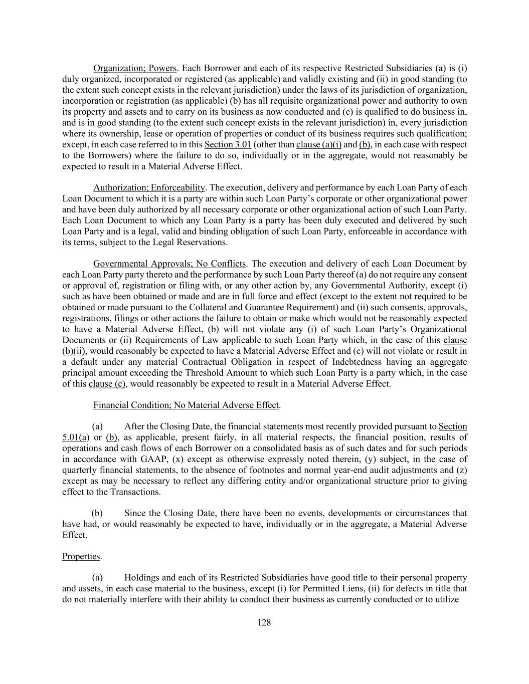 128 Organization; Powers. Each Borrower and each of its respective Restricted Subsidiaries (a) is (i) duly organized, incorporated or registered (as applicable) and validly existing and (ii) in good standing (to the extent such concept exists in the relevant jurisdiction) under the laws of its jurisdiction of organization, incorporation or registration (as applicable) (b) has all requisite organizational power and authority to own its property and assets and to carry on its business as now conducted and (c) is qualified to do business in, and is in good standing (to the extent such concept exists in the relevant jurisdiction) in, every jurisdiction where its ownership, lease or operation of properties or conduct of its business requires such qualification; except, in each case referred to in this Section 3.01 (other than clause (a)(i) and (b), in each case with respect to the Borrowers) where the failure to do so, individually or in the aggregate, would not reasonably be expected to result in a Material Adverse Effect. Authorization; Enforceability. The execution, delivery and performance by each Loan Party of each Loan Document to which it is a party are within such Loan Party’s corporate or other organizational power and have been duly authorized by all necessary corporate or other organizational action of such Loan Party. Each Loan Document to which any Loan Party is a party has been duly executed and delivered by such Loan Party and is a legal, valid and binding obligation of such Loan Party, enforceable in accordance with its terms, subject to the Legal Reservations. Governmental Approvals; No Conflicts. The execution and delivery of each Loan Document by each Loan Party party thereto and the performance by such Loan Party thereof (a) do not require any consent or approval of, registration or filing with, or any other action by, any Governmental Authority, except (i) such as have been obtained or made and are in full force and effect (except to the extent not required to be obtained or made pursuant to the Collateral and Guarantee Requirement) and (ii) such consents, approvals, registrations, filings or other actions the failure to obtain or make which would not be reasonably expected to have a Material Adverse Effect, (b) will not violate any (i) of such Loan Party’s Organizational Documents or (ii) Requirements of Law applicable to such Loan Party which, in the case of this clause (b)(ii), would reasonably be expected to have a Material Adverse Effect and (c) will not violate or result in a default under any material Contractual Obligation in respect of Indebtedness having an aggregate principal amount exceeding the Threshold Amount to which such Loan Party is a party which, in the case of this clause (c), would reasonably be expected to result in a Material Adverse Effect. Financial Condition; No Material Adverse Effect. (a) After the Closing Date, the financial statements most recently provided pursuant to Section 5.01(a) or (b), as applicable, present fairly, in all material respects, the financial position, results of operations and cash flows of each Borrower on a consolidated basis as of such dates and for such periods in accordance with GAAP, (x) except as otherwise expressly noted therein, (y) subject, in the case of quarterly financial statements, to the absence of footnotes and normal year-end audit adjustments and (z) except as may be necessary to reflect any differing entity and/or organizational structure prior to giving effect to the Transactions. (b) Since the Closing Date, there have been no events, developments or circumstances that have had, or would reasonably be expected to have, individually or in the aggregate, a Material Adverse Effect. Properties. (a) Holdings and each of its Restricted Subsidiaries have good title to their personal property and assets, in each case material to the business, except (i) for Permitted Liens, (ii) for defects in title that do not materially interfere with their ability to conduct their business as currently conducted or to utilize