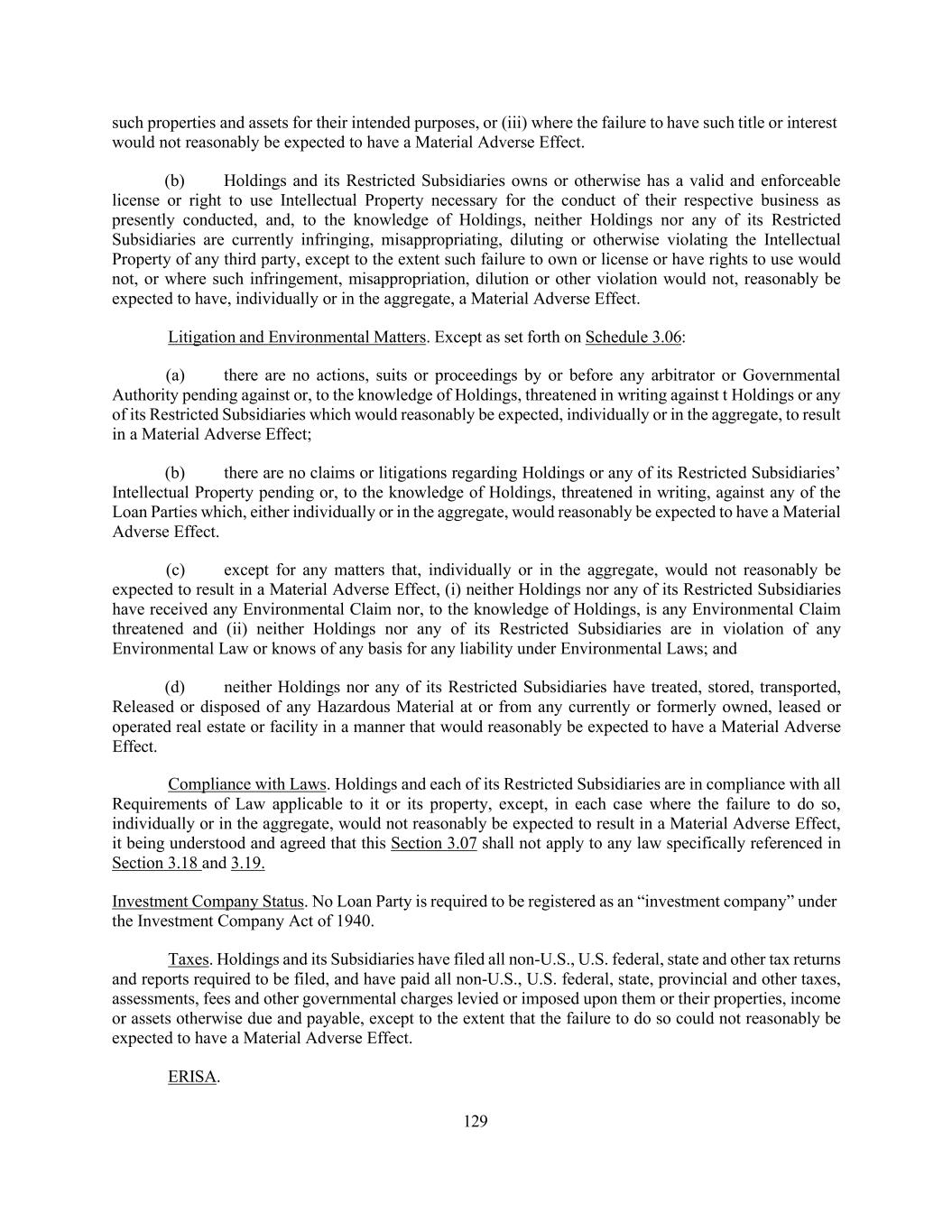 129 such properties and assets for their intended purposes, or (iii) where the failure to have such title or interest would not reasonably be expected to have a Material Adverse Effect. (b) Holdings and its Restricted Subsidiaries owns or otherwise has a valid and enforceable license or right to use Intellectual Property necessary for the conduct of their respective business as presently conducted, and, to the knowledge of Holdings, neither Holdings nor any of its Restricted Subsidiaries are currently infringing, misappropriating, diluting or otherwise violating the Intellectual Property of any third party, except to the extent such failure to own or license or have rights to use would not, or where such infringement, misappropriation, dilution or other violation would not, reasonably be expected to have, individually or in the aggregate, a Material Adverse Effect. Litigation and Environmental Matters. Except as set forth on Schedule 3.06: (a) there are no actions, suits or proceedings by or before any arbitrator or Governmental Authority pending against or, to the knowledge of Holdings, threatened in writing against t Holdings or any of its Restricted Subsidiaries which would reasonably be expected, individually or in the aggregate, to result in a Material Adverse Effect; (b) there are no claims or litigations regarding Holdings or any of its Restricted Subsidiaries’ Intellectual Property pending or, to the knowledge of Holdings, threatened in writing, against any of the Loan Parties which, either individually or in the aggregate, would reasonably be expected to have a Material Adverse Effect. (c) except for any matters that, individually or in the aggregate, would not reasonably be expected to result in a Material Adverse Effect, (i) neither Holdings nor any of its Restricted Subsidiaries have received any Environmental Claim nor, to the knowledge of Holdings, is any Environmental Claim threatened and (ii) neither Holdings nor any of its Restricted Subsidiaries are in violation of any Environmental Law or knows of any basis for any liability under Environmental Laws; and (d) neither Holdings nor any of its Restricted Subsidiaries have treated, stored, transported, Released or disposed of any Hazardous Material at or from any currently or formerly owned, leased or operated real estate or facility in a manner that would reasonably be expected to have a Material Adverse Effect. Compliance with Laws. Holdings and each of its Restricted Subsidiaries are in compliance with all Requirements of Law applicable to it or its property, except, in each case where the failure to do so, individually or in the aggregate, would not reasonably be expected to result in a Material Adverse Effect, it being understood and agreed that this Section 3.07 shall not apply to any law specifically referenced in Section 3.18 and 3.19. Investment Company Status. No Loan Party is required to be registered as an “investment company” under the Investment Company Act of 1940. Taxes. Holdings and its Subsidiaries have filed all non-U.S., U.S. federal, state and other tax returns and reports required to be filed, and have paid all non-U.S., U.S. federal, state, provincial and other taxes, assessments, fees and other governmental charges levied or imposed upon them or their properties, income or assets otherwise due and payable, except to the extent that the failure to do so could not reasonably be expected to have a Material Adverse Effect. ERISA.