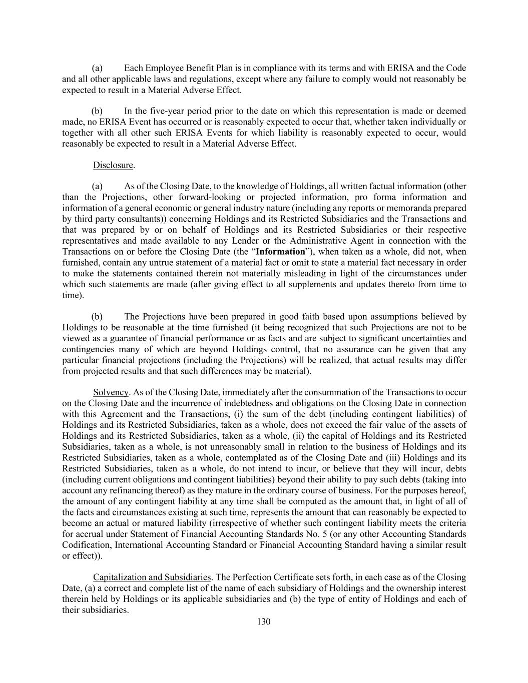 130 (a) Each Employee Benefit Plan is in compliance with its terms and with ERISA and the Code and all other applicable laws and regulations, except where any failure to comply would not reasonably be expected to result in a Material Adverse Effect. (b) In the five-year period prior to the date on which this representation is made or deemed made, no ERISA Event has occurred or is reasonably expected to occur that, whether taken individually or together with all other such ERISA Events for which liability is reasonably expected to occur, would reasonably be expected to result in a Material Adverse Effect. Disclosure. (a) As of the Closing Date, to the knowledge of Holdings, all written factual information (other than the Projections, other forward-looking or projected information, pro forma information and information of a general economic or general industry nature (including any reports or memoranda prepared by third party consultants)) concerning Holdings and its Restricted Subsidiaries and the Transactions and that was prepared by or on behalf of Holdings and its Restricted Subsidiaries or their respective representatives and made available to any Lender or the Administrative Agent in connection with the Transactions on or before the Closing Date (the “Information”), when taken as a whole, did not, when furnished, contain any untrue statement of a material fact or omit to state a material fact necessary in order to make the statements contained therein not materially misleading in light of the circumstances under which such statements are made (after giving effect to all supplements and updates thereto from time to time). (b) The Projections have been prepared in good faith based upon assumptions believed by Holdings to be reasonable at the time furnished (it being recognized that such Projections are not to be viewed as a guarantee of financial performance or as facts and are subject to significant uncertainties and contingencies many of which are beyond Holdings control, that no assurance can be given that any particular financial projections (including the Projections) will be realized, that actual results may differ from projected results and that such differences may be material). Solvency. As of the Closing Date, immediately after the consummation of the Transactions to occur on the Closing Date and the incurrence of indebtedness and obligations on the Closing Date in connection with this Agreement and the Transactions, (i) the sum of the debt (including contingent liabilities) of Holdings and its Restricted Subsidiaries, taken as a whole, does not exceed the fair value of the assets of Holdings and its Restricted Subsidiaries, taken as a whole, (ii) the capital of Holdings and its Restricted Subsidiaries, taken as a whole, is not unreasonably small in relation to the business of Holdings and its Restricted Subsidiaries, taken as a whole, contemplated as of the Closing Date and (iii) Holdings and its Restricted Subsidiaries, taken as a whole, do not intend to incur, or believe that they will incur, debts (including current obligations and contingent liabilities) beyond their ability to pay such debts (taking into account any refinancing thereof) as they mature in the ordinary course of business. For the purposes hereof, the amount of any contingent liability at any time shall be computed as the amount that, in light of all of the facts and circumstances existing at such time, represents the amount that can reasonably be expected to become an actual or matured liability (irrespective of whether such contingent liability meets the criteria for accrual under Statement of Financial Accounting Standards No. 5 (or any other Accounting Standards Codification, International Accounting Standard or Financial Accounting Standard having a similar result or effect)). Capitalization and Subsidiaries. The Perfection Certificate sets forth, in each case as of the Closing Date, (a) a correct and complete list of the name of each subsidiary of Holdings and the ownership interest therein held by Holdings or its applicable subsidiaries and (b) the type of entity of Holdings and each of their subsidiaries.