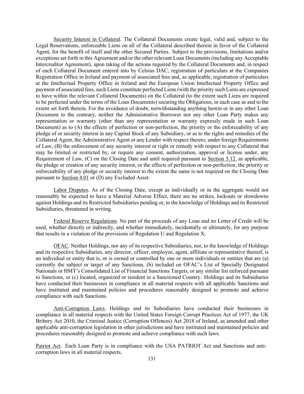 131 Security Interest in Collateral. The Collateral Documents create legal, valid and, subject to the Legal Reservations, enforceable Liens on all of the Collateral described therein in favor of the Collateral Agent, for the benefit of itself and the other Secured Parties. Subject to the provisions, limitations and/or exceptions set forth in this Agreement and/or the other relevant Loan Documents (including any Acceptable Intercreditor Agreement), upon taking of the actions required by the Collateral Documents and, in respect of each Collateral Document entered into by Celsius DAC, registration of particulars at the Companies Registration Office in Ireland and payment of associated fees and, as applicable, registration of particulars at the Intellectual Property Office in Ireland and the European Union Intellectual Property Office and payment of associated fees, such Liens constitute perfected Liens (with the priority such Liens are expressed to have within the relevant Collateral Documents) on the Collateral (to the extent such Liens are required to be perfected under the terms of the Loan Documents) securing the Obligations, in each case as and to the extent set forth therein. For the avoidance of doubt, notwithstanding anything herein or in any other Loan Document to the contrary, neither the Administrative Borrower nor any other Loan Party makes any representation or warranty (other than any representation or warranty expressly made in such Loan Document) as to (A) the effects of perfection or non-perfection, the priority or the enforceability of any pledge of or security interest in any Capital Stock of any Subsidiary, or as to the rights and remedies of the Collateral Agent, the Administrative Agent or any Lender with respect thereto, under foreign Requirements of Law, (B) the enforcement of any security interest or right or remedy with respect to any Collateral that may be limited or restricted by, or require any consent, authorization, approval or license under, any Requirement of Law, (C) on the Closing Date and until required pursuant to Section 5.12, as applicable, the pledge or creation of any security interest, or the effects of perfection or non-perfection, the priority or enforceability of any pledge or security interest to the extent the same is not required on the Closing Date pursuant to Section 4.01 or (D) any Excluded Asset. Labor Disputes. As of the Closing Date, except as individually or in the aggregate would not reasonably be expected to have a Material Adverse Effect, there are no strikes, lockouts or slowdowns against Holdings and its Restricted Subsidiaries pending or, to the knowledge of Holdings and its Restricted Subsidiaries, threatened in writing. Federal Reserve Regulations. No part of the proceeds of any Loan and no Letter of Credit will be used, whether directly or indirectly, and whether immediately, incidentally or ultimately, for any purpose that results in a violation of the provisions of Regulation U and Regulation X. OFAC. Neither Holdings, nor any of its respective Subsidiaries, nor, to the knowledge of Holdings and its respective Subsidiaries, any director, officer, employee, agent, affiliate or representative thereof, is an individual or entity that is, or is owned or controlled by one or more individuals or entities that are (a) currently the subject or target of any Sanctions, (b) included on OFAC’s List of Specially Designated Nationals or HMT’s Consolidated List of Financial Sanctions Targets, or any similar list enforced pursuant to Sanctions, or (c) located, organized or resident in a Sanctioned Country. Holdings and its Subsidiaries have conducted their businesses in compliance in all material respects with all applicable Sanctions and have instituted and maintained policies and procedures reasonably designed to promote and achieve compliance with such Sanctions. Anti-Corruption Laws. Holdings and its Subsidiaries have conducted their businesses in compliance in all material respects with the United States Foreign Corrupt Practices Act of 1977, the UK Bribery Act 2010, the Criminal Justice (Corruption Offences) Act 2018 of Ireland, as amended and other applicable anti-corruption legislation in other jurisdictions and have instituted and maintained policies and procedures reasonably designed to promote and achieve compliance with such laws. Patriot Act. Each Loan Party is in compliance with the USA PATRIOT Act and Sanctions and anti- corruption laws in all material respects.