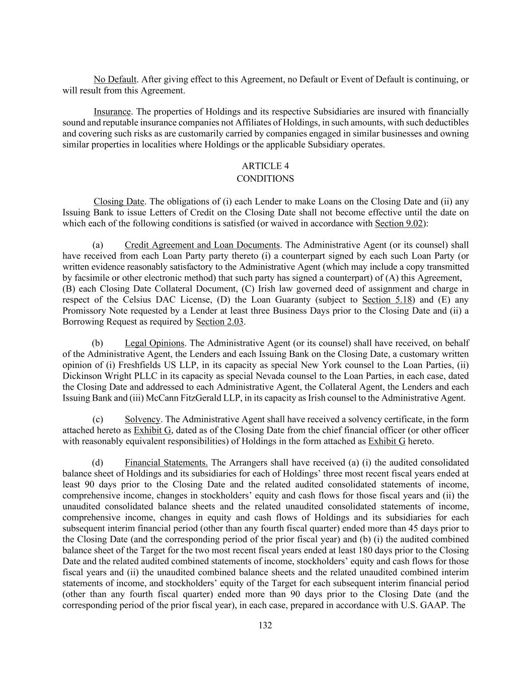 132 No Default. After giving effect to this Agreement, no Default or Event of Default is continuing, or will result from this Agreement. Insurance. The properties of Holdings and its respective Subsidiaries are insured with financially sound and reputable insurance companies not Affiliates of Holdings, in such amounts, with such deductibles and covering such risks as are customarily carried by companies engaged in similar businesses and owning similar properties in localities where Holdings or the applicable Subsidiary operates. ARTICLE 4 CONDITIONS Closing Date. The obligations of (i) each Lender to make Loans on the Closing Date and (ii) any Issuing Bank to issue Letters of Credit on the Closing Date shall not become effective until the date on which each of the following conditions is satisfied (or waived in accordance with Section 9.02): (a) Credit Agreement and Loan Documents. The Administrative Agent (or its counsel) shall have received from each Loan Party party thereto (i) a counterpart signed by each such Loan Party (or written evidence reasonably satisfactory to the Administrative Agent (which may include a copy transmitted by facsimile or other electronic method) that such party has signed a counterpart) of (A) this Agreement, (B) each Closing Date Collateral Document, (C) Irish law governed deed of assignment and charge in respect of the Celsius DAC License, (D) the Loan Guaranty (subject to Section 5.18) and (E) any Promissory Note requested by a Lender at least three Business Days prior to the Closing Date and (ii) a Borrowing Request as required by Section 2.03. (b) Legal Opinions. The Administrative Agent (or its counsel) shall have received, on behalf of the Administrative Agent, the Lenders and each Issuing Bank on the Closing Date, a customary written opinion of (i) Freshfields US LLP, in its capacity as special New York counsel to the Loan Parties, (ii) Dickinson Wright PLLC in its capacity as special Nevada counsel to the Loan Parties, in each case, dated the Closing Date and addressed to each Administrative Agent, the Collateral Agent, the Lenders and each Issuing Bank and (iii) McCann FitzGerald LLP, in its capacity as Irish counsel to the Administrative Agent. (c) Solvency. The Administrative Agent shall have received a solvency certificate, in the form attached hereto as Exhibit G, dated as of the Closing Date from the chief financial officer (or other officer with reasonably equivalent responsibilities) of Holdings in the form attached as Exhibit G hereto. (d) Financial Statements. The Arrangers shall have received (a) (i) the audited consolidated balance sheet of Holdings and its subsidiaries for each of Holdings’ three most recent fiscal years ended at least 90 days prior to the Closing Date and the related audited consolidated statements of income, comprehensive income, changes in stockholders’ equity and cash flows for those fiscal years and (ii) the unaudited consolidated balance sheets and the related unaudited consolidated statements of income, comprehensive income, changes in equity and cash flows of Holdings and its subsidiaries for each subsequent interim financial period (other than any fourth fiscal quarter) ended more than 45 days prior to the Closing Date (and the corresponding period of the prior fiscal year) and (b) (i) the audited combined balance sheet of the Target for the two most recent fiscal years ended at least 180 days prior to the Closing Date and the related audited combined statements of income, stockholders’ equity and cash flows for those fiscal years and (ii) the unaudited combined balance sheets and the related unaudited combined interim statements of income, and stockholders’ equity of the Target for each subsequent interim financial period (other than any fourth fiscal quarter) ended more than 90 days prior to the Closing Date (and the corresponding period of the prior fiscal year), in each case, prepared in accordance with U.S. GAAP. The