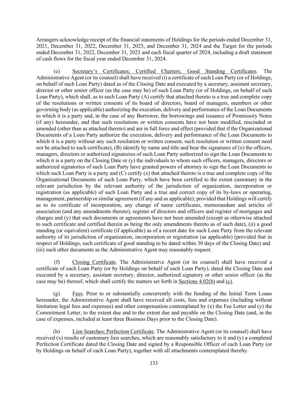 133 Arrangers acknowledge receipt of the financial statements of Holdings for the periods ended December 31, 2021, December 31, 2022, December 31, 2023, and December 31, 2024 and the Target for the periods ended December 31, 2022, December 31, 2023 and each fiscal quarter of 2024, including a draft statement of cash flows for the fiscal year ended December 31, 2024. (e) Secretary’s Certificates; Certified Charters; Good Standing Certificates. The Administrative Agent (or its counsel) shall have received (i) a certificate of each Loan Party (or of Holdings, on behalf of such Loan Party) dated as of the Closing Date and executed by a secretary, assistant secretary, director or other senior officer (as the case may be) of such Loan Party (or of Holdings, on behalf of such Loan Party), which shall, as to such Loan Party (A) certify that attached thereto is a true and complete copy of the resolutions or written consents of its board of directors, board of managers, members or other governing body (as applicable) authorizing the execution, delivery and performance of the Loan Documents to which it is a party and, in the case of any Borrower, the borrowings and issuance of Promissory Notes (if any) hereunder, and that such resolutions or written consents have not been modified, rescinded or amended (other than as attached thereto) and are in full force and effect (provided that if the Organizational Documents of a Loan Party authorize the execution, delivery and performance of the Loan Documents to which it is a party without any such resolution or written consent, such resolution or written consent need not be attached to such certificate), (B) identify by name and title and bear the signatures of (x) the officers, managers, directors or authorized signatories of such Loan Party authorized to sign the Loan Documents to which it is a party on the Closing Date or (y) the individuals to whom such officers, managers, directors or authorized signatories of such Loan Party have granted powers of attorney to sign the Loan Documents to which such Loan Party is a party and (C) certify (x) that attached thereto is a true and complete copy of the Organizational Documents of such Loan Party, which have been certified to the extent customary in the relevant jurisdiction by the relevant authority of the jurisdiction of organization, incorporation or registration (as applicable) of such Loan Party and a true and correct copy of its by-laws or operating, management, partnership or similar agreement (if any and as applicable); provided that Holdings will certify as to its certificate of incorporation, any change of name certificates, memorandum and articles of association (and any amendments thereto), register of directors and officers and register of mortgages and charges and (y) that such documents or agreements have not been amended (except as otherwise attached to such certificate and certified therein as being the only amendments thereto as of such date), (ii) a good standing (or equivalent) certificate (if applicable) as of a recent date for such Loan Party from the relevant authority of its jurisdiction of organization, incorporation or registration (as applicable) (provided that in respect of Holdings, such certificate of good standing to be dated within 30 days of the Closing Date) and (iii) such other documents as the Administrative Agent may reasonably request. (f) Closing Certificate. The Administrative Agent (or its counsel) shall have received a certificate of each Loan Party (or by Holdings on behalf of each Loan Party), dated the Closing Date and executed by a secretary, assistant secretary, director, authorized signatory or other senior officer (as the case may be) thereof, which shall certify the matters set forth in Sections 4.02(b) and (c). (g) Fees. Prior to or substantially concurrently with the funding of the Initial Term Loans hereunder, the Administrative Agent shall have received all costs, fees and expenses (including without limitation legal fees and expenses) and other compensation contemplated by (x) the Fee Letter and (y) the Commitment Letter, to the extent due and to the extent due and payable on the Closing Date (and, in the case of expenses, included at least three Business Days prior to the Closing Date). (h) Lien Searches; Perfection Certificate. The Administrative Agent (or its counsel) shall have received (x) results of customary lien searches, which are reasonably satisfactory to it and (y) a completed Perfection Certificate dated the Closing Date and signed by a Responsible Officer of each Loan Party (or by Holdings on behalf of each Loan Party), together with all attachments contemplated thereby.