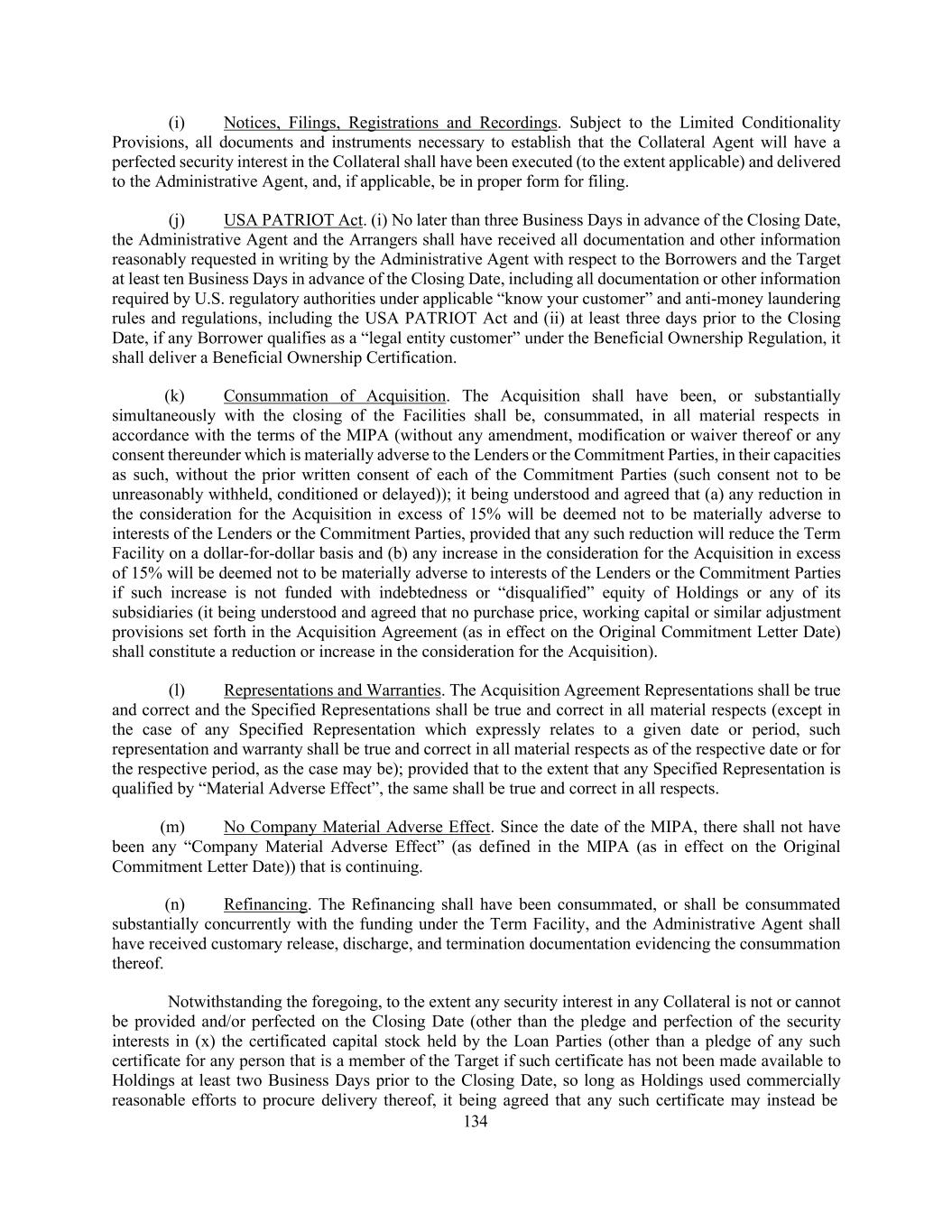 134 (i) Notices, Filings, Registrations and Recordings. Subject to the Limited Conditionality Provisions, all documents and instruments necessary to establish that the Collateral Agent will have a perfected security interest in the Collateral shall have been executed (to the extent applicable) and delivered to the Administrative Agent, and, if applicable, be in proper form for filing. (j) USA PATRIOT Act. (i) No later than three Business Days in advance of the Closing Date, the Administrative Agent and the Arrangers shall have received all documentation and other information reasonably requested in writing by the Administrative Agent with respect to the Borrowers and the Target at least ten Business Days in advance of the Closing Date, including all documentation or other information required by U.S. regulatory authorities under applicable “know your customer” and anti-money laundering rules and regulations, including the USA PATRIOT Act and (ii) at least three days prior to the Closing Date, if any Borrower qualifies as a “legal entity customer” under the Beneficial Ownership Regulation, it shall deliver a Beneficial Ownership Certification. (k) Consummation of Acquisition. The Acquisition shall have been, or substantially simultaneously with the closing of the Facilities shall be, consummated, in all material respects in accordance with the terms of the MIPA (without any amendment, modification or waiver thereof or any consent thereunder which is materially adverse to the Lenders or the Commitment Parties, in their capacities as such, without the prior written consent of each of the Commitment Parties (such consent not to be unreasonably withheld, conditioned or delayed)); it being understood and agreed that (a) any reduction in the consideration for the Acquisition in excess of 15% will be deemed not to be materially adverse to interests of the Lenders or the Commitment Parties, provided that any such reduction will reduce the Term Facility on a dollar-for-dollar basis and (b) any increase in the consideration for the Acquisition in excess of 15% will be deemed not to be materially adverse to interests of the Lenders or the Commitment Parties if such increase is not funded with indebtedness or “disqualified” equity of Holdings or any of its subsidiaries (it being understood and agreed that no purchase price, working capital or similar adjustment provisions set forth in the Acquisition Agreement (as in effect on the Original Commitment Letter Date) shall constitute a reduction or increase in the consideration for the Acquisition). (l) Representations and Warranties. The Acquisition Agreement Representations shall be true and correct and the Specified Representations shall be true and correct in all material respects (except in the case of any Specified Representation which expressly relates to a given date or period, such representation and warranty shall be true and correct in all material respects as of the respective date or for the respective period, as the case may be); provided that to the extent that any Specified Representation is qualified by “Material Adverse Effect”, the same shall be true and correct in all respects. (m) No Company Material Adverse Effect. Since the date of the MIPA, there shall not have been any “Company Material Adverse Effect” (as defined in the MIPA (as in effect on the Original Commitment Letter Date)) that is continuing. (n) Refinancing. The Refinancing shall have been consummated, or shall be consummated substantially concurrently with the funding under the Term Facility, and the Administrative Agent shall have received customary release, discharge, and termination documentation evidencing the consummation thereof. Notwithstanding the foregoing, to the extent any security interest in any Collateral is not or cannot be provided and/or perfected on the Closing Date (other than the pledge and perfection of the security interests in (x) the certificated capital stock held by the Loan Parties (other than a pledge of any such certificate for any person that is a member of the Target if such certificate has not been made available to Holdings at least two Business Days prior to the Closing Date, so long as Holdings used commercially reasonable efforts to procure delivery thereof, it being agreed that any such certificate may instead be