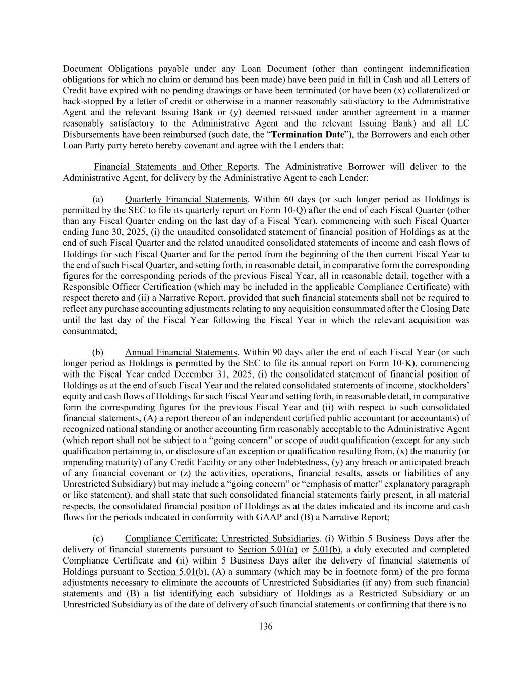 136 Document Obligations payable under any Loan Document (other than contingent indemnification obligations for which no claim or demand has been made) have been paid in full in Cash and all Letters of Credit have expired with no pending drawings or have been terminated (or have been (x) collateralized or back-stopped by a letter of credit or otherwise in a manner reasonably satisfactory to the Administrative Agent and the relevant Issuing Bank or (y) deemed reissued under another agreement in a manner reasonably satisfactory to the Administrative Agent and the relevant Issuing Bank) and all LC Disbursements have been reimbursed (such date, the “Termination Date”), the Borrowers and each other Loan Party party hereto hereby covenant and agree with the Lenders that: Financial Statements and Other Reports. The Administrative Borrower will deliver to the Administrative Agent, for delivery by the Administrative Agent to each Lender: (a) Quarterly Financial Statements. Within 60 days (or such longer period as Holdings is permitted by the SEC to file its quarterly report on Form 10-Q) after the end of each Fiscal Quarter (other than any Fiscal Quarter ending on the last day of a Fiscal Year), commencing with such Fiscal Quarter ending June 30, 2025, (i) the unaudited consolidated statement of financial position of Holdings as at the end of such Fiscal Quarter and the related unaudited consolidated statements of income and cash flows of Holdings for such Fiscal Quarter and for the period from the beginning of the then current Fiscal Year to the end of such Fiscal Quarter, and setting forth, in reasonable detail, in comparative form the corresponding figures for the corresponding periods of the previous Fiscal Year, all in reasonable detail, together with a Responsible Officer Certification (which may be included in the applicable Compliance Certificate) with respect thereto and (ii) a Narrative Report, provided that such financial statements shall not be required to reflect any purchase accounting adjustments relating to any acquisition consummated after the Closing Date until the last day of the Fiscal Year following the Fiscal Year in which the relevant acquisition was consummated; (b) Annual Financial Statements. Within 90 days after the end of each Fiscal Year (or such longer period as Holdings is permitted by the SEC to file its annual report on Form 10-K), commencing with the Fiscal Year ended December 31, 2025, (i) the consolidated statement of financial position of Holdings as at the end of such Fiscal Year and the related consolidated statements of income, stockholders’ equity and cash flows of Holdings for such Fiscal Year and setting forth, in reasonable detail, in comparative form the corresponding figures for the previous Fiscal Year and (ii) with respect to such consolidated financial statements, (A) a report thereon of an independent certified public accountant (or accountants) of recognized national standing or another accounting firm reasonably acceptable to the Administrative Agent (which report shall not be subject to a “going concern” or scope of audit qualification (except for any such qualification pertaining to, or disclosure of an exception or qualification resulting from, (x) the maturity (or impending maturity) of any Credit Facility or any other Indebtedness, (y) any breach or anticipated breach of any financial covenant or (z) the activities, operations, financial results, assets or liabilities of any Unrestricted Subsidiary) but may include a “going concern” or “emphasis of matter” explanatory paragraph or like statement), and shall state that such consolidated financial statements fairly present, in all material respects, the consolidated financial position of Holdings as at the dates indicated and its income and cash flows for the periods indicated in conformity with GAAP and (B) a Narrative Report; (c) Compliance Certificate; Unrestricted Subsidiaries. (i) Within 5 Business Days after the delivery of financial statements pursuant to Section 5.01(a) or 5.01(b), a duly executed and completed Compliance Certificate and (ii) within 5 Business Days after the delivery of financial statements of Holdings pursuant to Section 5.01(b), (A) a summary (which may be in footnote form) of the pro forma adjustments necessary to eliminate the accounts of Unrestricted Subsidiaries (if any) from such financial statements and (B) a list identifying each subsidiary of Holdings as a Restricted Subsidiary or an Unrestricted Subsidiary as of the date of delivery of such financial statements or confirming that there is no