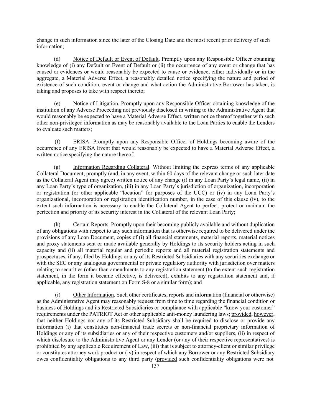 137 change in such information since the later of the Closing Date and the most recent prior delivery of such information; (d) Notice of Default or Event of Default. Promptly upon any Responsible Officer obtaining knowledge of (i) any Default or Event of Default or (ii) the occurrence of any event or change that has caused or evidences or would reasonably be expected to cause or evidence, either individually or in the aggregate, a Material Adverse Effect, a reasonably detailed notice specifying the nature and period of existence of such condition, event or change and what action the Administrative Borrower has taken, is taking and proposes to take with respect thereto; (e) Notice of Litigation. Promptly upon any Responsible Officer obtaining knowledge of the institution of any Adverse Proceeding not previously disclosed in writing to the Administrative Agent that would reasonably be expected to have a Material Adverse Effect, written notice thereof together with such other non-privileged information as may be reasonably available to the Loan Parties to enable the Lenders to evaluate such matters; (f) ERISA. Promptly upon any Responsible Officer of Holdings becoming aware of the occurrence of any ERISA Event that would reasonably be expected to have a Material Adverse Effect, a written notice specifying the nature thereof; (g) Information Regarding Collateral. Without limiting the express terms of any applicable Collateral Document, promptly (and, in any event, within 60 days of the relevant change or such later date as the Collateral Agent may agree) written notice of any change (i) in any Loan Party’s legal name, (ii) in any Loan Party’s type of organization, (iii) in any Loan Party’s jurisdiction of organization, incorporation or registration (or other applicable “location” for purposes of the UCC) or (iv) in any Loan Party’s organizational, incorporation or registration identification number, in the case of this clause (iv), to the extent such information is necessary to enable the Collateral Agent to perfect, protect or maintain the perfection and priority of its security interest in the Collateral of the relevant Loan Party; (h) Certain Reports. Promptly upon their becoming publicly available and without duplication of any obligations with respect to any such information that is otherwise required to be delivered under the provisions of any Loan Document, copies of (i) all financial statements, material reports, material notices and proxy statements sent or made available generally by Holdings to its security holders acting in such capacity and (ii) all material regular and periodic reports and all material registration statements and prospectuses, if any, filed by Holdings or any of its Restricted Subsidiaries with any securities exchange or with the SEC or any analogous governmental or private regulatory authority with jurisdiction over matters relating to securities (other than amendments to any registration statement (to the extent such registration statement, in the form it became effective, is delivered), exhibits to any registration statement and, if applicable, any registration statement on Form S-8 or a similar form); and (i) Other Information. Such other certificates, reports and information (financial or otherwise) as the Administrative Agent may reasonably request from time to time regarding the financial condition or business of Holdings and its Restricted Subsidiaries or compliance with applicable “know your customer” requirements under the PATRIOT Act or other applicable anti-money laundering laws; provided, however, that neither Holdings nor any of its Restricted Subsidiary shall be required to disclose or provide any information (i) that constitutes non-financial trade secrets or non-financial proprietary information of Holdings or any of its subsidiaries or any of their respective customers and/or suppliers, (ii) in respect of which disclosure to the Administrative Agent or any Lender (or any of their respective representatives) is prohibited by any applicable Requirement of Law, (iii) that is subject to attorney-client or similar privilege or constitutes attorney work product or (iv) in respect of which any Borrower or any Restricted Subsidiary owes confidentiality obligations to any third party (provided such confidentiality obligations were not