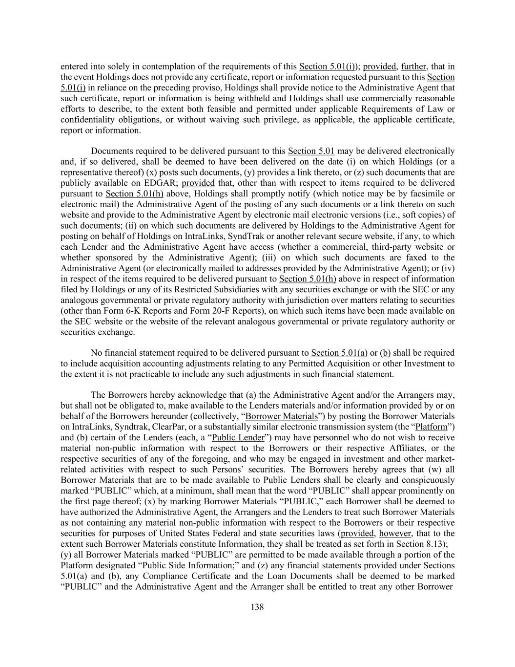 138 entered into solely in contemplation of the requirements of this Section 5.01(i)); provided, further, that in the event Holdings does not provide any certificate, report or information requested pursuant to this Section 5.01(i) in reliance on the preceding proviso, Holdings shall provide notice to the Administrative Agent that such certificate, report or information is being withheld and Holdings shall use commercially reasonable efforts to describe, to the extent both feasible and permitted under applicable Requirements of Law or confidentiality obligations, or without waiving such privilege, as applicable, the applicable certificate, report or information. Documents required to be delivered pursuant to this Section 5.01 may be delivered electronically and, if so delivered, shall be deemed to have been delivered on the date (i) on which Holdings (or a representative thereof) (x) posts such documents, (y) provides a link thereto, or (z) such documents that are publicly available on EDGAR; provided that, other than with respect to items required to be delivered pursuant to Section 5.01(h) above, Holdings shall promptly notify (which notice may be by facsimile or electronic mail) the Administrative Agent of the posting of any such documents or a link thereto on such website and provide to the Administrative Agent by electronic mail electronic versions (i.e., soft copies) of such documents; (ii) on which such documents are delivered by Holdings to the Administrative Agent for posting on behalf of Holdings on IntraLinks, SyndTrak or another relevant secure website, if any, to which each Lender and the Administrative Agent have access (whether a commercial, third-party website or whether sponsored by the Administrative Agent); (iii) on which such documents are faxed to the Administrative Agent (or electronically mailed to addresses provided by the Administrative Agent); or (iv) in respect of the items required to be delivered pursuant to Section 5.01(h) above in respect of information filed by Holdings or any of its Restricted Subsidiaries with any securities exchange or with the SEC or any analogous governmental or private regulatory authority with jurisdiction over matters relating to securities (other than Form 6-K Reports and Form 20-F Reports), on which such items have been made available on the SEC website or the website of the relevant analogous governmental or private regulatory authority or securities exchange. No financial statement required to be delivered pursuant to Section 5.01(a) or (b) shall be required to include acquisition accounting adjustments relating to any Permitted Acquisition or other Investment to the extent it is not practicable to include any such adjustments in such financial statement. The Borrowers hereby acknowledge that (a) the Administrative Agent and/or the Arrangers may, but shall not be obligated to, make available to the Lenders materials and/or information provided by or on behalf of the Borrowers hereunder (collectively, “Borrower Materials”) by posting the Borrower Materials on IntraLinks, Syndtrak, ClearPar, or a substantially similar electronic transmission system (the “Platform”) and (b) certain of the Lenders (each, a “Public Lender”) may have personnel who do not wish to receive material non-public information with respect to the Borrowers or their respective Affiliates, or the respective securities of any of the foregoing, and who may be engaged in investment and other market- related activities with respect to such Persons’ securities. The Borrowers hereby agrees that (w) all Borrower Materials that are to be made available to Public Lenders shall be clearly and conspicuously marked “PUBLIC” which, at a minimum, shall mean that the word “PUBLIC” shall appear prominently on the first page thereof; (x) by marking Borrower Materials “PUBLIC,” each Borrower shall be deemed to have authorized the Administrative Agent, the Arrangers and the Lenders to treat such Borrower Materials as not containing any material non-public information with respect to the Borrowers or their respective securities for purposes of United States Federal and state securities laws (provided, however, that to the extent such Borrower Materials constitute Information, they shall be treated as set forth in Section 8.13); (y) all Borrower Materials marked “PUBLIC” are permitted to be made available through a portion of the Platform designated “Public Side Information;” and (z) any financial statements provided under Sections 5.01(a) and (b), any Compliance Certificate and the Loan Documents shall be deemed to be marked “PUBLIC” and the Administrative Agent and the Arranger shall be entitled to treat any other Borrower