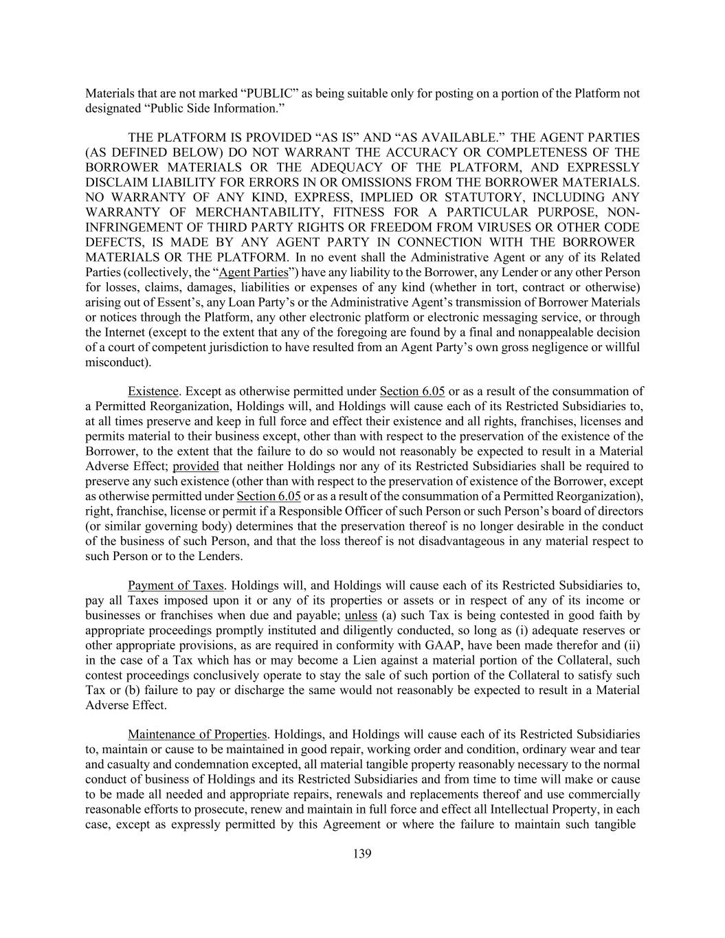 139 Materials that are not marked “PUBLIC” as being suitable only for posting on a portion of the Platform not designated “Public Side Information.” THE PLATFORM IS PROVIDED “AS IS” AND “AS AVAILABLE.” THE AGENT PARTIES (AS DEFINED BELOW) DO NOT WARRANT THE ACCURACY OR COMPLETENESS OF THE BORROWER MATERIALS OR THE ADEQUACY OF THE PLATFORM, AND EXPRESSLY DISCLAIM LIABILITY FOR ERRORS IN OR OMISSIONS FROM THE BORROWER MATERIALS. NO WARRANTY OF ANY KIND, EXPRESS, IMPLIED OR STATUTORY, INCLUDING ANY WARRANTY OF MERCHANTABILITY, FITNESS FOR A PARTICULAR PURPOSE, NON- INFRINGEMENT OF THIRD PARTY RIGHTS OR FREEDOM FROM VIRUSES OR OTHER CODE DEFECTS, IS MADE BY ANY AGENT PARTY IN CONNECTION WITH THE BORROWER MATERIALS OR THE PLATFORM. In no event shall the Administrative Agent or any of its Related Parties (collectively, the “Agent Parties”) have any liability to the Borrower, any Lender or any other Person for losses, claims, damages, liabilities or expenses of any kind (whether in tort, contract or otherwise) arising out of Essent’s, any Loan Party’s or the Administrative Agent’s transmission of Borrower Materials or notices through the Platform, any other electronic platform or electronic messaging service, or through the Internet (except to the extent that any of the foregoing are found by a final and nonappealable decision of a court of competent jurisdiction to have resulted from an Agent Party’s own gross negligence or willful misconduct). Existence. Except as otherwise permitted under Section 6.05 or as a result of the consummation of a Permitted Reorganization, Holdings will, and Holdings will cause each of its Restricted Subsidiaries to, at all times preserve and keep in full force and effect their existence and all rights, franchises, licenses and permits material to their business except, other than with respect to the preservation of the existence of the Borrower, to the extent that the failure to do so would not reasonably be expected to result in a Material Adverse Effect; provided that neither Holdings nor any of its Restricted Subsidiaries shall be required to preserve any such existence (other than with respect to the preservation of existence of the Borrower, except as otherwise permitted under Section 6.05 or as a result of the consummation of a Permitted Reorganization), right, franchise, license or permit if a Responsible Officer of such Person or such Person’s board of directors (or similar governing body) determines that the preservation thereof is no longer desirable in the conduct of the business of such Person, and that the loss thereof is not disadvantageous in any material respect to such Person or to the Lenders. Payment of Taxes. Holdings will, and Holdings will cause each of its Restricted Subsidiaries to, pay all Taxes imposed upon it or any of its properties or assets or in respect of any of its income or businesses or franchises when due and payable; unless (a) such Tax is being contested in good faith by appropriate proceedings promptly instituted and diligently conducted, so long as (i) adequate reserves or other appropriate provisions, as are required in conformity with GAAP, have been made therefor and (ii) in the case of a Tax which has or may become a Lien against a material portion of the Collateral, such contest proceedings conclusively operate to stay the sale of such portion of the Collateral to satisfy such Tax or (b) failure to pay or discharge the same would not reasonably be expected to result in a Material Adverse Effect. Maintenance of Properties. Holdings, and Holdings will cause each of its Restricted Subsidiaries to, maintain or cause to be maintained in good repair, working order and condition, ordinary wear and tear and casualty and condemnation excepted, all material tangible property reasonably necessary to the normal conduct of business of Holdings and its Restricted Subsidiaries and from time to time will make or cause to be made all needed and appropriate repairs, renewals and replacements thereof and use commercially reasonable efforts to prosecute, renew and maintain in full force and effect all Intellectual Property, in each case, except as expressly permitted by this Agreement or where the failure to maintain such tangible