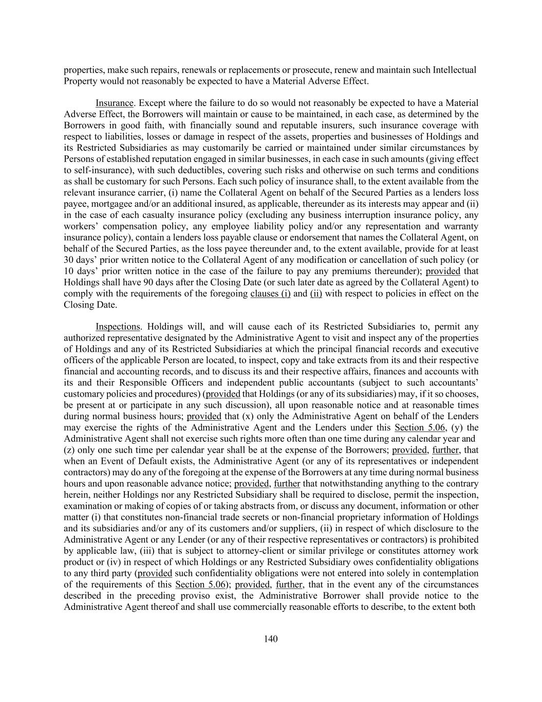 140 properties, make such repairs, renewals or replacements or prosecute, renew and maintain such Intellectual Property would not reasonably be expected to have a Material Adverse Effect. Insurance. Except where the failure to do so would not reasonably be expected to have a Material Adverse Effect, the Borrowers will maintain or cause to be maintained, in each case, as determined by the Borrowers in good faith, with financially sound and reputable insurers, such insurance coverage with respect to liabilities, losses or damage in respect of the assets, properties and businesses of Holdings and its Restricted Subsidiaries as may customarily be carried or maintained under similar circumstances by Persons of established reputation engaged in similar businesses, in each case in such amounts (giving effect to self-insurance), with such deductibles, covering such risks and otherwise on such terms and conditions as shall be customary for such Persons. Each such policy of insurance shall, to the extent available from the relevant insurance carrier, (i) name the Collateral Agent on behalf of the Secured Parties as a lenders loss payee, mortgagee and/or an additional insured, as applicable, thereunder as its interests may appear and (ii) in the case of each casualty insurance policy (excluding any business interruption insurance policy, any workers’ compensation policy, any employee liability policy and/or any representation and warranty insurance policy), contain a lenders loss payable clause or endorsement that names the Collateral Agent, on behalf of the Secured Parties, as the loss payee thereunder and, to the extent available, provide for at least 30 days’ prior written notice to the Collateral Agent of any modification or cancellation of such policy (or 10 days’ prior written notice in the case of the failure to pay any premiums thereunder); provided that Holdings shall have 90 days after the Closing Date (or such later date as agreed by the Collateral Agent) to comply with the requirements of the foregoing clauses (i) and (ii) with respect to policies in effect on the Closing Date. Inspections. Holdings will, and will cause each of its Restricted Subsidiaries to, permit any authorized representative designated by the Administrative Agent to visit and inspect any of the properties of Holdings and any of its Restricted Subsidiaries at which the principal financial records and executive officers of the applicable Person are located, to inspect, copy and take extracts from its and their respective financial and accounting records, and to discuss its and their respective affairs, finances and accounts with its and their Responsible Officers and independent public accountants (subject to such accountants’ customary policies and procedures) (provided that Holdings (or any of its subsidiaries) may, if it so chooses, be present at or participate in any such discussion), all upon reasonable notice and at reasonable times during normal business hours; provided that (x) only the Administrative Agent on behalf of the Lenders may exercise the rights of the Administrative Agent and the Lenders under this Section 5.06, (y) the Administrative Agent shall not exercise such rights more often than one time during any calendar year and (z) only one such time per calendar year shall be at the expense of the Borrowers; provided, further, that when an Event of Default exists, the Administrative Agent (or any of its representatives or independent contractors) may do any of the foregoing at the expense of the Borrowers at any time during normal business hours and upon reasonable advance notice; provided, further that notwithstanding anything to the contrary herein, neither Holdings nor any Restricted Subsidiary shall be required to disclose, permit the inspection, examination or making of copies of or taking abstracts from, or discuss any document, information or other matter (i) that constitutes non-financial trade secrets or non-financial proprietary information of Holdings and its subsidiaries and/or any of its customers and/or suppliers, (ii) in respect of which disclosure to the Administrative Agent or any Lender (or any of their respective representatives or contractors) is prohibited by applicable law, (iii) that is subject to attorney-client or similar privilege or constitutes attorney work product or (iv) in respect of which Holdings or any Restricted Subsidiary owes confidentiality obligations to any third party (provided such confidentiality obligations were not entered into solely in contemplation of the requirements of this Section 5.06); provided, further, that in the event any of the circumstances described in the preceding proviso exist, the Administrative Borrower shall provide notice to the Administrative Agent thereof and shall use commercially reasonable efforts to describe, to the extent both