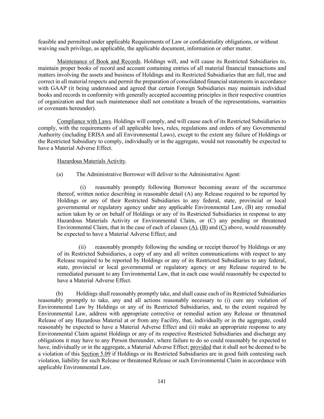 141 feasible and permitted under applicable Requirements of Law or confidentiality obligations, or without waiving such privilege, as applicable, the applicable document, information or other matter. Maintenance of Book and Records. Holdings will, and will cause its Restricted Subsidiaries to, maintain proper books of record and account containing entries of all material financial transactions and matters involving the assets and business of Holdings and its Restricted Subsidiaries that are full, true and correct in all material respects and permit the preparation of consolidated financial statements in accordance with GAAP (it being understood and agreed that certain Foreign Subsidiaries may maintain individual books and records in conformity with generally accepted accounting principles in their respective countries of organization and that such maintenance shall not constitute a breach of the representations, warranties or covenants hereunder). Compliance with Laws. Holdings will comply, and will cause each of its Restricted Subsidiaries to comply, with the requirements of all applicable laws, rules, regulations and orders of any Governmental Authority (including ERISA and all Environmental Laws), except to the extent any failure of Holdings or the Restricted Subsidiary to comply, individually or in the aggregate, would not reasonably be expected to have a Material Adverse Effect. Hazardous Materials Activity. (a) The Administrative Borrower will deliver to the Administrative Agent: (i) reasonably promptly following Borrower becoming aware of the occurrence thereof, written notice describing in reasonable detail (A) any Release required to be reported by Holdings or any of their Restricted Subsidiaries to any federal, state, provincial or local governmental or regulatory agency under any applicable Environmental Law, (B) any remedial action taken by or on behalf of Holdings or any of its Restricted Subsidiaries in response to any Hazardous Materials Activity or Environmental Claim, or (C) any pending or threatened Environmental Claim, that in the case of each of clauses (A), (B) and (C) above, would reasonably be expected to have a Material Adverse Effect; and (ii) reasonably promptly following the sending or receipt thereof by Holdings or any of its Restricted Subsidiaries, a copy of any and all written communications with respect to any Release required to be reported by Holdings or any of its Restricted Subsidiaries to any federal, state, provincial or local governmental or regulatory agency or any Release required to be remediated pursuant to any Environmental Law, that in each case would reasonably be expected to have a Material Adverse Effect. (b) Holdings shall reasonably promptly take, and shall cause each of its Restricted Subsidiaries reasonably promptly to take, any and all actions reasonably necessary to (i) cure any violation of Environmental Law by Holdings or any of its Restricted Subsidiaries, and, to the extent required by Environmental Law, address with appropriate corrective or remedial action any Release or threatened Release of any Hazardous Material at or from any Facility, that, individually or in the aggregate, could reasonably be expected to have a Material Adverse Effect and (ii) make an appropriate response to any Environmental Claim against Holdings or any of its respective Restricted Subsidiaries and discharge any obligations it may have to any Person thereunder, where failure to do so could reasonably be expected to have, individually or in the aggregate, a Material Adverse Effect; provided that it shall not be deemed to be a violation of this Section 5.09 if Holdings or its Restricted Subsidiaries are in good faith contesting such violation, liability for such Release or threatened Release or such Environmental Claim in accordance with applicable Environmental Law.