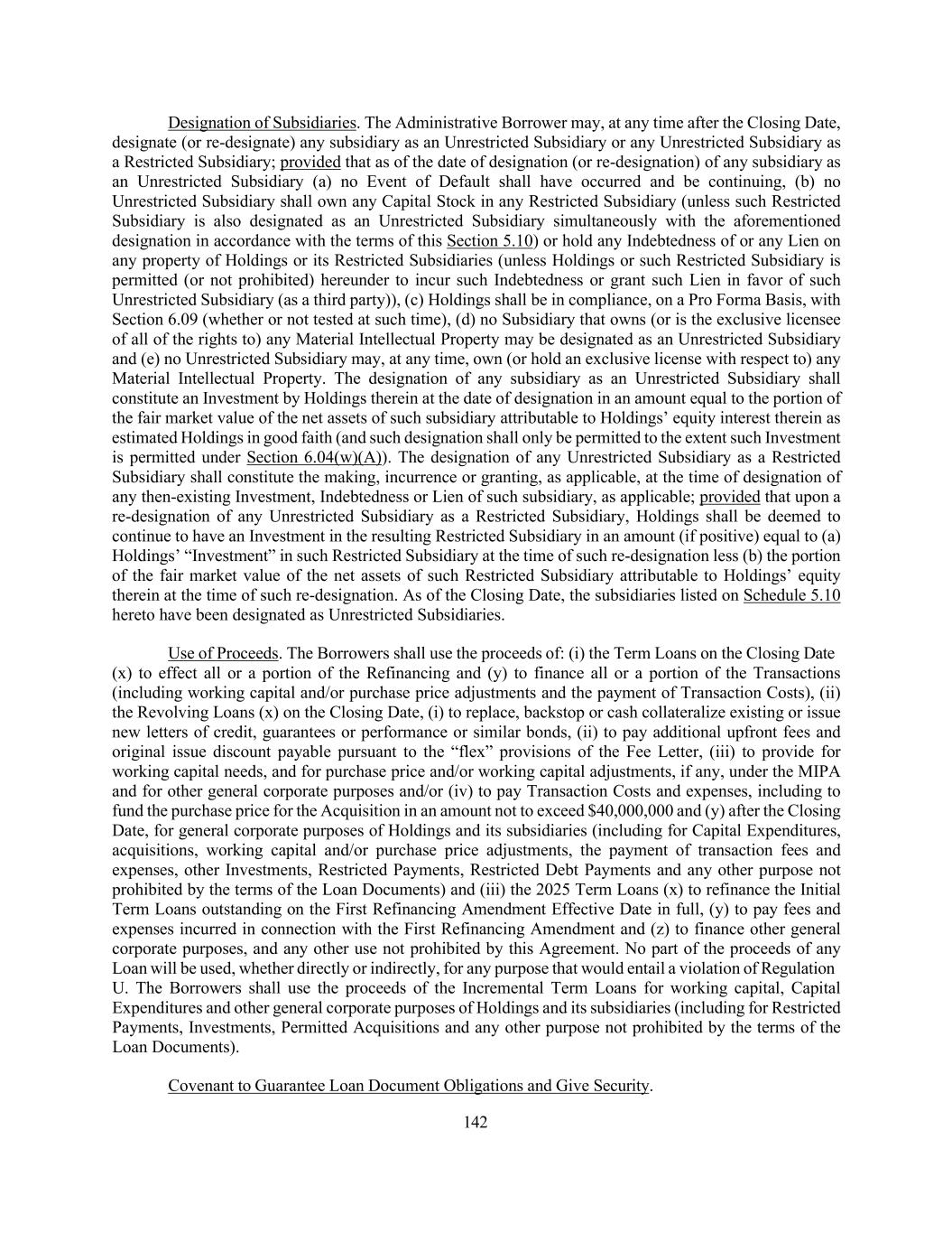 142 Designation of Subsidiaries. The Administrative Borrower may, at any time after the Closing Date, designate (or re-designate) any subsidiary as an Unrestricted Subsidiary or any Unrestricted Subsidiary as a Restricted Subsidiary; provided that as of the date of designation (or re-designation) of any subsidiary as an Unrestricted Subsidiary (a) no Event of Default shall have occurred and be continuing, (b) no Unrestricted Subsidiary shall own any Capital Stock in any Restricted Subsidiary (unless such Restricted Subsidiary is also designated as an Unrestricted Subsidiary simultaneously with the aforementioned designation in accordance with the terms of this Section 5.10) or hold any Indebtedness of or any Lien on any property of Holdings or its Restricted Subsidiaries (unless Holdings or such Restricted Subsidiary is permitted (or not prohibited) hereunder to incur such Indebtedness or grant such Lien in favor of such Unrestricted Subsidiary (as a third party)), (c) Holdings shall be in compliance, on a Pro Forma Basis, with Section 6.09 (whether or not tested at such time), (d) no Subsidiary that owns (or is the exclusive licensee of all of the rights to) any Material Intellectual Property may be designated as an Unrestricted Subsidiary and (e) no Unrestricted Subsidiary may, at any time, own (or hold an exclusive license with respect to) any Material Intellectual Property. The designation of any subsidiary as an Unrestricted Subsidiary shall constitute an Investment by Holdings therein at the date of designation in an amount equal to the portion of the fair market value of the net assets of such subsidiary attributable to Holdings’ equity interest therein as estimated Holdings in good faith (and such designation shall only be permitted to the extent such Investment is permitted under Section 6.04(w)(A)). The designation of any Unrestricted Subsidiary as a Restricted Subsidiary shall constitute the making, incurrence or granting, as applicable, at the time of designation of any then-existing Investment, Indebtedness or Lien of such subsidiary, as applicable; provided that upon a re-designation of any Unrestricted Subsidiary as a Restricted Subsidiary, Holdings shall be deemed to continue to have an Investment in the resulting Restricted Subsidiary in an amount (if positive) equal to (a) Holdings’ “Investment” in such Restricted Subsidiary at the time of such re-designation less (b) the portion of the fair market value of the net assets of such Restricted Subsidiary attributable to Holdings’ equity therein at the time of such re-designation. As of the Closing Date, the subsidiaries listed on Schedule 5.10 hereto have been designated as Unrestricted Subsidiaries. Use of Proceeds. The Borrowers shall use the proceeds of: (i) the Term Loans on the Closing Date (x) to effect all or a portion of the Refinancing and (y) to finance all or a portion of the Transactions (including working capital and/or purchase price adjustments and the payment of Transaction Costs), (ii) the Revolving Loans (x) on the Closing Date, (i) to replace, backstop or cash collateralize existing or issue new letters of credit, guarantees or performance or similar bonds, (ii) to pay additional upfront fees and original issue discount payable pursuant to the “flex” provisions of the Fee Letter, (iii) to provide for working capital needs, and for purchase price and/or working capital adjustments, if any, under the MIPA and for other general corporate purposes and/or (iv) to pay Transaction Costs and expenses, including to fund the purchase price for the Acquisition in an amount not to exceed $40,000,000 and (y) after the Closing Date, for general corporate purposes of Holdings and its subsidiaries (including for Capital Expenditures, acquisitions, working capital and/or purchase price adjustments, the payment of transaction fees and expenses, other Investments, Restricted Payments, Restricted Debt Payments and any other purpose not prohibited by the terms of the Loan Documents) and (iii) the 2025 Term Loans (x) to refinance the Initial Term Loans outstanding on the First Refinancing Amendment Effective Date in full, (y) to pay fees and expenses incurred in connection with the First Refinancing Amendment and (z) to finance other general corporate purposes, and any other use not prohibited by this Agreement. No part of the proceeds of any Loan will be used, whether directly or indirectly, for any purpose that would entail a violation of Regulation U. The Borrowers shall use the proceeds of the Incremental Term Loans for working capital, Capital Expenditures and other general corporate purposes of Holdings and its subsidiaries (including for Restricted Payments, Investments, Permitted Acquisitions and any other purpose not prohibited by the terms of the Loan Documents). Covenant to Guarantee Loan Document Obligations and Give Security.
