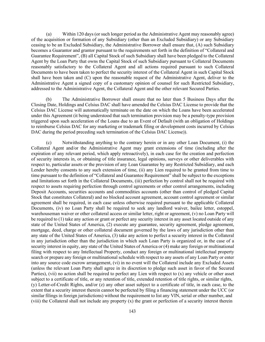 143 (a) Within 120 days (or such longer period as the Administrative Agent may reasonably agree) of the acquisition or formation of any Subsidiary (other than an Excluded Subsidiary) or any Subsidiary ceasing to be an Excluded Subsidiary, the Administrative Borrower shall ensure that, (A) such Subsidiary becomes a Guarantor and grantor pursuant to the requirements set forth in the definition of “Collateral and Guarantee Requirement”, (B) all Capital Stock of such Subsidiary shall have been pledged to the Collateral Agent by the Loan Party that owns the Capital Stock of such Subsidiary pursuant to Collateral Documents reasonably satisfactory to the Collateral Agent and all actions required pursuant to such Collateral Documents to have been taken to perfect the security interest of the Collateral Agent in such Capital Stock shall have been taken and (C) upon the reasonable request of the Administrative Agent, deliver to the Administrative Agent a signed copy of a customary opinion of counsel for such Restricted Subsidiary, addressed to the Administrative Agent, the Collateral Agent and the other relevant Secured Parties. (b) The Administrative Borrower shall ensure that no later than 5 Business Days after the Closing Date, Holdings and Celsius DAC shall have amended the Celsius DAC License to provide that the Celsius DAC License will automatically terminate on the date on which the Loans have been accelerated under this Agreement (it being understood that such termination provision may be a penalty-type provision triggered upon such acceleration of the Loans due to an Event of Default (with an obligation of Holdings to reimburse Celsius DAC for any marketing or trademark filing or development costs incurred by Celsius DAC during the period preceding such termination of the Celsius DAC License)). (c) Notwithstanding anything to the contrary herein or in any other Loan Document, (i) the Collateral Agent and/or the Administrative Agent may grant extensions of time (including after the expiration of any relevant period, which apply retroactively), in each case for the creation and perfection of security interests in, or obtaining of title insurance, legal opinions, surveys or other deliverables with respect to, particular assets or the provision of any Loan Guarantee by any Restricted Subsidiary, and each Lender hereby consents to any such extension of time, (ii) any Lien required to be granted from time to time pursuant to the definition of “Collateral and Guarantee Requirement” shall be subject to the exceptions and limitations set forth in the Collateral Documents, (iii) perfection by control shall not be required with respect to assets requiring perfection through control agreements or other control arrangements, including Deposit Accounts, securities accounts and commodities accounts (other than control of pledged Capital Stock that constitutes Collateral) and no blocked account agreement, account control agreement or similar agreement shall be required, in each case unless otherwise required pursuant to the applicable Collateral Documents, (iv) no Loan Party shall be required to seek any landlord waiver, bailee letter, estoppel, warehouseman waiver or other collateral access or similar letter, right or agreement, (v) no Loan Party will be required to (1) take any action or grant or perfect any security interest in any asset located outside of any state of the United States of America, (2) execute any guarantee, security agreement, pledge agreement, mortgage, deed, charge or other collateral document governed by the laws of any jurisdiction other than any state of the United States of America, (3) take any action to perfect a security interest in the Collateral in any jurisdiction other than the jurisdiction in which such Loan Party is organized or, in the case of a security interest in equity, any state of the United States of America or (4) make any foreign or multinational filing with respect to any Intellectual Property, conduct any foreign or multinational intellectual property search or prepare any foreign or multinational schedule with respect to any assets of any Loan Party or enter into any source code escrow arrangement, (vi) in no event will the Collateral include any Excluded Assets (unless the relevant Loan Party shall agree in its discretion to pledge such asset in favor of the Secured Parties), (vii) no action shall be required to perfect any Lien with respect to (x) any vehicle or other asset subject to a certificate of title, or any retention of title, extended retention of title rights, or similar rights, (y) Letter-of-Credit Rights, and/or (z) any other asset subject to a certificate of title, in each case, to the extent that a security interest therein cannot be perfected by filing a financing statement under the UCC (or similar filings in foreign jurisdictions) without the requirement to list any VIN, serial or other number, and (viii) the Collateral shall not include any property (x) the grant or perfection of a security interest therein