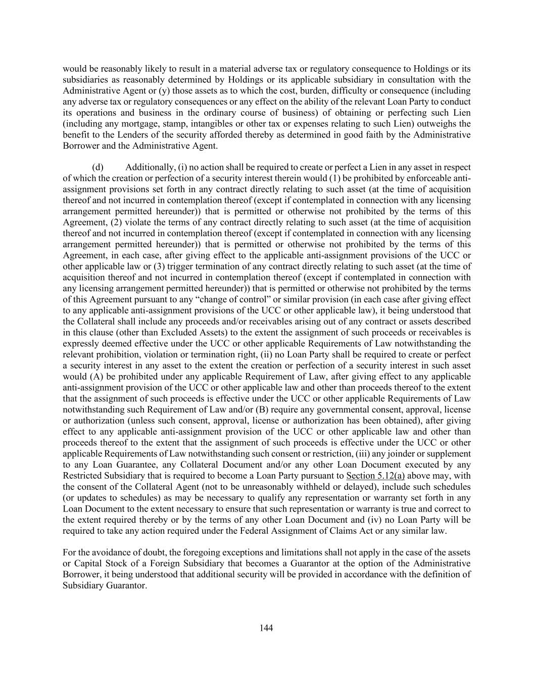 144 would be reasonably likely to result in a material adverse tax or regulatory consequence to Holdings or its subsidiaries as reasonably determined by Holdings or its applicable subsidiary in consultation with the Administrative Agent or (y) those assets as to which the cost, burden, difficulty or consequence (including any adverse tax or regulatory consequences or any effect on the ability of the relevant Loan Party to conduct its operations and business in the ordinary course of business) of obtaining or perfecting such Lien (including any mortgage, stamp, intangibles or other tax or expenses relating to such Lien) outweighs the benefit to the Lenders of the security afforded thereby as determined in good faith by the Administrative Borrower and the Administrative Agent. (d) Additionally, (i) no action shall be required to create or perfect a Lien in any asset in respect of which the creation or perfection of a security interest therein would (1) be prohibited by enforceable anti- assignment provisions set forth in any contract directly relating to such asset (at the time of acquisition thereof and not incurred in contemplation thereof (except if contemplated in connection with any licensing arrangement permitted hereunder)) that is permitted or otherwise not prohibited by the terms of this Agreement, (2) violate the terms of any contract directly relating to such asset (at the time of acquisition thereof and not incurred in contemplation thereof (except if contemplated in connection with any licensing arrangement permitted hereunder)) that is permitted or otherwise not prohibited by the terms of this Agreement, in each case, after giving effect to the applicable anti-assignment provisions of the UCC or other applicable law or (3) trigger termination of any contract directly relating to such asset (at the time of acquisition thereof and not incurred in contemplation thereof (except if contemplated in connection with any licensing arrangement permitted hereunder)) that is permitted or otherwise not prohibited by the terms of this Agreement pursuant to any “change of control” or similar provision (in each case after giving effect to any applicable anti-assignment provisions of the UCC or other applicable law), it being understood that the Collateral shall include any proceeds and/or receivables arising out of any contract or assets described in this clause (other than Excluded Assets) to the extent the assignment of such proceeds or receivables is expressly deemed effective under the UCC or other applicable Requirements of Law notwithstanding the relevant prohibition, violation or termination right, (ii) no Loan Party shall be required to create or perfect a security interest in any asset to the extent the creation or perfection of a security interest in such asset would (A) be prohibited under any applicable Requirement of Law, after giving effect to any applicable anti-assignment provision of the UCC or other applicable law and other than proceeds thereof to the extent that the assignment of such proceeds is effective under the UCC or other applicable Requirements of Law notwithstanding such Requirement of Law and/or (B) require any governmental consent, approval, license or authorization (unless such consent, approval, license or authorization has been obtained), after giving effect to any applicable anti-assignment provision of the UCC or other applicable law and other than proceeds thereof to the extent that the assignment of such proceeds is effective under the UCC or other applicable Requirements of Law notwithstanding such consent or restriction, (iii) any joinder or supplement to any Loan Guarantee, any Collateral Document and/or any other Loan Document executed by any Restricted Subsidiary that is required to become a Loan Party pursuant to Section 5.12(a) above may, with the consent of the Collateral Agent (not to be unreasonably withheld or delayed), include such schedules (or updates to schedules) as may be necessary to qualify any representation or warranty set forth in any Loan Document to the extent necessary to ensure that such representation or warranty is true and correct to the extent required thereby or by the terms of any other Loan Document and (iv) no Loan Party will be required to take any action required under the Federal Assignment of Claims Act or any similar law. For the avoidance of doubt, the foregoing exceptions and limitations shall not apply in the case of the assets or Capital Stock of a Foreign Subsidiary that becomes a Guarantor at the option of the Administrative Borrower, it being understood that additional security will be provided in accordance with the definition of Subsidiary Guarantor.