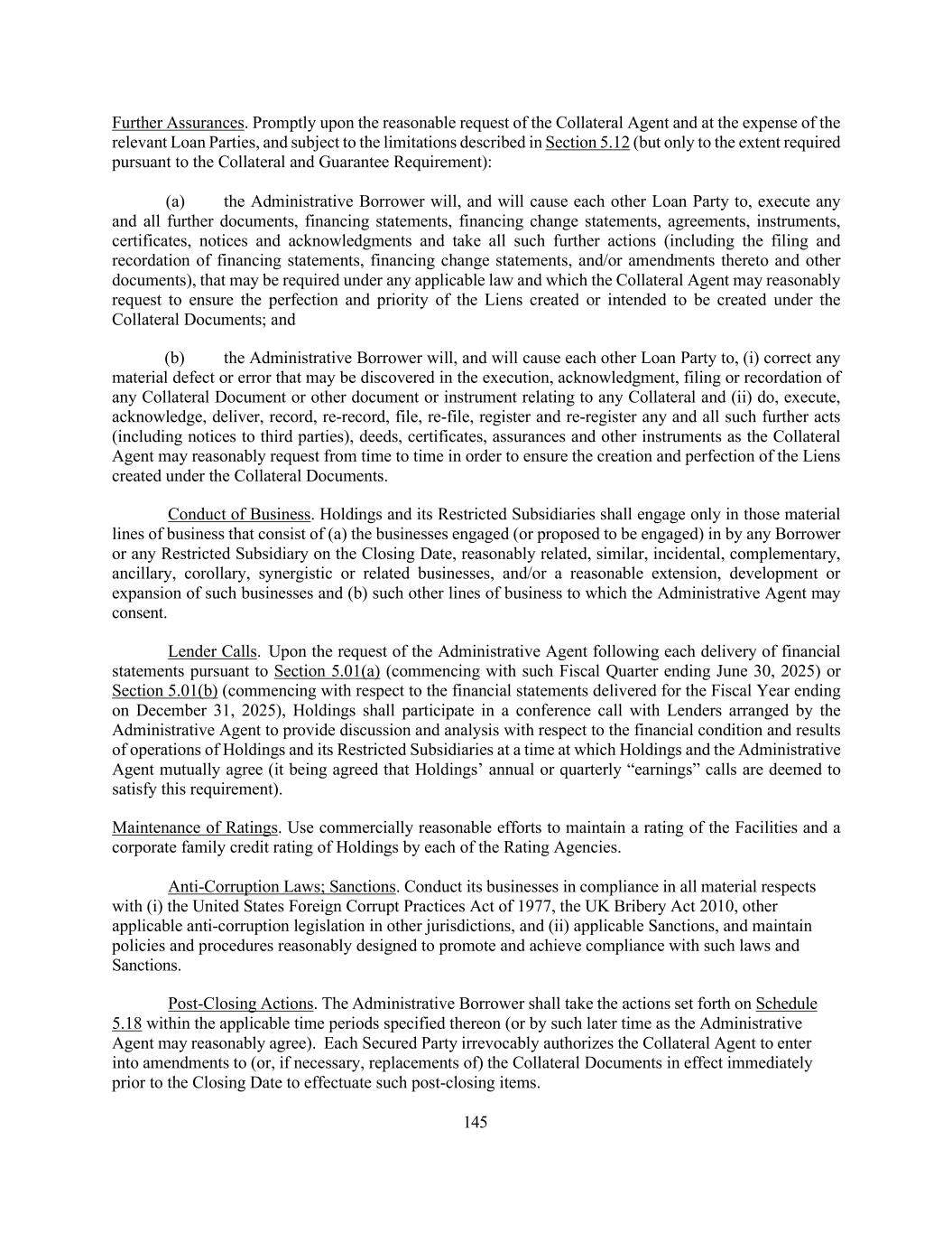 145 Further Assurances. Promptly upon the reasonable request of the Collateral Agent and at the expense of the relevant Loan Parties, and subject to the limitations described in Section 5.12 (but only to the extent required pursuant to the Collateral and Guarantee Requirement): (a) the Administrative Borrower will, and will cause each other Loan Party to, execute any and all further documents, financing statements, financing change statements, agreements, instruments, certificates, notices and acknowledgments and take all such further actions (including the filing and recordation of financing statements, financing change statements, and/or amendments thereto and other documents), that may be required under any applicable law and which the Collateral Agent may reasonably request to ensure the perfection and priority of the Liens created or intended to be created under the Collateral Documents; and (b) the Administrative Borrower will, and will cause each other Loan Party to, (i) correct any material defect or error that may be discovered in the execution, acknowledgment, filing or recordation of any Collateral Document or other document or instrument relating to any Collateral and (ii) do, execute, acknowledge, deliver, record, re-record, file, re-file, register and re-register any and all such further acts (including notices to third parties), deeds, certificates, assurances and other instruments as the Collateral Agent may reasonably request from time to time in order to ensure the creation and perfection of the Liens created under the Collateral Documents. Conduct of Business. Holdings and its Restricted Subsidiaries shall engage only in those material lines of business that consist of (a) the businesses engaged (or proposed to be engaged) in by any Borrower or any Restricted Subsidiary on the Closing Date, reasonably related, similar, incidental, complementary, ancillary, corollary, synergistic or related businesses, and/or a reasonable extension, development or expansion of such businesses and (b) such other lines of business to which the Administrative Agent may consent. Lender Calls. Upon the request of the Administrative Agent following each delivery of financial statements pursuant to Section 5.01(a) (commencing with such Fiscal Quarter ending June 30, 2025) or Section 5.01(b) (commencing with respect to the financial statements delivered for the Fiscal Year ending on December 31, 2025), Holdings shall participate in a conference call with Lenders arranged by the Administrative Agent to provide discussion and analysis with respect to the financial condition and results of operations of Holdings and its Restricted Subsidiaries at a time at which Holdings and the Administrative Agent mutually agree (it being agreed that Holdings’ annual or quarterly “earnings” calls are deemed to satisfy this requirement). Maintenance of Ratings. Use commercially reasonable efforts to maintain a rating of the Facilities and a corporate family credit rating of Holdings by each of the Rating Agencies. Anti-Corruption Laws; Sanctions. Conduct its businesses in compliance in all material respects with (i) the United States Foreign Corrupt Practices Act of 1977, the UK Bribery Act 2010, other applicable anti-corruption legislation in other jurisdictions, and (ii) applicable Sanctions, and maintain policies and procedures reasonably designed to promote and achieve compliance with such laws and Sanctions. Post-Closing Actions. The Administrative Borrower shall take the actions set forth on Schedule 5.18 within the applicable time periods specified thereon (or by such later time as the Administrative Agent may reasonably agree). Each Secured Party irrevocably authorizes the Collateral Agent to enter into amendments to (or, if necessary, replacements of) the Collateral Documents in effect immediately prior to the Closing Date to effectuate such post-closing items.