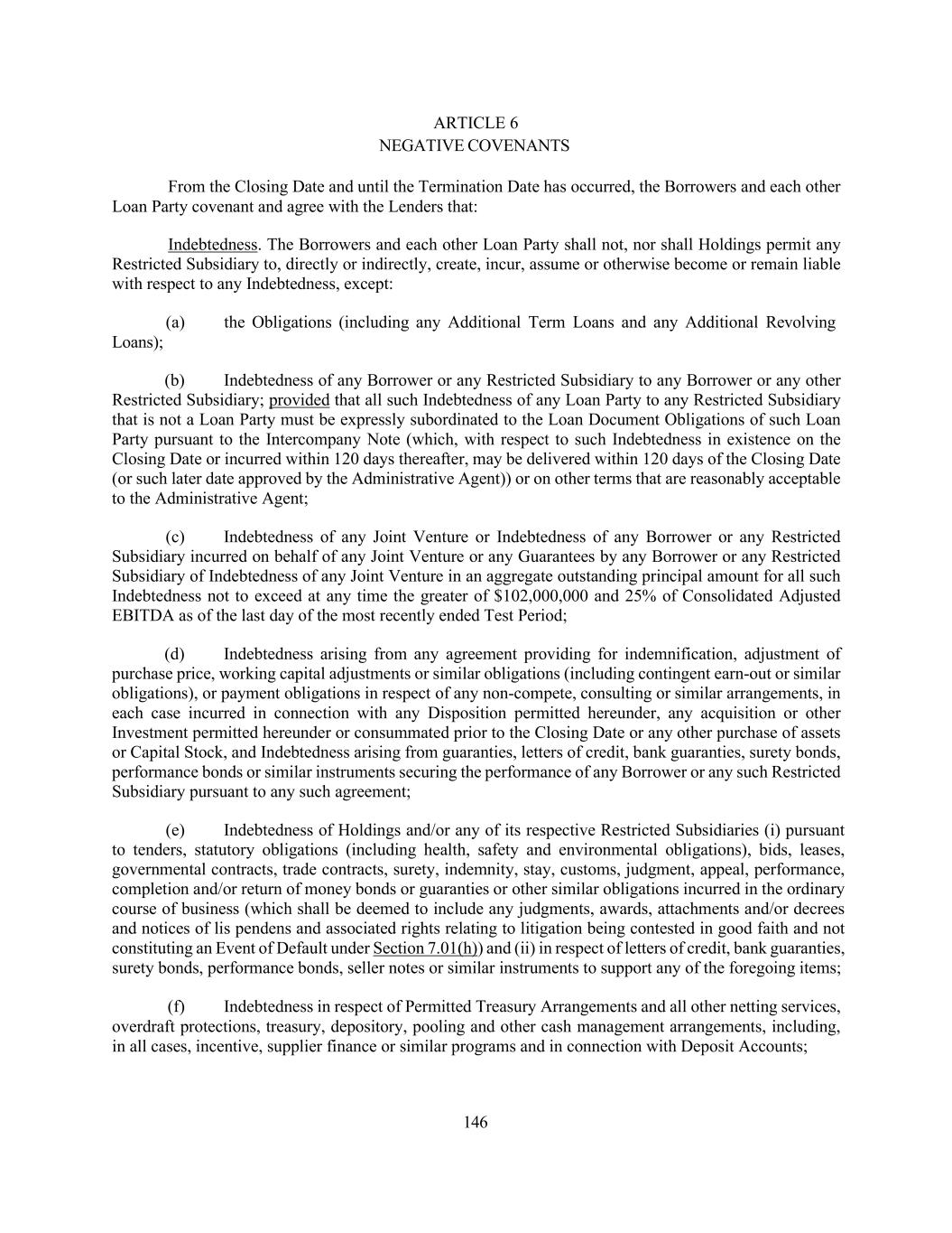 146 ARTICLE 6 NEGATIVE COVENANTS From the Closing Date and until the Termination Date has occurred, the Borrowers and each other Loan Party covenant and agree with the Lenders that: Indebtedness. The Borrowers and each other Loan Party shall not, nor shall Holdings permit any Restricted Subsidiary to, directly or indirectly, create, incur, assume or otherwise become or remain liable with respect to any Indebtedness, except: (a) the Obligations (including any Additional Term Loans and any Additional Revolving Loans); (b) Indebtedness of any Borrower or any Restricted Subsidiary to any Borrower or any other Restricted Subsidiary; provided that all such Indebtedness of any Loan Party to any Restricted Subsidiary that is not a Loan Party must be expressly subordinated to the Loan Document Obligations of such Loan Party pursuant to the Intercompany Note (which, with respect to such Indebtedness in existence on the Closing Date or incurred within 120 days thereafter, may be delivered within 120 days of the Closing Date (or such later date approved by the Administrative Agent)) or on other terms that are reasonably acceptable to the Administrative Agent; (c) Indebtedness of any Joint Venture or Indebtedness of any Borrower or any Restricted Subsidiary incurred on behalf of any Joint Venture or any Guarantees by any Borrower or any Restricted Subsidiary of Indebtedness of any Joint Venture in an aggregate outstanding principal amount for all such Indebtedness not to exceed at any time the greater of $102,000,000 and 25% of Consolidated Adjusted EBITDA as of the last day of the most recently ended Test Period; (d) Indebtedness arising from any agreement providing for indemnification, adjustment of purchase price, working capital adjustments or similar obligations (including contingent earn-out or similar obligations), or payment obligations in respect of any non-compete, consulting or similar arrangements, in each case incurred in connection with any Disposition permitted hereunder, any acquisition or other Investment permitted hereunder or consummated prior to the Closing Date or any other purchase of assets or Capital Stock, and Indebtedness arising from guaranties, letters of credit, bank guaranties, surety bonds, performance bonds or similar instruments securing the performance of any Borrower or any such Restricted Subsidiary pursuant to any such agreement; (e) Indebtedness of Holdings and/or any of its respective Restricted Subsidiaries (i) pursuant to tenders, statutory obligations (including health, safety and environmental obligations), bids, leases, governmental contracts, trade contracts, surety, indemnity, stay, customs, judgment, appeal, performance, completion and/or return of money bonds or guaranties or other similar obligations incurred in the ordinary course of business (which shall be deemed to include any judgments, awards, attachments and/or decrees and notices of lis pendens and associated rights relating to litigation being contested in good faith and not constituting an Event of Default under Section 7.01(h)) and (ii) in respect of letters of credit, bank guaranties, surety bonds, performance bonds, seller notes or similar instruments to support any of the foregoing items; (f) Indebtedness in respect of Permitted Treasury Arrangements and all other netting services, overdraft protections, treasury, depository, pooling and other cash management arrangements, including, in all cases, incentive, supplier finance or similar programs and in connection with Deposit Accounts;