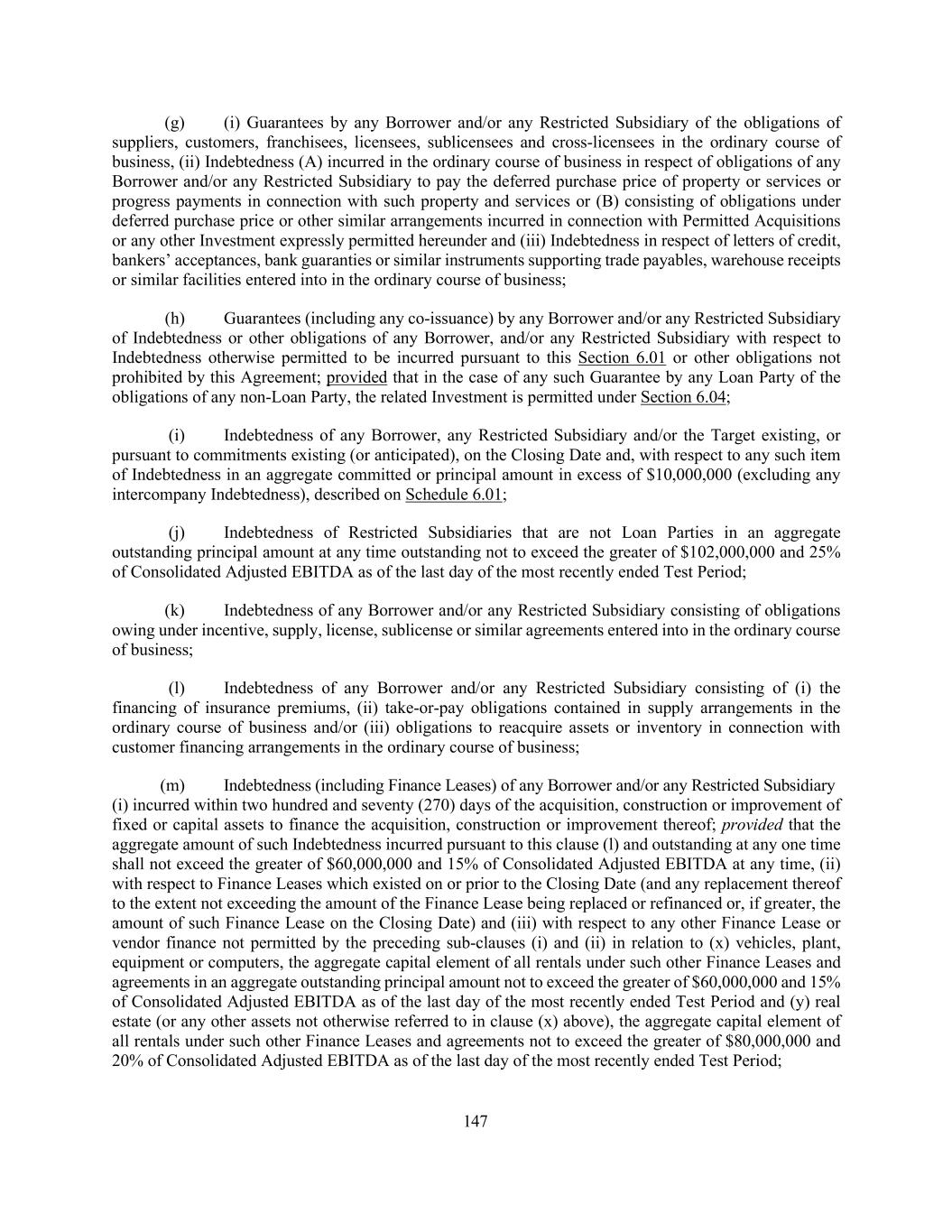 147 (g) (i) Guarantees by any Borrower and/or any Restricted Subsidiary of the obligations of suppliers, customers, franchisees, licensees, sublicensees and cross-licensees in the ordinary course of business, (ii) Indebtedness (A) incurred in the ordinary course of business in respect of obligations of any Borrower and/or any Restricted Subsidiary to pay the deferred purchase price of property or services or progress payments in connection with such property and services or (B) consisting of obligations under deferred purchase price or other similar arrangements incurred in connection with Permitted Acquisitions or any other Investment expressly permitted hereunder and (iii) Indebtedness in respect of letters of credit, bankers’ acceptances, bank guaranties or similar instruments supporting trade payables, warehouse receipts or similar facilities entered into in the ordinary course of business; (h) Guarantees (including any co-issuance) by any Borrower and/or any Restricted Subsidiary of Indebtedness or other obligations of any Borrower, and/or any Restricted Subsidiary with respect to Indebtedness otherwise permitted to be incurred pursuant to this Section 6.01 or other obligations not prohibited by this Agreement; provided that in the case of any such Guarantee by any Loan Party of the obligations of any non-Loan Party, the related Investment is permitted under Section 6.04; (i) Indebtedness of any Borrower, any Restricted Subsidiary and/or the Target existing, or pursuant to commitments existing (or anticipated), on the Closing Date and, with respect to any such item of Indebtedness in an aggregate committed or principal amount in excess of $10,000,000 (excluding any intercompany Indebtedness), described on Schedule 6.01; (j) Indebtedness of Restricted Subsidiaries that are not Loan Parties in an aggregate outstanding principal amount at any time outstanding not to exceed the greater of $102,000,000 and 25% of Consolidated Adjusted EBITDA as of the last day of the most recently ended Test Period; (k) Indebtedness of any Borrower and/or any Restricted Subsidiary consisting of obligations owing under incentive, supply, license, sublicense or similar agreements entered into in the ordinary course of business; (l) Indebtedness of any Borrower and/or any Restricted Subsidiary consisting of (i) the financing of insurance premiums, (ii) take-or-pay obligations contained in supply arrangements in the ordinary course of business and/or (iii) obligations to reacquire assets or inventory in connection with customer financing arrangements in the ordinary course of business; (m) Indebtedness (including Finance Leases) of any Borrower and/or any Restricted Subsidiary (i) incurred within two hundred and seventy (270) days of the acquisition, construction or improvement of fixed or capital assets to finance the acquisition, construction or improvement thereof; provided that the aggregate amount of such Indebtedness incurred pursuant to this clause (l) and outstanding at any one time shall not exceed the greater of $60,000,000 and 15% of Consolidated Adjusted EBITDA at any time, (ii) with respect to Finance Leases which existed on or prior to the Closing Date (and any replacement thereof to the extent not exceeding the amount of the Finance Lease being replaced or refinanced or, if greater, the amount of such Finance Lease on the Closing Date) and (iii) with respect to any other Finance Lease or vendor finance not permitted by the preceding sub-clauses (i) and (ii) in relation to (x) vehicles, plant, equipment or computers, the aggregate capital element of all rentals under such other Finance Leases and agreements in an aggregate outstanding principal amount not to exceed the greater of $60,000,000 and 15% of Consolidated Adjusted EBITDA as of the last day of the most recently ended Test Period and (y) real estate (or any other assets not otherwise referred to in clause (x) above), the aggregate capital element of all rentals under such other Finance Leases and agreements not to exceed the greater of $80,000,000 and 20% of Consolidated Adjusted EBITDA as of the last day of the most recently ended Test Period;