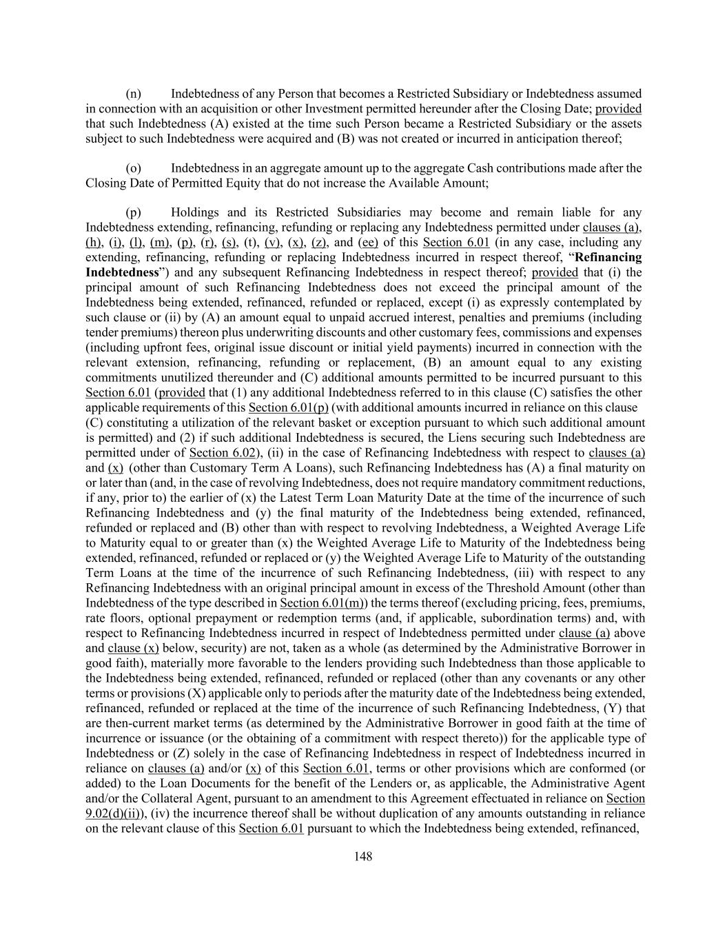 148 (n) Indebtedness of any Person that becomes a Restricted Subsidiary or Indebtedness assumed in connection with an acquisition or other Investment permitted hereunder after the Closing Date; provided that such Indebtedness (A) existed at the time such Person became a Restricted Subsidiary or the assets subject to such Indebtedness were acquired and (B) was not created or incurred in anticipation thereof; (o) Indebtedness in an aggregate amount up to the aggregate Cash contributions made after the Closing Date of Permitted Equity that do not increase the Available Amount; (p) Holdings and its Restricted Subsidiaries may become and remain liable for any Indebtedness extending, refinancing, refunding or replacing any Indebtedness permitted under clauses (a), (h), (i), (l), (m), (p), (r), (s), (t), (v), (x), (z), and (ee) of this Section 6.01 (in any case, including any extending, refinancing, refunding or replacing Indebtedness incurred in respect thereof, “Refinancing Indebtedness”) and any subsequent Refinancing Indebtedness in respect thereof; provided that (i) the principal amount of such Refinancing Indebtedness does not exceed the principal amount of the Indebtedness being extended, refinanced, refunded or replaced, except (i) as expressly contemplated by such clause or (ii) by (A) an amount equal to unpaid accrued interest, penalties and premiums (including tender premiums) thereon plus underwriting discounts and other customary fees, commissions and expenses (including upfront fees, original issue discount or initial yield payments) incurred in connection with the relevant extension, refinancing, refunding or replacement, (B) an amount equal to any existing commitments unutilized thereunder and (C) additional amounts permitted to be incurred pursuant to this Section 6.01 (provided that (1) any additional Indebtedness referred to in this clause (C) satisfies the other applicable requirements of this Section 6.01(p) (with additional amounts incurred in reliance on this clause (C) constituting a utilization of the relevant basket or exception pursuant to which such additional amount is permitted) and (2) if such additional Indebtedness is secured, the Liens securing such Indebtedness are permitted under of Section 6.02), (ii) in the case of Refinancing Indebtedness with respect to clauses (a) and (x) (other than Customary Term A Loans), such Refinancing Indebtedness has (A) a final maturity on or later than (and, in the case of revolving Indebtedness, does not require mandatory commitment reductions, if any, prior to) the earlier of (x) the Latest Term Loan Maturity Date at the time of the incurrence of such Refinancing Indebtedness and (y) the final maturity of the Indebtedness being extended, refinanced, refunded or replaced and (B) other than with respect to revolving Indebtedness, a Weighted Average Life to Maturity equal to or greater than (x) the Weighted Average Life to Maturity of the Indebtedness being extended, refinanced, refunded or replaced or (y) the Weighted Average Life to Maturity of the outstanding Term Loans at the time of the incurrence of such Refinancing Indebtedness, (iii) with respect to any Refinancing Indebtedness with an original principal amount in excess of the Threshold Amount (other than Indebtedness of the type described in Section 6.01(m)) the terms thereof (excluding pricing, fees, premiums, rate floors, optional prepayment or redemption terms (and, if applicable, subordination terms) and, with respect to Refinancing Indebtedness incurred in respect of Indebtedness permitted under clause (a) above and clause (x) below, security) are not, taken as a whole (as determined by the Administrative Borrower in good faith), materially more favorable to the lenders providing such Indebtedness than those applicable to the Indebtedness being extended, refinanced, refunded or replaced (other than any covenants or any other terms or provisions (X) applicable only to periods after the maturity date of the Indebtedness being extended, refinanced, refunded or replaced at the time of the incurrence of such Refinancing Indebtedness, (Y) that are then-current market terms (as determined by the Administrative Borrower in good faith at the time of incurrence or issuance (or the obtaining of a commitment with respect thereto)) for the applicable type of Indebtedness or (Z) solely in the case of Refinancing Indebtedness in respect of Indebtedness incurred in reliance on clauses (a) and/or (x) of this Section 6.01, terms or other provisions which are conformed (or added) to the Loan Documents for the benefit of the Lenders or, as applicable, the Administrative Agent and/or the Collateral Agent, pursuant to an amendment to this Agreement effectuated in reliance on Section 9.02(d)(ii)), (iv) the incurrence thereof shall be without duplication of any amounts outstanding in reliance on the relevant clause of this Section 6.01 pursuant to which the Indebtedness being extended, refinanced,