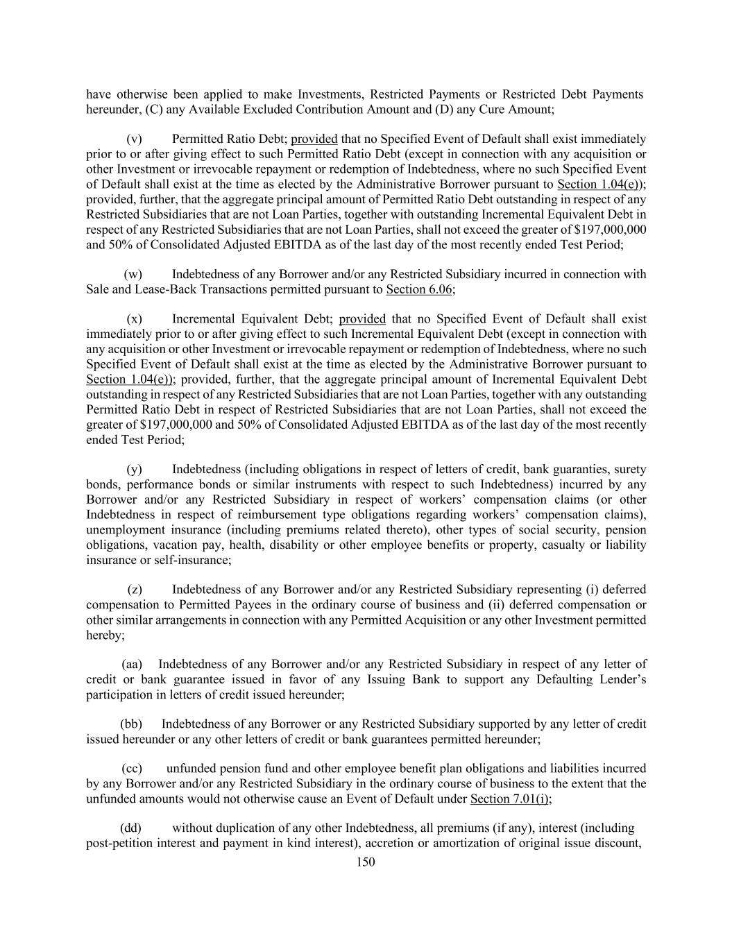 150 have otherwise been applied to make Investments, Restricted Payments or Restricted Debt Payments hereunder, (C) any Available Excluded Contribution Amount and (D) any Cure Amount; (v) Permitted Ratio Debt; provided that no Specified Event of Default shall exist immediately prior to or after giving effect to such Permitted Ratio Debt (except in connection with any acquisition or other Investment or irrevocable repayment or redemption of Indebtedness, where no such Specified Event of Default shall exist at the time as elected by the Administrative Borrower pursuant to Section 1.04(e)); provided, further, that the aggregate principal amount of Permitted Ratio Debt outstanding in respect of any Restricted Subsidiaries that are not Loan Parties, together with outstanding Incremental Equivalent Debt in respect of any Restricted Subsidiaries that are not Loan Parties, shall not exceed the greater of $197,000,000 and 50% of Consolidated Adjusted EBITDA as of the last day of the most recently ended Test Period; (w) Indebtedness of any Borrower and/or any Restricted Subsidiary incurred in connection with Sale and Lease-Back Transactions permitted pursuant to Section 6.06; (x) Incremental Equivalent Debt; provided that no Specified Event of Default shall exist immediately prior to or after giving effect to such Incremental Equivalent Debt (except in connection with any acquisition or other Investment or irrevocable repayment or redemption of Indebtedness, where no such Specified Event of Default shall exist at the time as elected by the Administrative Borrower pursuant to Section 1.04(e)); provided, further, that the aggregate principal amount of Incremental Equivalent Debt outstanding in respect of any Restricted Subsidiaries that are not Loan Parties, together with any outstanding Permitted Ratio Debt in respect of Restricted Subsidiaries that are not Loan Parties, shall not exceed the greater of $197,000,000 and 50% of Consolidated Adjusted EBITDA as of the last day of the most recently ended Test Period; (y) Indebtedness (including obligations in respect of letters of credit, bank guaranties, surety bonds, performance bonds or similar instruments with respect to such Indebtedness) incurred by any Borrower and/or any Restricted Subsidiary in respect of workers’ compensation claims (or other Indebtedness in respect of reimbursement type obligations regarding workers’ compensation claims), unemployment insurance (including premiums related thereto), other types of social security, pension obligations, vacation pay, health, disability or other employee benefits or property, casualty or liability insurance or self-insurance; (z) Indebtedness of any Borrower and/or any Restricted Subsidiary representing (i) deferred compensation to Permitted Payees in the ordinary course of business and (ii) deferred compensation or other similar arrangements in connection with any Permitted Acquisition or any other Investment permitted hereby; (aa) Indebtedness of any Borrower and/or any Restricted Subsidiary in respect of any letter of credit or bank guarantee issued in favor of any Issuing Bank to support any Defaulting Lender’s participation in letters of credit issued hereunder; (bb) Indebtedness of any Borrower or any Restricted Subsidiary supported by any letter of credit issued hereunder or any other letters of credit or bank guarantees permitted hereunder; (cc) unfunded pension fund and other employee benefit plan obligations and liabilities incurred by any Borrower and/or any Restricted Subsidiary in the ordinary course of business to the extent that the unfunded amounts would not otherwise cause an Event of Default under Section 7.01(i); (dd) without duplication of any other Indebtedness, all premiums (if any), interest (including post-petition interest and payment in kind interest), accretion or amortization of original issue discount,