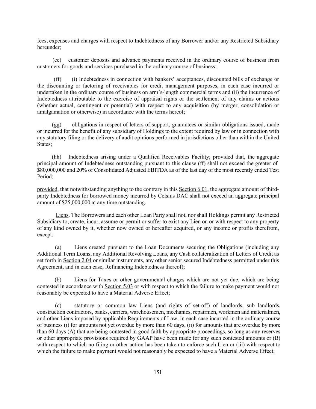 151 fees, expenses and charges with respect to Indebtedness of any Borrower and/or any Restricted Subsidiary hereunder; (ee) customer deposits and advance payments received in the ordinary course of business from customers for goods and services purchased in the ordinary course of business; (ff) (i) Indebtedness in connection with bankers’ acceptances, discounted bills of exchange or the discounting or factoring of receivables for credit management purposes, in each case incurred or undertaken in the ordinary course of business on arm’s-length commercial terms and (ii) the incurrence of Indebtedness attributable to the exercise of appraisal rights or the settlement of any claims or actions (whether actual, contingent or potential) with respect to any acquisition (by merger, consolidation or amalgamation or otherwise) in accordance with the terms hereof; (gg) obligations in respect of letters of support, guarantees or similar obligations issued, made or incurred for the benefit of any subsidiary of Holdings to the extent required by law or in connection with any statutory filing or the delivery of audit opinions performed in jurisdictions other than within the United States; (hh) Indebtedness arising under a Qualified Receivables Facility; provided that, the aggregate principal amount of Indebtedness outstanding pursuant to this clause (ff) shall not exceed the greater of $80,000,000 and 20% of Consolidated Adjusted EBITDA as of the last day of the most recently ended Test Period; provided, that notwithstanding anything to the contrary in this Section 6.01, the aggregate amount of third- party Indebtedness for borrowed money incurred by Celsius DAC shall not exceed an aggregate principal amount of $25,000,000 at any time outstanding. Liens. The Borrowers and each other Loan Party shall not, nor shall Holdings permit any Restricted Subsidiary to, create, incur, assume or permit or suffer to exist any Lien on or with respect to any property of any kind owned by it, whether now owned or hereafter acquired, or any income or profits therefrom, except: (a) Liens created pursuant to the Loan Documents securing the Obligations (including any Additional Term Loans, any Additional Revolving Loans, any Cash collateralization of Letters of Credit as set forth in Section 2.04 or similar instruments, any other senior secured Indebtedness permitted under this Agreement, and in each case, Refinancing Indebtedness thereof); (b) Liens for Taxes or other governmental charges which are not yet due, which are being contested in accordance with Section 5.03 or with respect to which the failure to make payment would not reasonably be expected to have a Material Adverse Effect; (c) statutory or common law Liens (and rights of set-off) of landlords, sub landlords, construction contractors, banks, carriers, warehousemen, mechanics, repairmen, workmen and materialmen, and other Liens imposed by applicable Requirements of Law, in each case incurred in the ordinary course of business (i) for amounts not yet overdue by more than 60 days, (ii) for amounts that are overdue by more than 60 days (A) that are being contested in good faith by appropriate proceedings, so long as any reserves or other appropriate provisions required by GAAP have been made for any such contested amounts or (B) with respect to which no filing or other action has been taken to enforce such Lien or (iii) with respect to which the failure to make payment would not reasonably be expected to have a Material Adverse Effect;
