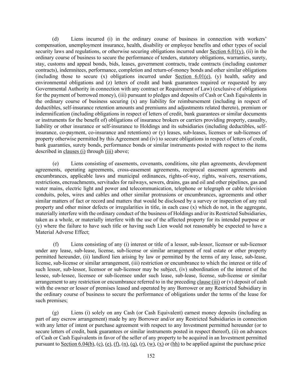152 (d) Liens incurred (i) in the ordinary course of business in connection with workers’ compensation, unemployment insurance, health, disability or employee benefits and other types of social security laws and regulations, or otherwise securing obligations incurred under Section 6.01(y), (ii) in the ordinary course of business to secure the performance of tenders, statutory obligations, warranties, surety, stay, customs and appeal bonds, bids, leases, government contracts, trade contracts (including customer contracts), indemnitees, performance, completion and return-of-money bonds and other similar obligations (including those to secure (x) obligations incurred under Section 6.01(e), (y) health, safety and environmental obligations and (z) letters of credit and bank guarantees required or requested by any Governmental Authority in connection with any contract or Requirement of Law) (exclusive of obligations for the payment of borrowed money), (iii) pursuant to pledges and deposits of Cash or Cash Equivalents in the ordinary course of business securing (x) any liability for reimbursement (including in respect of deductibles, self-insurance retention amounts and premiums and adjustments related thereto), premium or indemnification (including obligations in respect of letters of credit, bank guarantees or similar documents or instruments for the benefit of) obligations of insurance brokers or carriers providing property, casualty, liability or other insurance or self-insurance to Holdings and its subsidiaries (including deductibles, self- insurance, co-payment, co-insurance and retentions) or (y) leases, sub-leases, licenses or sub-licenses of property otherwise permitted by this Agreement and (iv) to secure obligations in respect of letters of credit, bank guaranties, surety bonds, performance bonds or similar instruments posted with respect to the items described in clauses (i) through (iii) above; (e) Liens consisting of easements, covenants, conditions, site plan agreements, development agreements, operating agreements, cross-easement agreements, reciprocal easement agreements and encumbrances, applicable laws and municipal ordinances, rights-of-way, rights, waivers, reservations, restrictions, encroachments, servitudes for railways, sewers, drains, gas and oil and other pipelines, gas and water mains, electric light and power and telecommunication, telephone or telegraph or cable television conduits, poles, wires and cables and other similar protrusions or encumbrances, agreements and other similar matters of fact or record and matters that would be disclosed by a survey or inspection of any real property and other minor defects or irregularities in title, in each case (x) which do not, in the aggregate, materially interfere with the ordinary conduct of the business of Holdings and/or its Restricted Subsidiaries, taken as a whole, or materially interfere with the use of the affected property for its intended purpose or (y) where the failure to have such title or having such Lien would not reasonably be expected to have a Material Adverse Effect; (f) Liens consisting of any (i) interest or title of a lessor, sub-lessor, licensor or sub-licensor under any lease, sub-lease, license, sub-license or similar arrangement of real estate or other property permitted hereunder, (ii) landlord lien arising by law or permitted by the terms of any lease, sub-lease, license, sub-license or similar arrangement, (iii) restriction or encumbrance to which the interest or title of such lessor, sub-lessor, licensor or sub-licensor may be subject, (iv) subordination of the interest of the lessee, sub-lessee, licensee or sub-licensee under such lease, sub-lease, license, sub-license or similar arrangement to any restriction or encumbrance referred to in the preceding clause (iii) or (v) deposit of cash with the owner or lessor of premises leased and operated by any Borrower or any Restricted Subsidiary in the ordinary course of business to secure the performance of obligations under the terms of the lease for such premises; (g) Liens (i) solely on any Cash (or Cash Equivalent) earnest money deposits (including as part of any escrow arrangement) made by any Borrower and/or any Restricted Subsidiaries in connection with any letter of intent or purchase agreement with respect to any Investment permitted hereunder (or to secure letters of credit, bank guarantees or similar instruments posted in respect thereof), (ii) on advances of Cash or Cash Equivalents in favor of the seller of any property to be acquired in an Investment permitted pursuant to Section 6.04(b), (c), (e), (f), (n), (q), (r), (w), (x) or (hh) to be applied against the purchase price