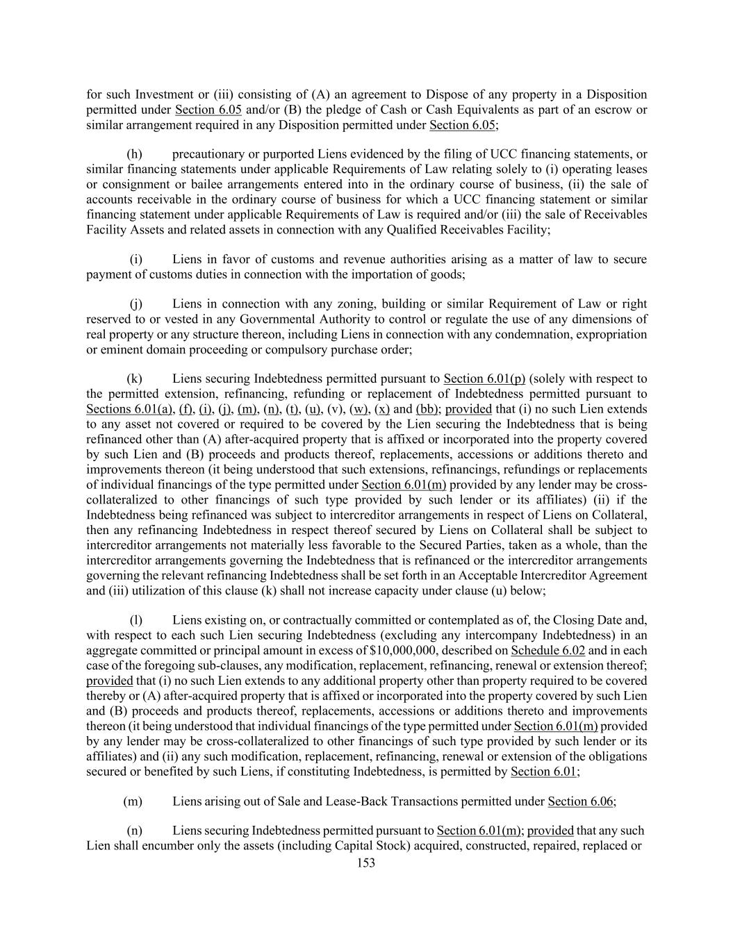 153 for such Investment or (iii) consisting of (A) an agreement to Dispose of any property in a Disposition permitted under Section 6.05 and/or (B) the pledge of Cash or Cash Equivalents as part of an escrow or similar arrangement required in any Disposition permitted under Section 6.05; (h) precautionary or purported Liens evidenced by the filing of UCC financing statements, or similar financing statements under applicable Requirements of Law relating solely to (i) operating leases or consignment or bailee arrangements entered into in the ordinary course of business, (ii) the sale of accounts receivable in the ordinary course of business for which a UCC financing statement or similar financing statement under applicable Requirements of Law is required and/or (iii) the sale of Receivables Facility Assets and related assets in connection with any Qualified Receivables Facility; (i) Liens in favor of customs and revenue authorities arising as a matter of law to secure payment of customs duties in connection with the importation of goods; (j) Liens in connection with any zoning, building or similar Requirement of Law or right reserved to or vested in any Governmental Authority to control or regulate the use of any dimensions of real property or any structure thereon, including Liens in connection with any condemnation, expropriation or eminent domain proceeding or compulsory purchase order; (k) Liens securing Indebtedness permitted pursuant to Section 6.01(p) (solely with respect to the permitted extension, refinancing, refunding or replacement of Indebtedness permitted pursuant to Sections 6.01(a), (f), (i), (j), (m), (n), (t), (u), (v), (w), (x) and (bb); provided that (i) no such Lien extends to any asset not covered or required to be covered by the Lien securing the Indebtedness that is being refinanced other than (A) after-acquired property that is affixed or incorporated into the property covered by such Lien and (B) proceeds and products thereof, replacements, accessions or additions thereto and improvements thereon (it being understood that such extensions, refinancings, refundings or replacements of individual financings of the type permitted under Section 6.01(m) provided by any lender may be cross- collateralized to other financings of such type provided by such lender or its affiliates) (ii) if the Indebtedness being refinanced was subject to intercreditor arrangements in respect of Liens on Collateral, then any refinancing Indebtedness in respect thereof secured by Liens on Collateral shall be subject to intercreditor arrangements not materially less favorable to the Secured Parties, taken as a whole, than the intercreditor arrangements governing the Indebtedness that is refinanced or the intercreditor arrangements governing the relevant refinancing Indebtedness shall be set forth in an Acceptable Intercreditor Agreement and (iii) utilization of this clause (k) shall not increase capacity under clause (u) below; (l) Liens existing on, or contractually committed or contemplated as of, the Closing Date and, with respect to each such Lien securing Indebtedness (excluding any intercompany Indebtedness) in an aggregate committed or principal amount in excess of $10,000,000, described on Schedule 6.02 and in each case of the foregoing sub-clauses, any modification, replacement, refinancing, renewal or extension thereof; provided that (i) no such Lien extends to any additional property other than property required to be covered thereby or (A) after-acquired property that is affixed or incorporated into the property covered by such Lien and (B) proceeds and products thereof, replacements, accessions or additions thereto and improvements thereon (it being understood that individual financings of the type permitted under Section 6.01(m) provided by any lender may be cross-collateralized to other financings of such type provided by such lender or its affiliates) and (ii) any such modification, replacement, refinancing, renewal or extension of the obligations secured or benefited by such Liens, if constituting Indebtedness, is permitted by Section 6.01; (m) Liens arising out of Sale and Lease-Back Transactions permitted under Section 6.06; (n) Liens securing Indebtedness permitted pursuant to Section 6.01(m); provided that any such Lien shall encumber only the assets (including Capital Stock) acquired, constructed, repaired, replaced or