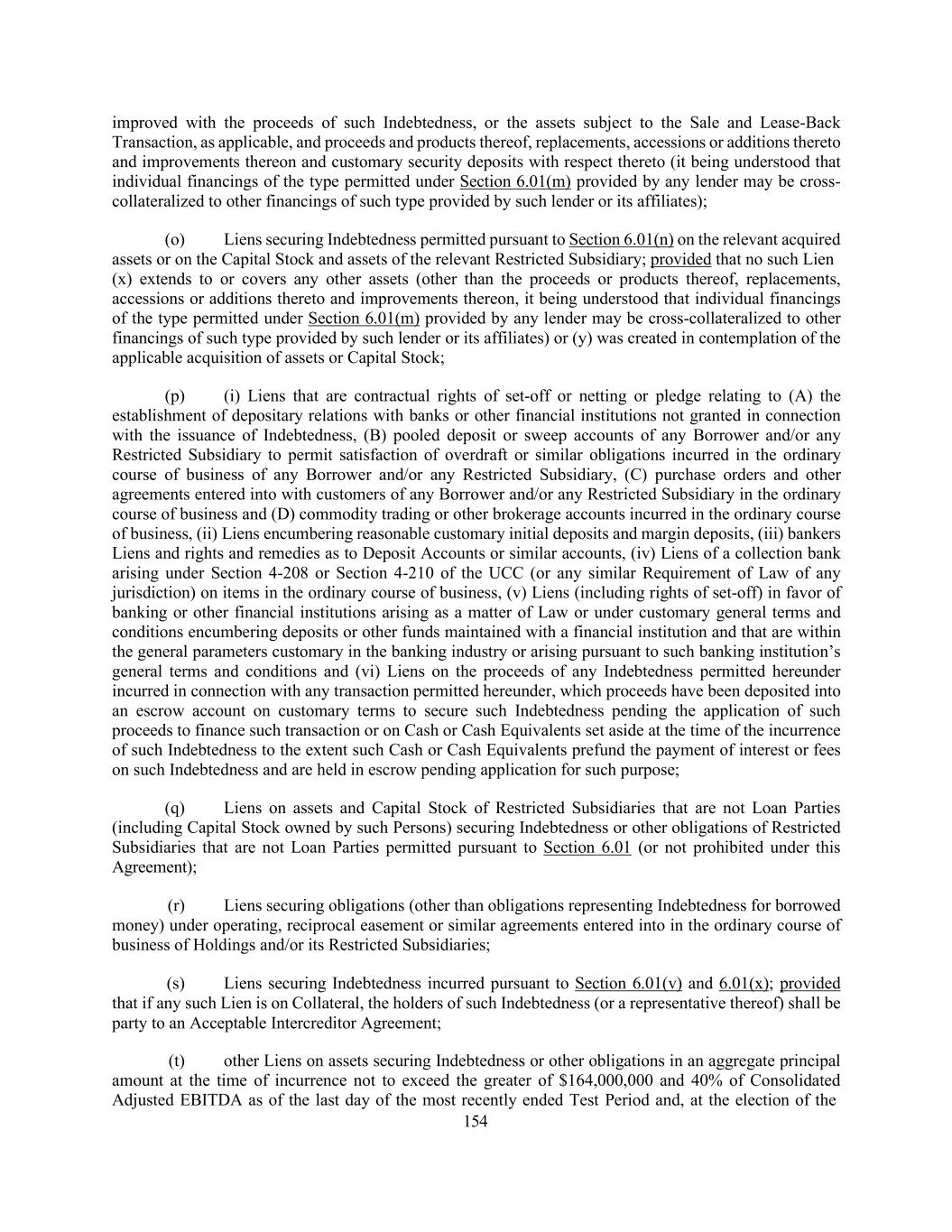154 improved with the proceeds of such Indebtedness, or the assets subject to the Sale and Lease-Back Transaction, as applicable, and proceeds and products thereof, replacements, accessions or additions thereto and improvements thereon and customary security deposits with respect thereto (it being understood that individual financings of the type permitted under Section 6.01(m) provided by any lender may be cross- collateralized to other financings of such type provided by such lender or its affiliates); (o) Liens securing Indebtedness permitted pursuant to Section 6.01(n) on the relevant acquired assets or on the Capital Stock and assets of the relevant Restricted Subsidiary; provided that no such Lien (x) extends to or covers any other assets (other than the proceeds or products thereof, replacements, accessions or additions thereto and improvements thereon, it being understood that individual financings of the type permitted under Section 6.01(m) provided by any lender may be cross-collateralized to other financings of such type provided by such lender or its affiliates) or (y) was created in contemplation of the applicable acquisition of assets or Capital Stock; (p) (i) Liens that are contractual rights of set-off or netting or pledge relating to (A) the establishment of depositary relations with banks or other financial institutions not granted in connection with the issuance of Indebtedness, (B) pooled deposit or sweep accounts of any Borrower and/or any Restricted Subsidiary to permit satisfaction of overdraft or similar obligations incurred in the ordinary course of business of any Borrower and/or any Restricted Subsidiary, (C) purchase orders and other agreements entered into with customers of any Borrower and/or any Restricted Subsidiary in the ordinary course of business and (D) commodity trading or other brokerage accounts incurred in the ordinary course of business, (ii) Liens encumbering reasonable customary initial deposits and margin deposits, (iii) bankers Liens and rights and remedies as to Deposit Accounts or similar accounts, (iv) Liens of a collection bank arising under Section 4-208 or Section 4-210 of the UCC (or any similar Requirement of Law of any jurisdiction) on items in the ordinary course of business, (v) Liens (including rights of set-off) in favor of banking or other financial institutions arising as a matter of Law or under customary general terms and conditions encumbering deposits or other funds maintained with a financial institution and that are within the general parameters customary in the banking industry or arising pursuant to such banking institution’s general terms and conditions and (vi) Liens on the proceeds of any Indebtedness permitted hereunder incurred in connection with any transaction permitted hereunder, which proceeds have been deposited into an escrow account on customary terms to secure such Indebtedness pending the application of such proceeds to finance such transaction or on Cash or Cash Equivalents set aside at the time of the incurrence of such Indebtedness to the extent such Cash or Cash Equivalents prefund the payment of interest or fees on such Indebtedness and are held in escrow pending application for such purpose; (q) Liens on assets and Capital Stock of Restricted Subsidiaries that are not Loan Parties (including Capital Stock owned by such Persons) securing Indebtedness or other obligations of Restricted Subsidiaries that are not Loan Parties permitted pursuant to Section 6.01 (or not prohibited under this Agreement); (r) Liens securing obligations (other than obligations representing Indebtedness for borrowed money) under operating, reciprocal easement or similar agreements entered into in the ordinary course of business of Holdings and/or its Restricted Subsidiaries; (s) Liens securing Indebtedness incurred pursuant to Section 6.01(v) and 6.01(x); provided that if any such Lien is on Collateral, the holders of such Indebtedness (or a representative thereof) shall be party to an Acceptable Intercreditor Agreement; (t) other Liens on assets securing Indebtedness or other obligations in an aggregate principal amount at the time of incurrence not to exceed the greater of $164,000,000 and 40% of Consolidated Adjusted EBITDA as of the last day of the most recently ended Test Period and, at the election of the