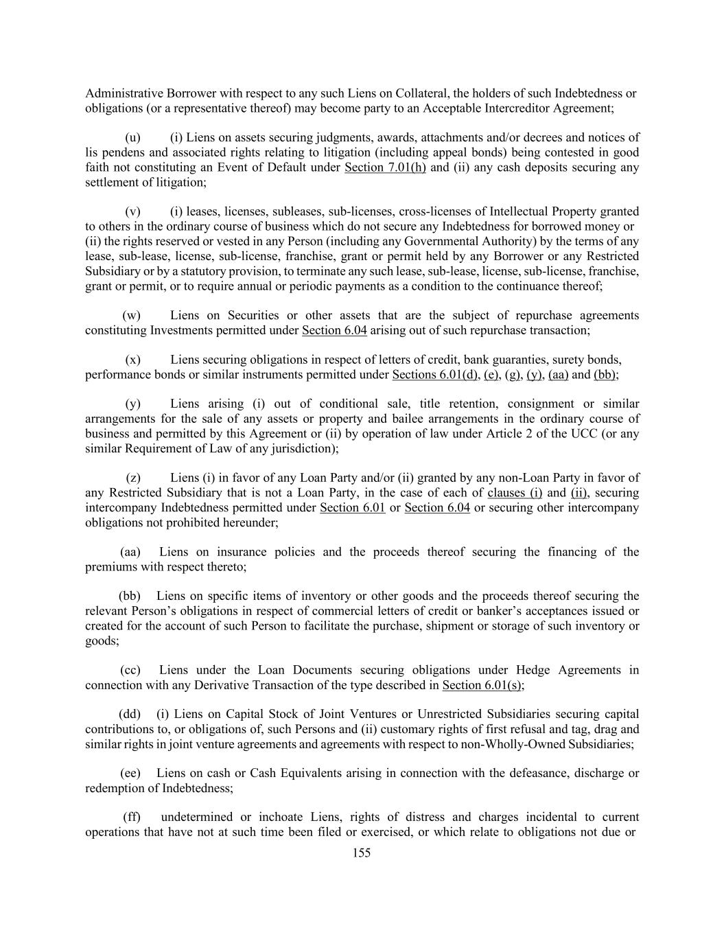 155 Administrative Borrower with respect to any such Liens on Collateral, the holders of such Indebtedness or obligations (or a representative thereof) may become party to an Acceptable Intercreditor Agreement; (u) (i) Liens on assets securing judgments, awards, attachments and/or decrees and notices of lis pendens and associated rights relating to litigation (including appeal bonds) being contested in good faith not constituting an Event of Default under Section 7.01(h) and (ii) any cash deposits securing any settlement of litigation; (v) (i) leases, licenses, subleases, sub-licenses, cross-licenses of Intellectual Property granted to others in the ordinary course of business which do not secure any Indebtedness for borrowed money or (ii) the rights reserved or vested in any Person (including any Governmental Authority) by the terms of any lease, sub-lease, license, sub-license, franchise, grant or permit held by any Borrower or any Restricted Subsidiary or by a statutory provision, to terminate any such lease, sub-lease, license, sub-license, franchise, grant or permit, or to require annual or periodic payments as a condition to the continuance thereof; (w) Liens on Securities or other assets that are the subject of repurchase agreements constituting Investments permitted under Section 6.04 arising out of such repurchase transaction; (x) Liens securing obligations in respect of letters of credit, bank guaranties, surety bonds, performance bonds or similar instruments permitted under Sections 6.01(d), (e), (g), (y), (aa) and (bb); (y) Liens arising (i) out of conditional sale, title retention, consignment or similar arrangements for the sale of any assets or property and bailee arrangements in the ordinary course of business and permitted by this Agreement or (ii) by operation of law under Article 2 of the UCC (or any similar Requirement of Law of any jurisdiction); (z) Liens (i) in favor of any Loan Party and/or (ii) granted by any non-Loan Party in favor of any Restricted Subsidiary that is not a Loan Party, in the case of each of clauses (i) and (ii), securing intercompany Indebtedness permitted under Section 6.01 or Section 6.04 or securing other intercompany obligations not prohibited hereunder; (aa) Liens on insurance policies and the proceeds thereof securing the financing of the premiums with respect thereto; (bb) Liens on specific items of inventory or other goods and the proceeds thereof securing the relevant Person’s obligations in respect of commercial letters of credit or banker’s acceptances issued or created for the account of such Person to facilitate the purchase, shipment or storage of such inventory or goods; (cc) Liens under the Loan Documents securing obligations under Hedge Agreements in connection with any Derivative Transaction of the type described in Section 6.01(s); (dd) (i) Liens on Capital Stock of Joint Ventures or Unrestricted Subsidiaries securing capital contributions to, or obligations of, such Persons and (ii) customary rights of first refusal and tag, drag and similar rights in joint venture agreements and agreements with respect to non-Wholly-Owned Subsidiaries; (ee) Liens on cash or Cash Equivalents arising in connection with the defeasance, discharge or redemption of Indebtedness; (ff) undetermined or inchoate Liens, rights of distress and charges incidental to current operations that have not at such time been filed or exercised, or which relate to obligations not due or