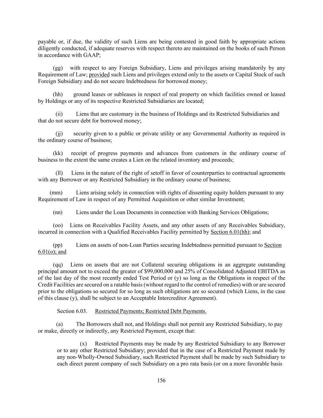 156 payable or, if due, the validity of such Liens are being contested in good faith by appropriate actions diligently conducted, if adequate reserves with respect thereto are maintained on the books of such Person in accordance with GAAP; (gg) with respect to any Foreign Subsidiary, Liens and privileges arising mandatorily by any Requirement of Law; provided such Liens and privileges extend only to the assets or Capital Stock of such Foreign Subsidiary and do not secure Indebtedness for borrowed money; (hh) ground leases or subleases in respect of real property on which facilities owned or leased by Holdings or any of its respective Restricted Subsidiaries are located; (ii) Liens that are customary in the business of Holdings and its Restricted Subsidiaries and that do not secure debt for borrowed money; (jj) security given to a public or private utility or any Governmental Authority as required in the ordinary course of business; (kk) receipt of progress payments and advances from customers in the ordinary course of business to the extent the same creates a Lien on the related inventory and proceeds; (ll) Liens in the nature of the right of setoff in favor of counterparties to contractual agreements with any Borrower or any Restricted Subsidiary in the ordinary course of business; (mm) Liens arising solely in connection with rights of dissenting equity holders pursuant to any Requirement of Law in respect of any Permitted Acquisition or other similar Investment; (nn) Liens under the Loan Documents in connection with Banking Services Obligations; (oo) Liens on Receivables Facility Assets, and any other assets of any Receivables Subsidiary, incurred in connection with a Qualified Receivables Facility permitted by Section 6.01(hh); and (pp) Liens on assets of non-Loan Parties securing Indebtedness permitted pursuant to Section 6.01(o); and (qq) Liens on assets that are not Collateral securing obligations in an aggregate outstanding principal amount not to exceed the greater of $99,000,000 and 25% of Consolidated Adjusted EBITDA as of the last day of the most recently ended Test Period or (y) so long as the Obligations in respect of the Credit Facilities are secured on a ratable basis (without regard to the control of remedies) with or are secured prior to the obligations so secured for so long as such obligations are so secured (which Liens, in the case of this clause (y), shall be subject to an Acceptable Intercreditor Agreement). Section 6.03. Restricted Payments; Restricted Debt Payments. (a) The Borrowers shall not, and Holdings shall not permit any Restricted Subsidiary, to pay or make, directly or indirectly, any Restricted Payment, except that: (x) Restricted Payments may be made by any Restricted Subsidiary to any Borrower or to any other Restricted Subsidiary; provided that in the case of a Restricted Payment made by any non-Wholly-Owned Subsidiary, such Restricted Payment shall be made by such Subsidiary to each direct parent company of such Subsidiary on a pro rata basis (or on a more favorable basis